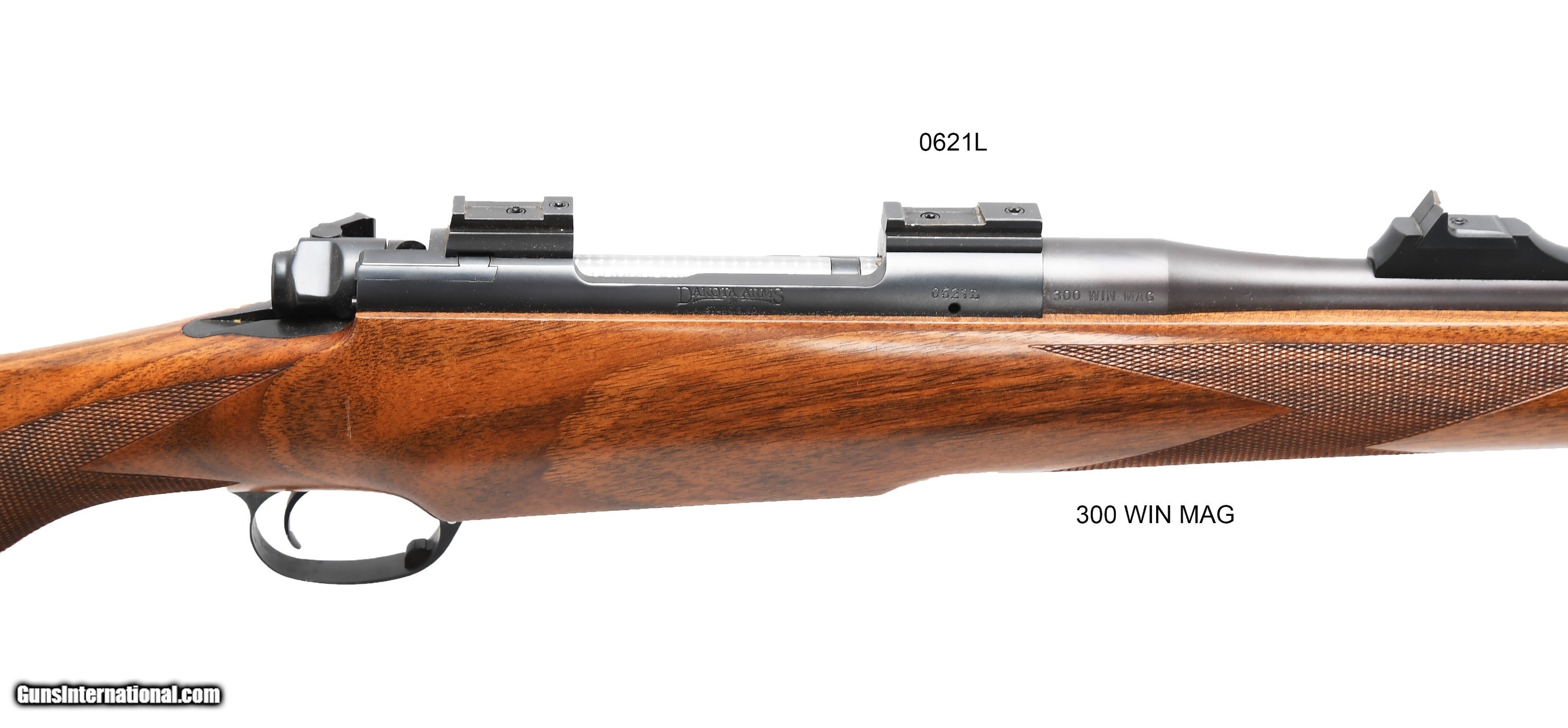 Description: Dakota model 76 Safari Left-Hand bolt action rifle chambered in .300 Win Mag. This rifle is a one owner that was used to hunt plains game in Africa one time then retired to the safe. Made just the way you would want to order it with a standing rear sight and front sight with bead and folding “night” sight on the 23” barrel; barrel band front sling swivel stud and inletted rear stud; select Walnut stock with Rosewood forearm tip, shadow line cheek piece and factory recoil pad making the LOP at 13 ½”. Also, jeweled bolt; safari stock design allowing an extra round in the magazine and Talley QR scope bases. Condition-wise this gun has been very well cared for, but it does show a few “rub” marks in the wood finish and a couple of barrel blue fade spots on the top about 3” ahead of the barrel band. These could have been from a gun rest while in Africa. Perfect bore and perfect operation. Weighs 8 lbs. 3 oz. without scope. SN: 0621L SOLD |