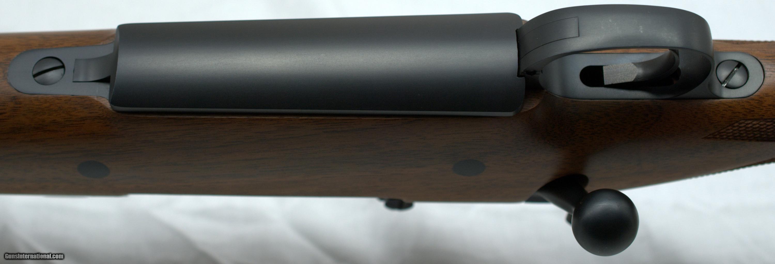 Description: DAKOTA AFRICAN GRADE 416 Rigby Cal 24″ heavy barrel with quarter rib ... LOA 44 3/4" ... LOP 13 1/4" ... DAH 1" ... DAC 1 1/2" ... Weight 8# 10oz ... Trigger 4# 2oz ... bead front sight ... two leaf rear sight mounted in rib ... Dakota scope mounts .... sling swivel studs ... Decelerator butt pad ... Bbl mounted sling swivel stud. SN R0133 A very nice Dakota rifle for the serious shooter. Barrel retains nearly all of matte blue finish. Sights are very good. Bore is bright with strong rifling. Receiver shows nearly all of matte blue finish with only minimal high point wear. Bolt handle shows nearly all matte blue finish. Bottom metal retains nearly all of matte blue finish with only a few slight scratches on trigger guard.. Stock is very fine with sharp checkering and very few mars or scratches. Ebony forend cap is fine. Buttpad is fine. Checkered pistol grip walnut stock with some fine figure at butt end. Dakota Arms cap on pistol grip with “DA” logo. Ebony forend cap. Call with any questions and see our other listings for ... "Only the best!" Buyer pays all shipping costs. SOLD |