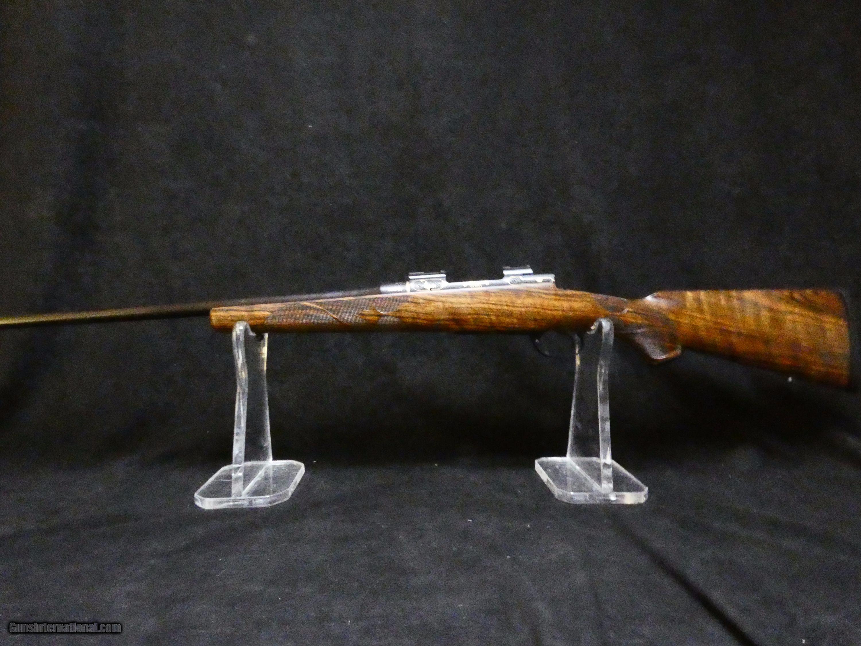 Description: This set of rifles were one by dakota Arms as a donation to Safari Club in about 2005. They were valued at that time at $50,000 for donation purposes and in reality replacement cost would not be that far off. They have matching serial #'s K2891 for the 7-08 K for Kurz or short i.e. short action and #2891 for 375 HH. Both rifles are fully engraved by Jere Davidson and he literally used feet of 24k gold wire. The youth rifle is the only youth rifle ever built on a 76 action. It has a 24K white tail deer on the floor plate and gold wire with 'paintbrush' ends from one end of the rifle to the other. It has a piece of special selection English Walnut that matches the 375. Its comes with engraved and gold wire Talley rings and a 1" Swarovski 3x9x36 scope. It has a gold inlayed pistol grip cap with the sci logo and has a 12 1/2 LOP with a thin pad. The barrel length is 22". The stock has a beautiful Fleur de lis & ribbon checkering pattern. The matching Dakota 76 in 375 HH has a standard 13 5/8 LOP and a matching piece of special selection English Walnut. The engraving and gold wire on the rifle matches the other with the exception of a stunning 24K gold lion on the floorplate. It has an island style rear sight and a banded hooded front sight. The engraving is continued on both pieces. The same Fleur de lis with ribbons checkering pattern is on this gun as well. It has a matching set of talley 30mm engraved rings and a Swarovski 30mm 1.5-6x42 dangerous game scope. Both rifles have fully engraved bolt shrouds checkered bolt knobs and jeweled bolts. These two rifles come in a fitted Don Walters welded aluminum travel case with the safari club international logo embroidered on the inside of the lid. This is a steal at $29,000 for the pair including case, scopes and accessories. SOLD Manufacturer: Dakota Arms |