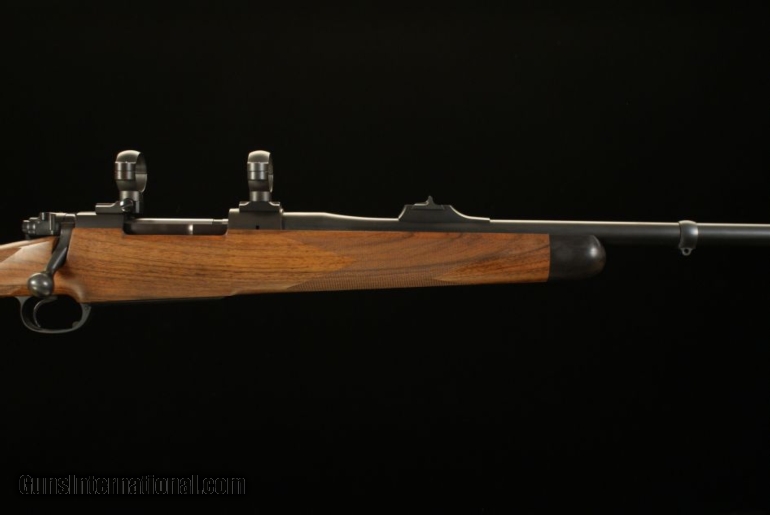 Description: Dakota Arms 76 Safari, .338 Win. Mag. , 23" ported barrel, 8 lbs. 6 oz., 13 5/8" LOP over a pad, express rear sight with ramp front sight, inletted rear swivel and barrel band front, drop box magazine for extra capacity, steel grip cap with Dakota logo, cheekpiece, with bases and rings, excellent condition rifle with just a couple of light handling marks. SOLD |