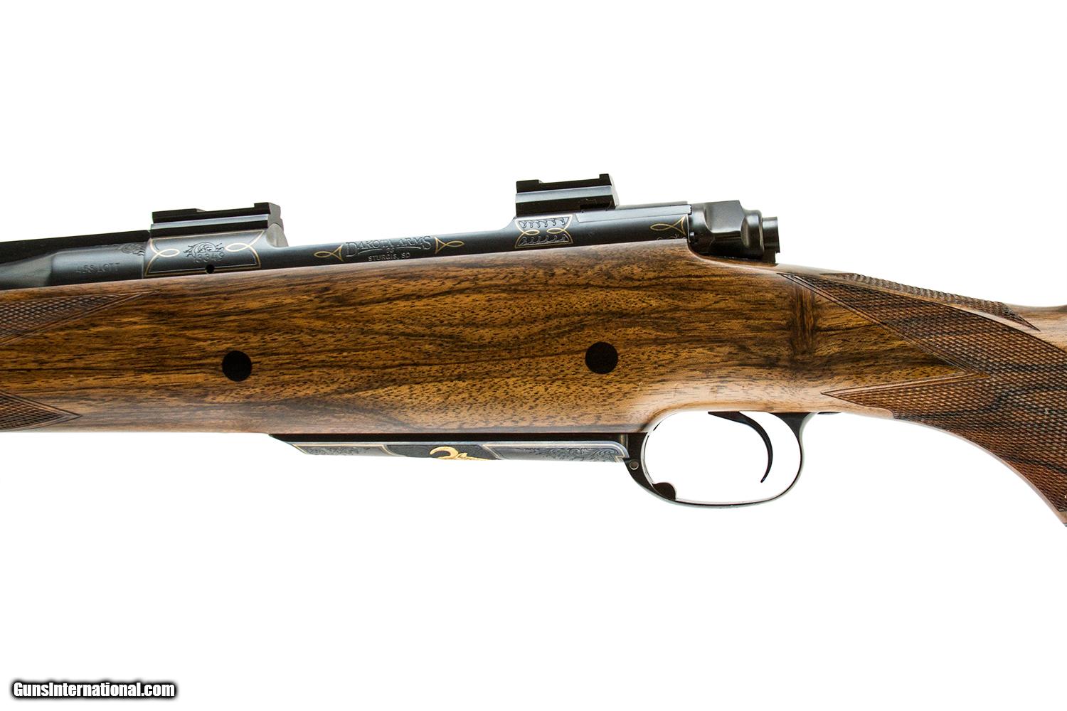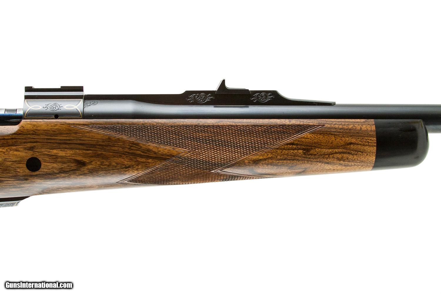 Description: FACTORY ENGRAVED 24" BARREL WITH ENGRAVED 1 BLADE 1/4 RIB AND A BANDED AND HOODED ENGRAVED FRONT SIGHT WITH TALLEY BASES 2 PANEL CHECKERED BOLT BARREL BAND SWIVEL INLETTED REAR EBONY TIP SHADOW CHEEK PIECE TEST FIRED ONLY9LBS 14 OZ X 13 1/2 LOP SOLD |