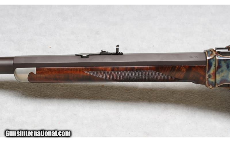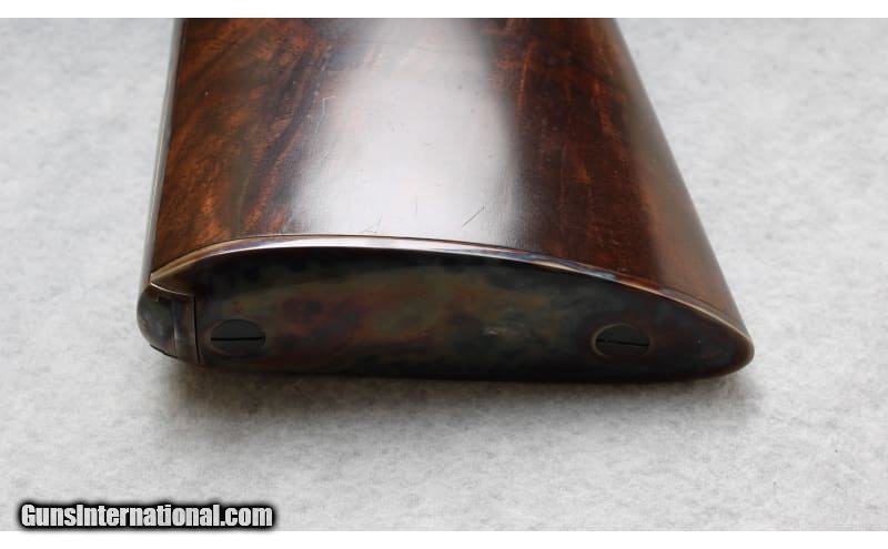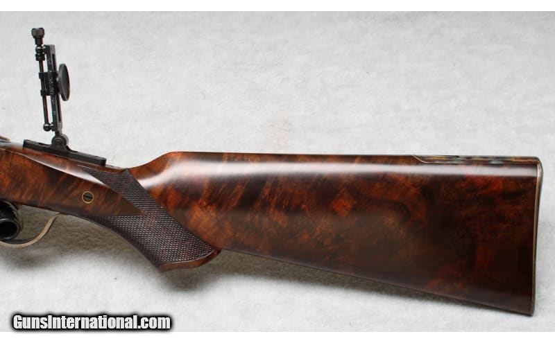 Description: Excellent condition, light wear and handling marks. Superbly crafted Sharps style rifle - 26" half octagon barrel, adjustable tang sight, bright case coloring on receiver, hammer, lever and smooth butt plate. Outstanding wood with fine checkering and silver forend cap. This classic rifle would be a prized addition to any collection. .38-55 Winchester SOLD Chambers: Single shot Metal Condition: Excellent Wood Condition: Excellent Bore Condition: Bright Barrels: 26 Triggers: Factory Stock Dimensions: 13 1/2" LOP Fore End: Checkered with metal cap Butt Pad: Metal butt plate Sights: Adjustable folding tang sight Item Location: La Vista, NE |