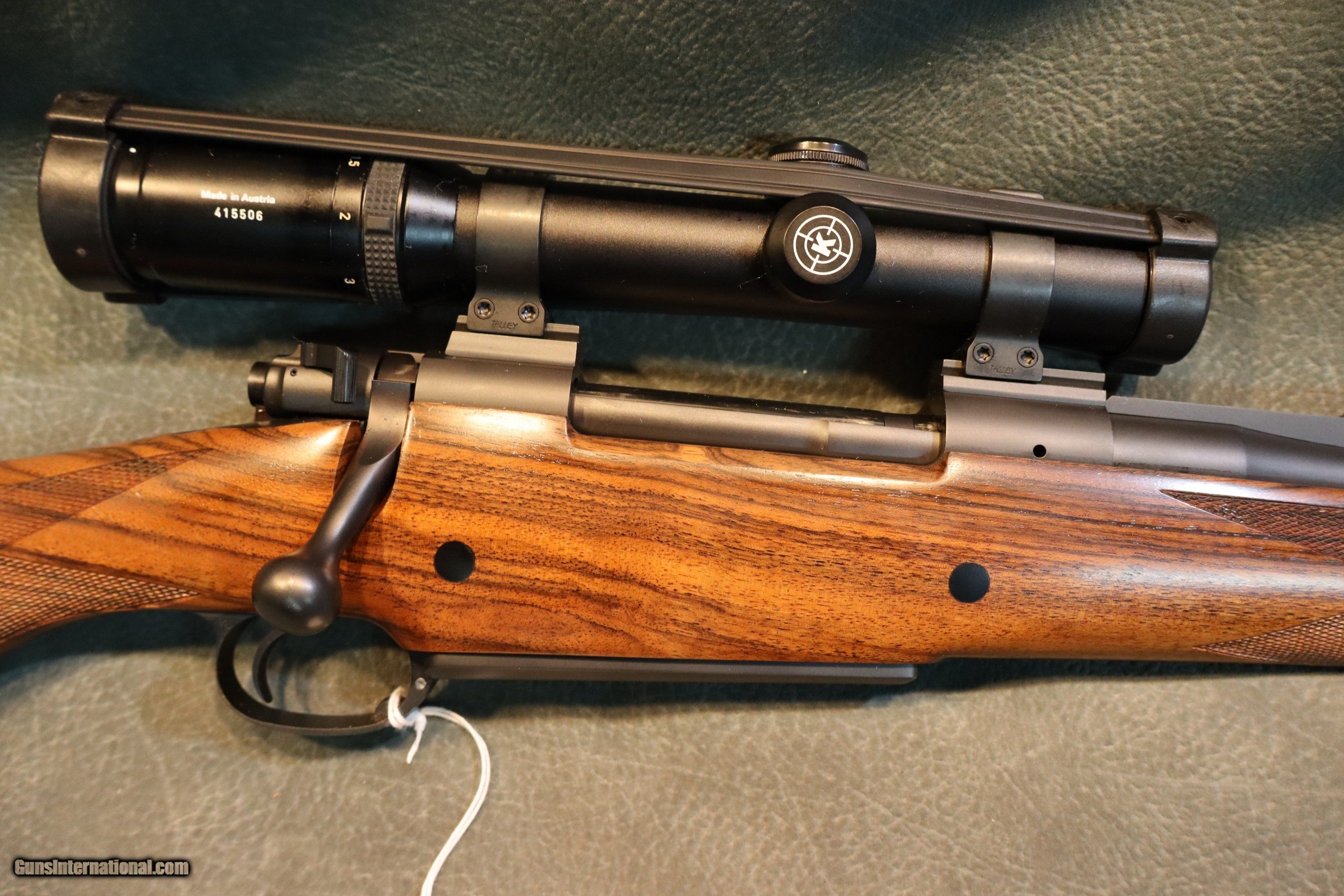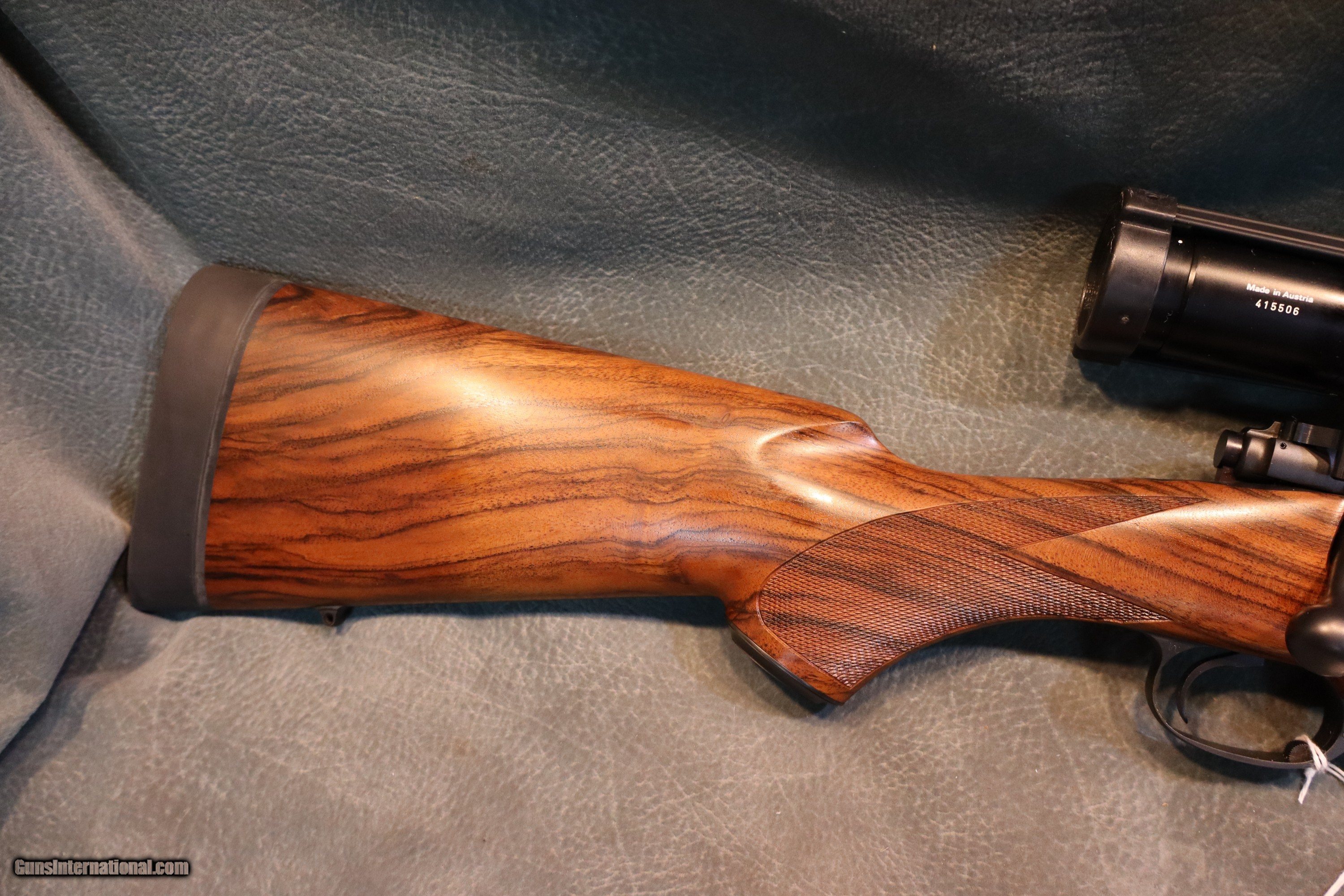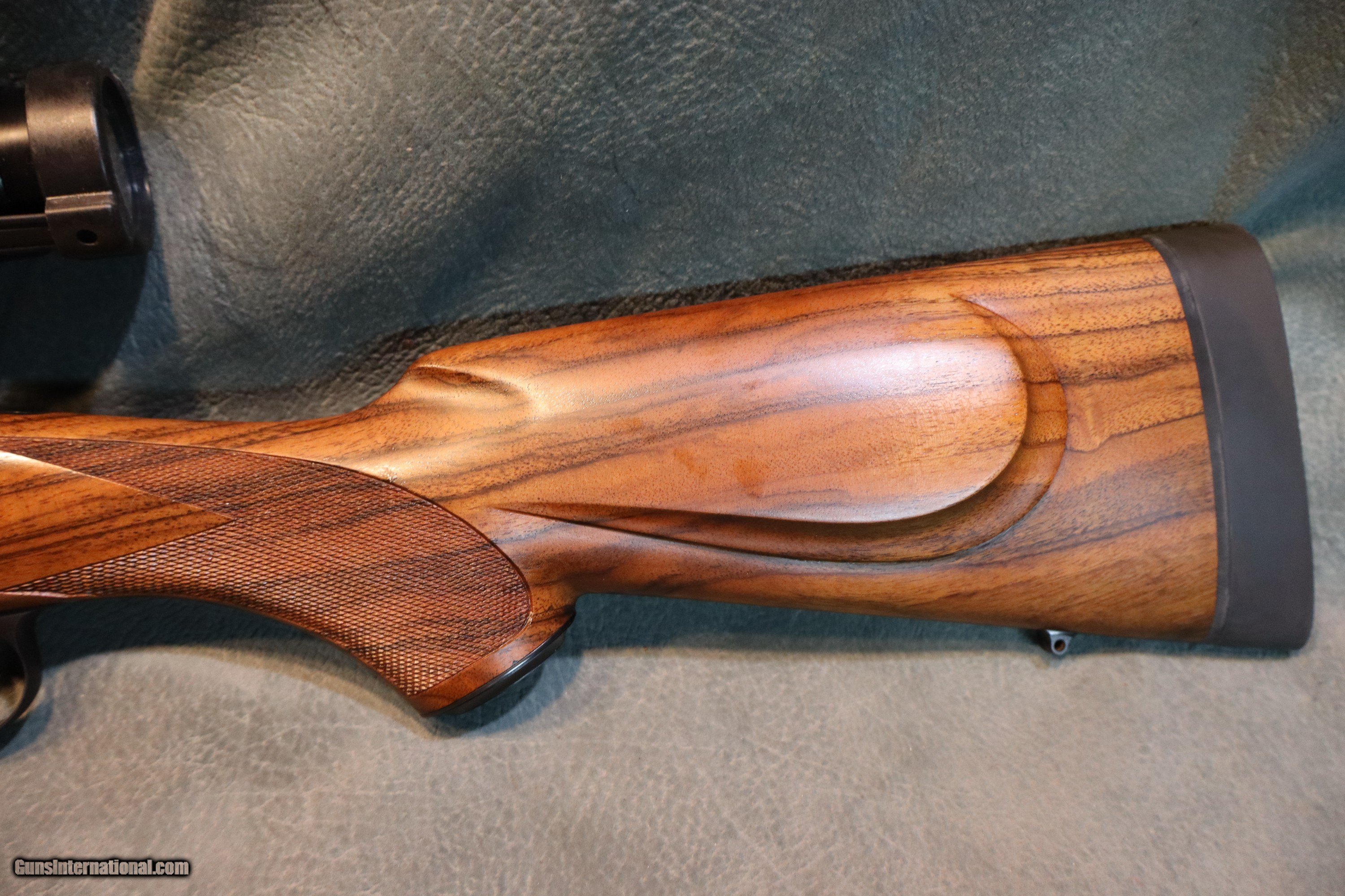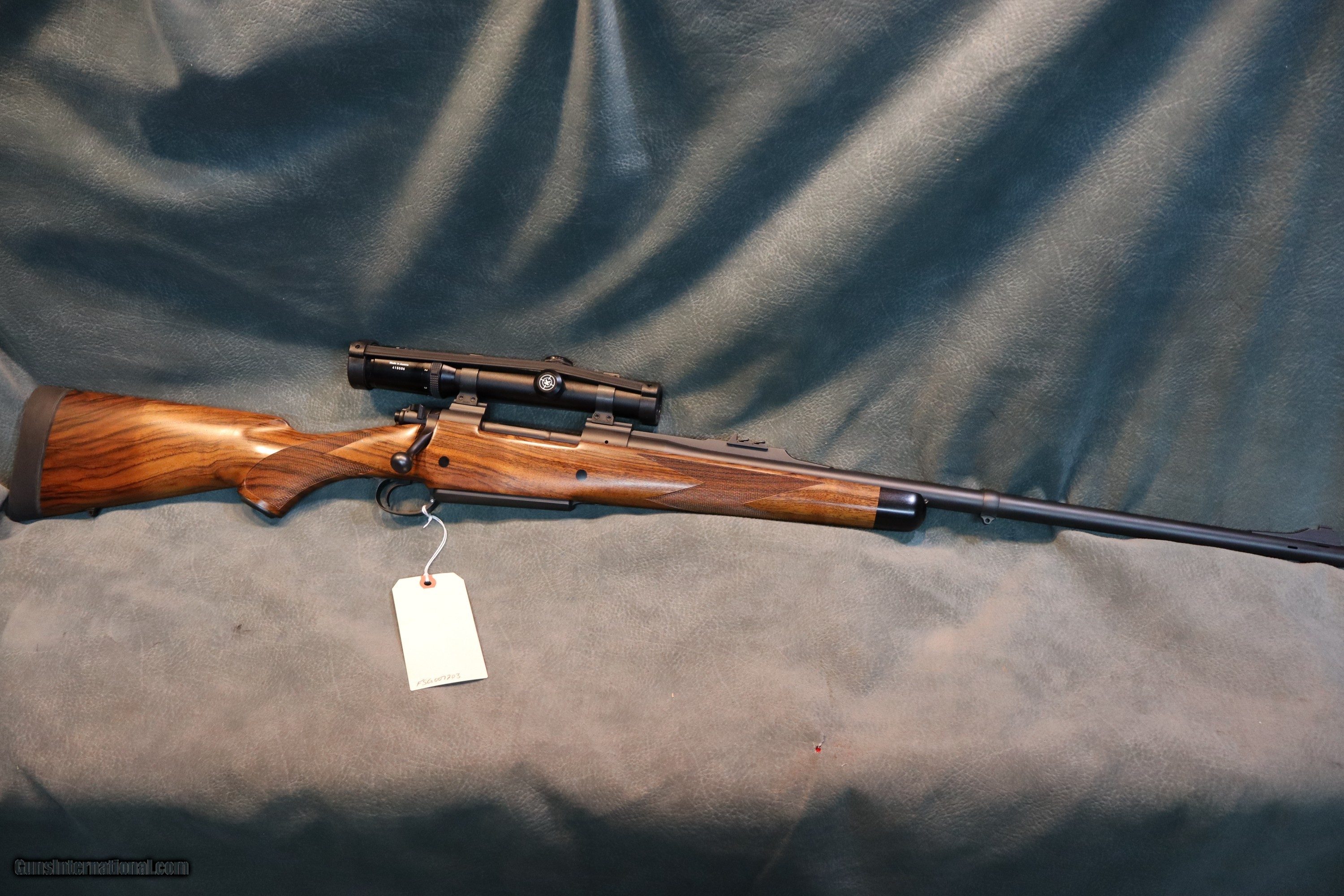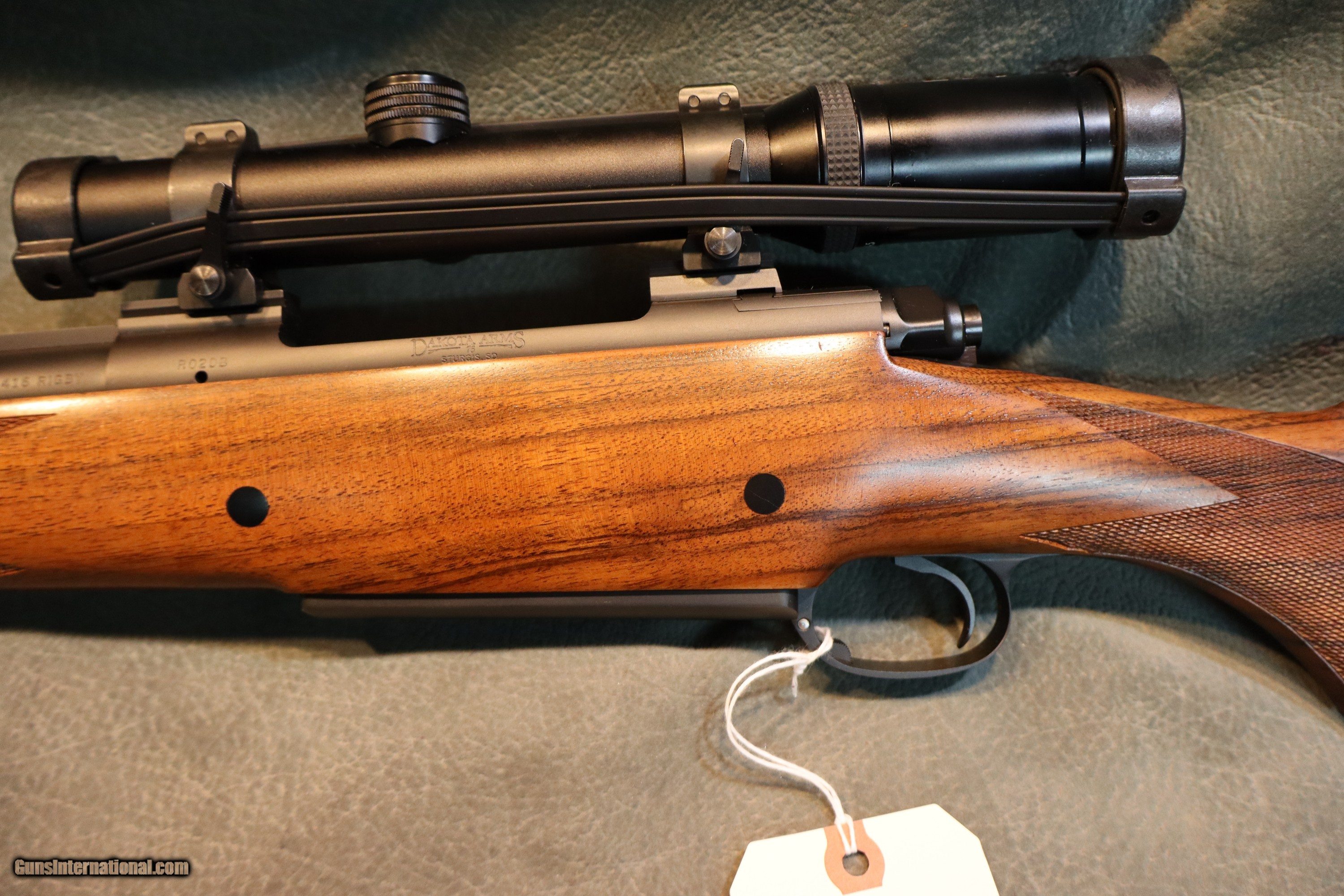 Description: Dakota Arms Model 76 African 416Rigby,24" barrel with quarter rib,1 standing and 2 folding rear sight blades,front sight with extra flip up night sight,magna port,honey colored English Walnut stock nice figure,cheekpiece,wrap checkering,ebony forend tip,2 crossbolts,13 5/8" LOP,barrel band with inletted rear swivel,Talley QD 30mm rings and bases,4 round magazine box with Rigby floorplate $6995,with Kahles 1.1-4x20 scope $7595,extra Dakota Arms synthetic stock 13 5/8" LOP,with cheekpiece,Dakota straddle Rigby floorplate,looks unused was $1600 new,add $895. GUN COLLECTIONS WANTED FOR CASH! We buy, sell, consign and trade new and used firearms. This is our 49th year in business. We offer 90 day layaways with 20% down. No return on layaways. Firearms will need to be transferred through a FFL dealer. Prices reflect a cash discount. There will be 3% added to credit card sales. We trade for gold and silver. THANK YOU! SOLD |