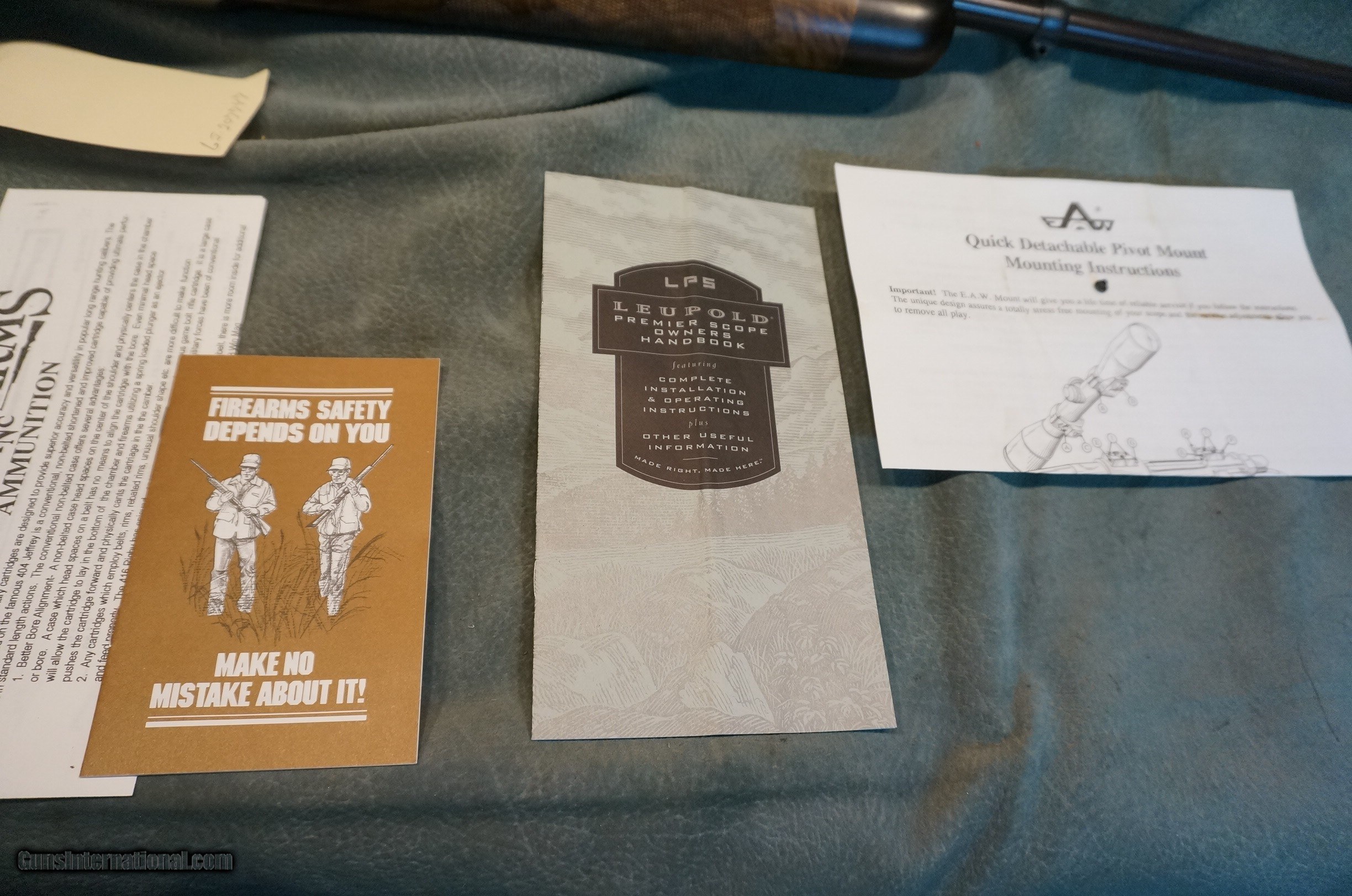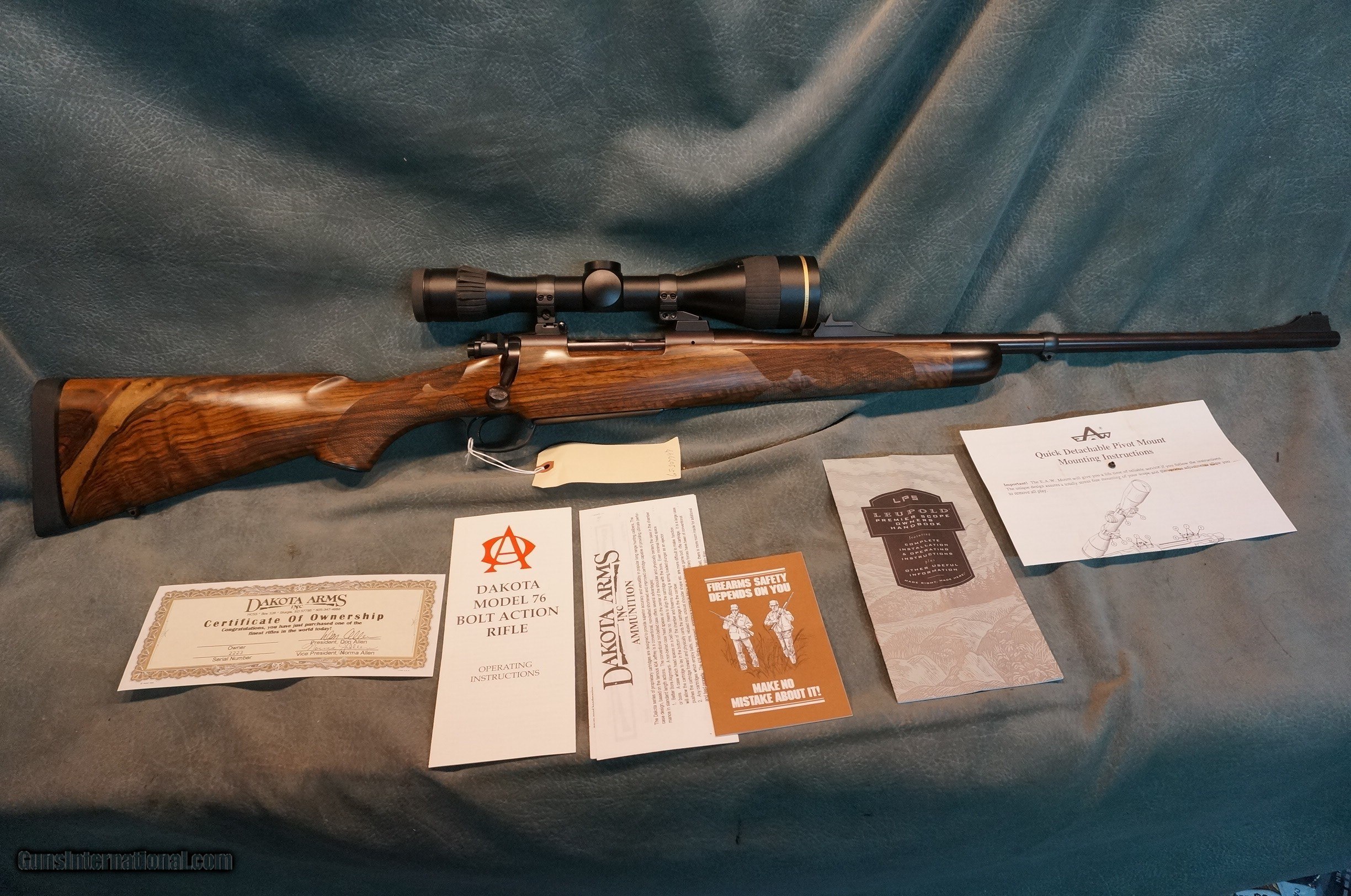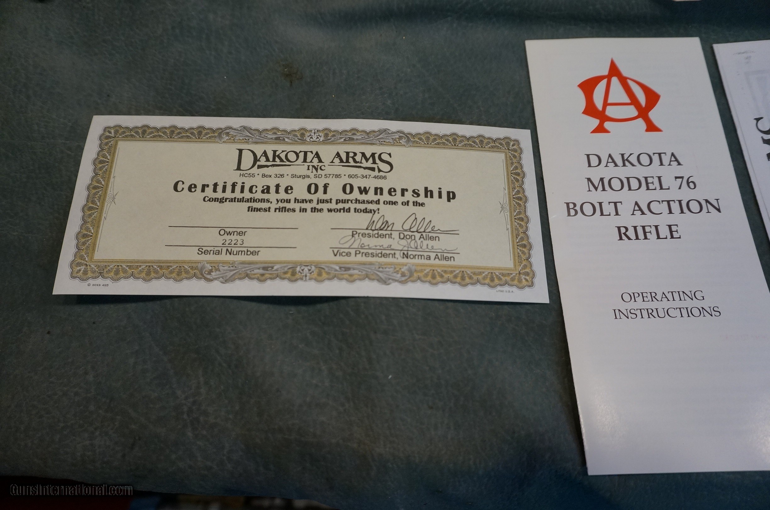 Description: Dakota Arms Model 76 Safari 300WinMag,23" barrel with island rear sight and front sight with flip up night sight,serial #2223,beautiful Exhibition grade English Walnut stock with great figure,cheekpiece with shadowline,fluer de lis checkering,ebony forend tip,skeleton grip cap,inletted rear swivel with barrel band,straddle floorplate,3 panel checkered bolt knob,EAW quick release 30mm rings and bases,98% overall $4995,with Leuplod LPS 4.5-14X A.O. 30mm scope $5595.With manual and owner certificate signed by Don and Norman Allen.A great set up for less than 1/2 of replacement cost. GUN COLLECTIONS WANTED FOR CASH! We buy, sell, consign and trade new and used firearms.We will pay finders fees and travel for large collections. This is our 45th year in business. We offer 90 day layaways with 20% down. No return on layaways. Firearms will need to be transferred through a FFL dealer. Prices reflect a cash discount. There will be 3% added to credit card sales. We trade for gold and silver. THANK YOU! SOLD |