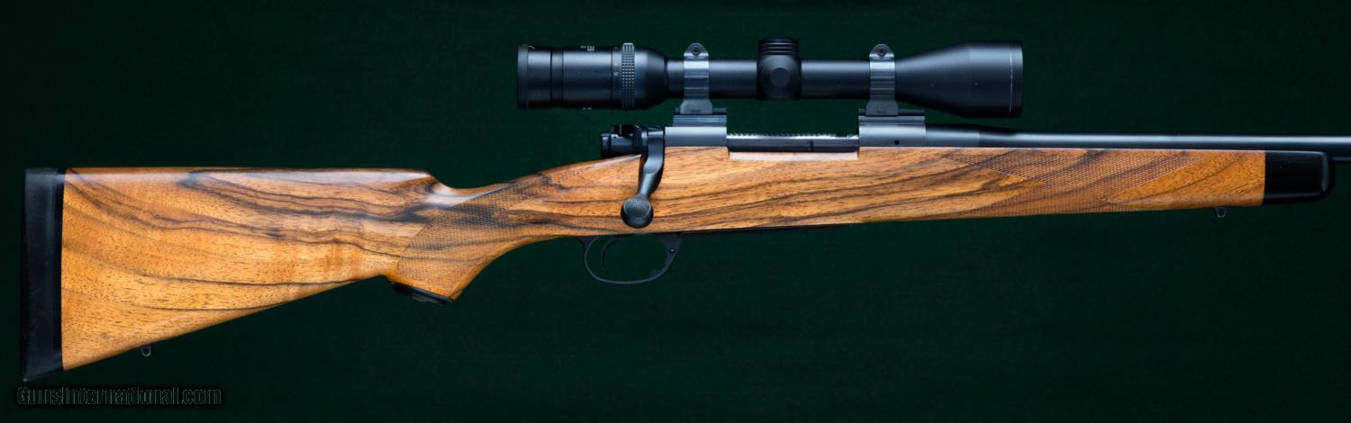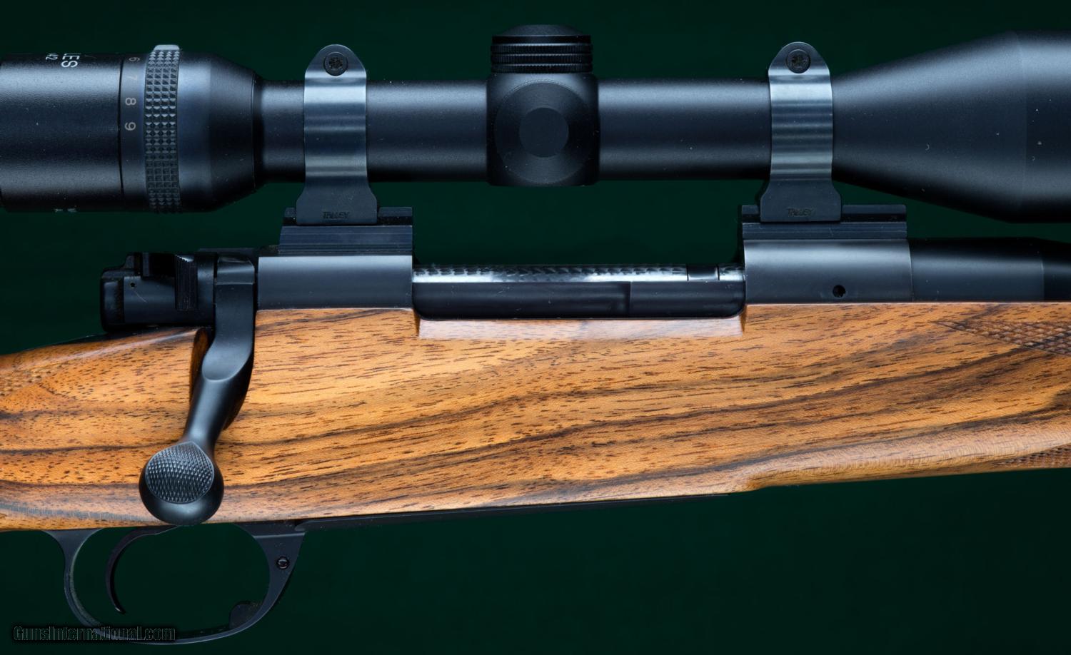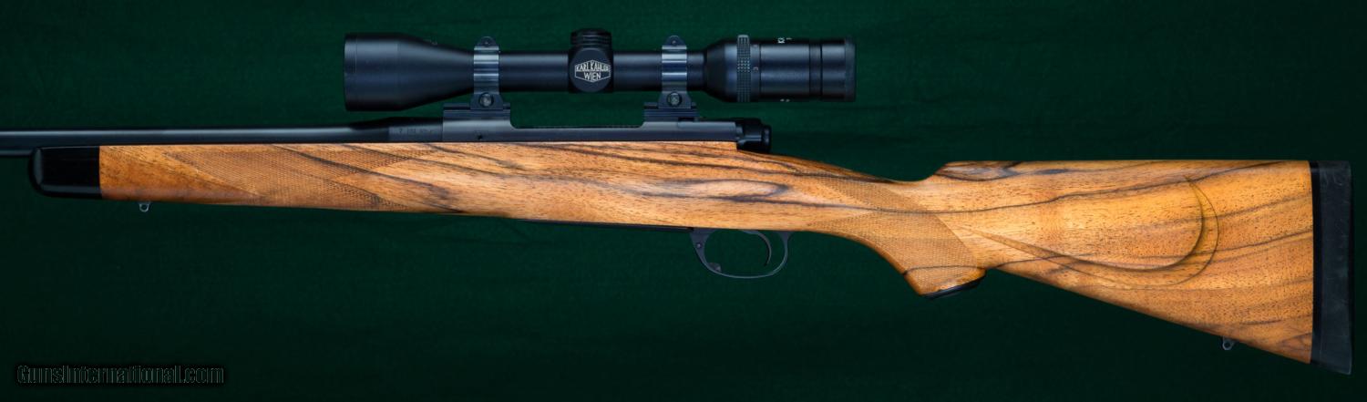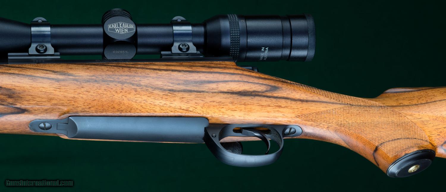 Description: 23" tapered round barrel. Figured walnut stock with ebony forend tip, classic borderless point-pattern checkering---wrapping around the forend, signature steel pistol grip cap, beaded cheekpiece, inletted swivel studs and solid black Old English recoil pad. Controlled-feed action with cloverleaf rear tang, jeweled bolt and follower, 2-panel checkered bolt knob, Model 70-type safety and hinged straddle floorplate with release inside triggerguard. Kahles matte-finish 3-9x42mm scope with fine duplex reticle on Talley-type fixed mounts. Pull: 14". Weight: 9lbs, 1oz. 99%blue. SOLD |