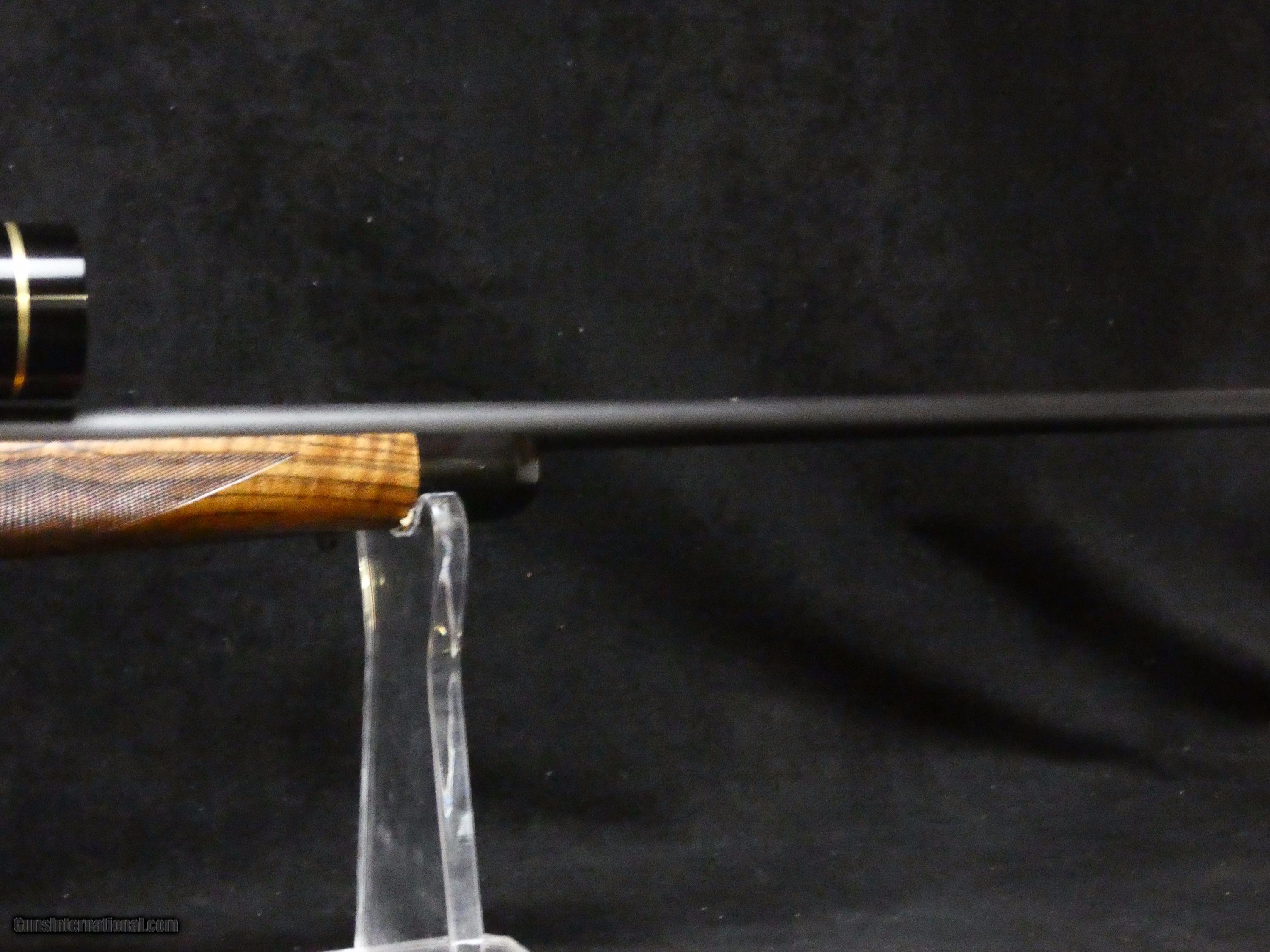 Description: Lots of extras 25: bbl. Special selection English walnut, ebony tip, wrap checkering, cheekpiece, Inletted swivels, Leupold 3 1/2x10x50, full coverage ornamental scrolll engraving by Jere Davidson with a bulino whitetail deer on the floorplate, There is one small ding on the barrel. Other than that it is mint. French grey finish. SOLD Manufacturer: Dakota Arms Model: 76 Serial Number: 2841 Caliber Info: 30-06 Condition: As new |