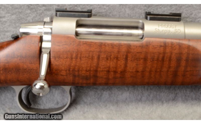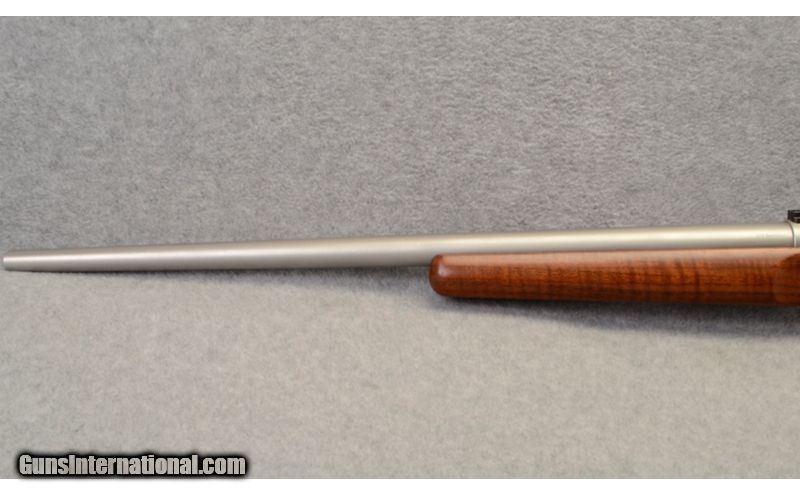 Description: This is a Dakota Arms Predator rifle chambered in .223 Remington. Rifle has no sights, but comes with receiver scope mounts. Barrel is a 24 inch stainless steel varmint barrel. Bore is bright and shiny with strong rifling. Metal is in very good condition with a small scratch on top of barrel in front of forearm. Stock is in very good condition with small scratches on bottom right of forearm. Bolt is polished. Rifle is used but in overall excellent condition and would make a fine target rifle. .223 Remington SOLD Chambers: .223 Remington. Metal Condition: Metal is in very good condition with a small scratch on top of barrel past forearm. Wood Condition: Very good with small scratches on bottom right of forearm. Bore Condition: "Excellent, bright and shiny with strong rifling. Barrels: 24 inches. Butt Pad: Rubber Dakota Arms buttpad. Weight: 9lbs 3oz Sights: Receiver scope mounts. Item Location: Tualatin, OR |