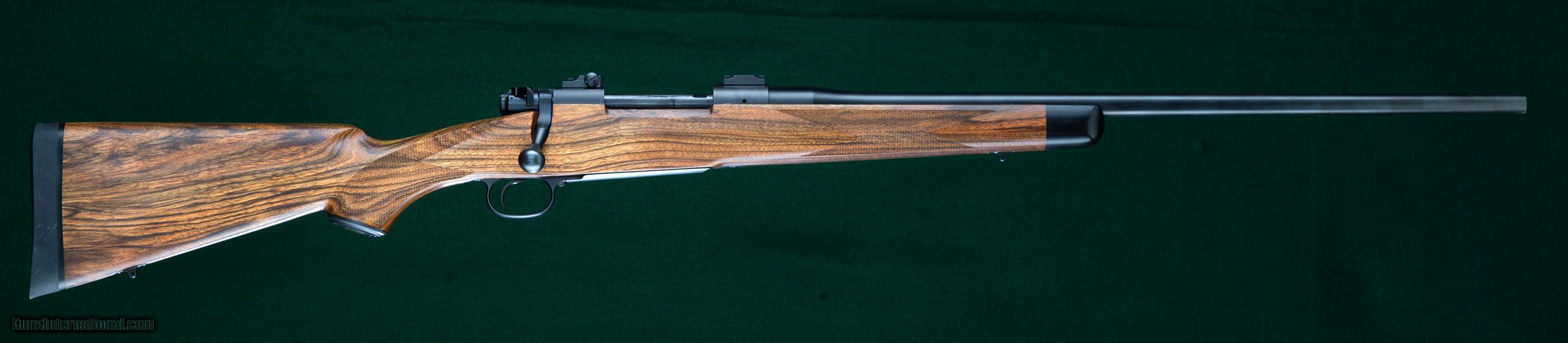 Description: 23" tapered round barrel. Prominently straight-grained walnut stock with ebony forend tip, inletted swivel bases, classic point-pattern checkering, steel-capped pistol grip with NRA logo, and maker's original black recoil pad. Dakota 76 action with hinged floorplate, Model 70-type safety, and Leupold 2-piece bases. Pull: 13 5/8". Weight: 7lbs, 13oz. 99%+blue. Excellent bore. SOLD |