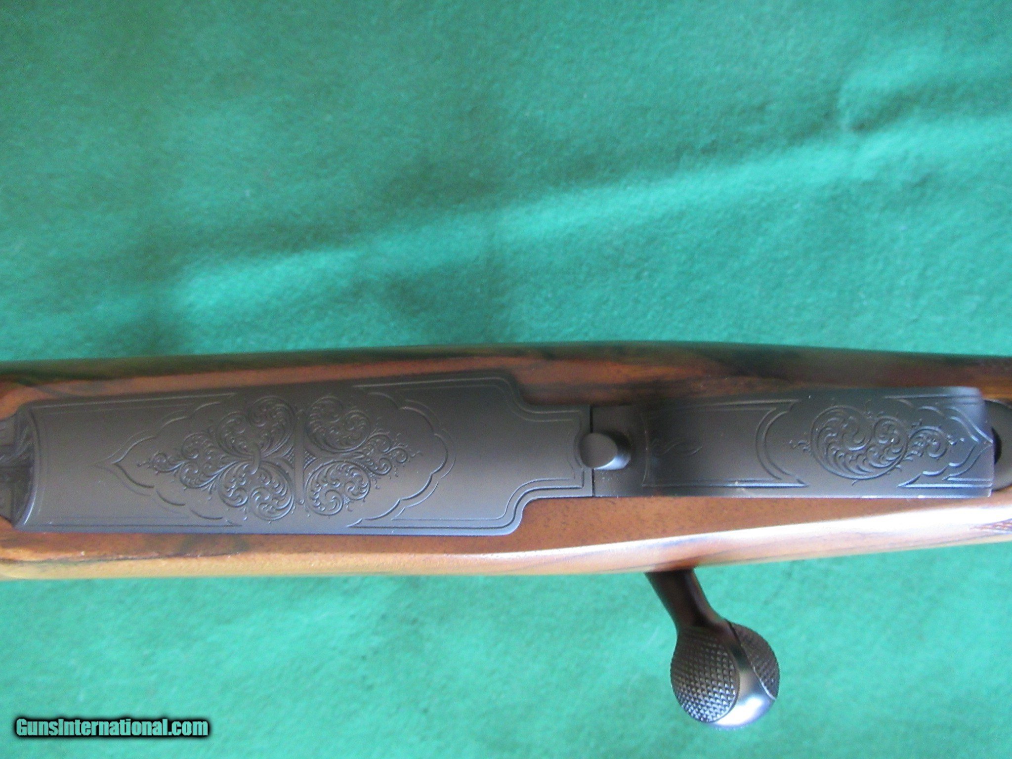 Description: New and unfired Dakota 76 in 330 Dakota. Scroll engraved at the factory over the action, bottom metal, rings, barrel and grip cap. Gold bands on muzzle, rear of barrel and on grip cap. Initials RJP in gold on grip cap. Soft matte blue on all metal. 24" barrel with quarter rib, single rear sight and hooded front sight with bead. 3 panel checkered bolt knob and a jeweled bolt. 30mm QD rings. Build as a double square bridge. Please check the photos for details of the engraving and the stock which is 3X exhibition walnut. Great color with dark brown and black marbeling throughout. Ebony forend, 2 screw sling mounts and borderless point pattern checkering. Generous coverage with full wrap around on the forend. Shadowline cheekpiece and a 13 5/8" LOP over a 1" black pad. This is a very striking rifle and will be the centerpiece of your collection. Thank you for looking and please call Raff at 760 497 7836 if you have any questions. SOLD Rifle Caliber: .330 Dakota Manufacturer: Dakota Arms Model: 76 Serial Number: 101-2 Barrel Length: 24 Condition: NEW Metal Condition: Excellent Wood Condition: Stock Excellent Bore Condition: New LOP: 13 5/8 Weight: 8 lb. 8 oz. Sights: Adjustable single leaf Engraving: Scroll Item Location: Arizona |