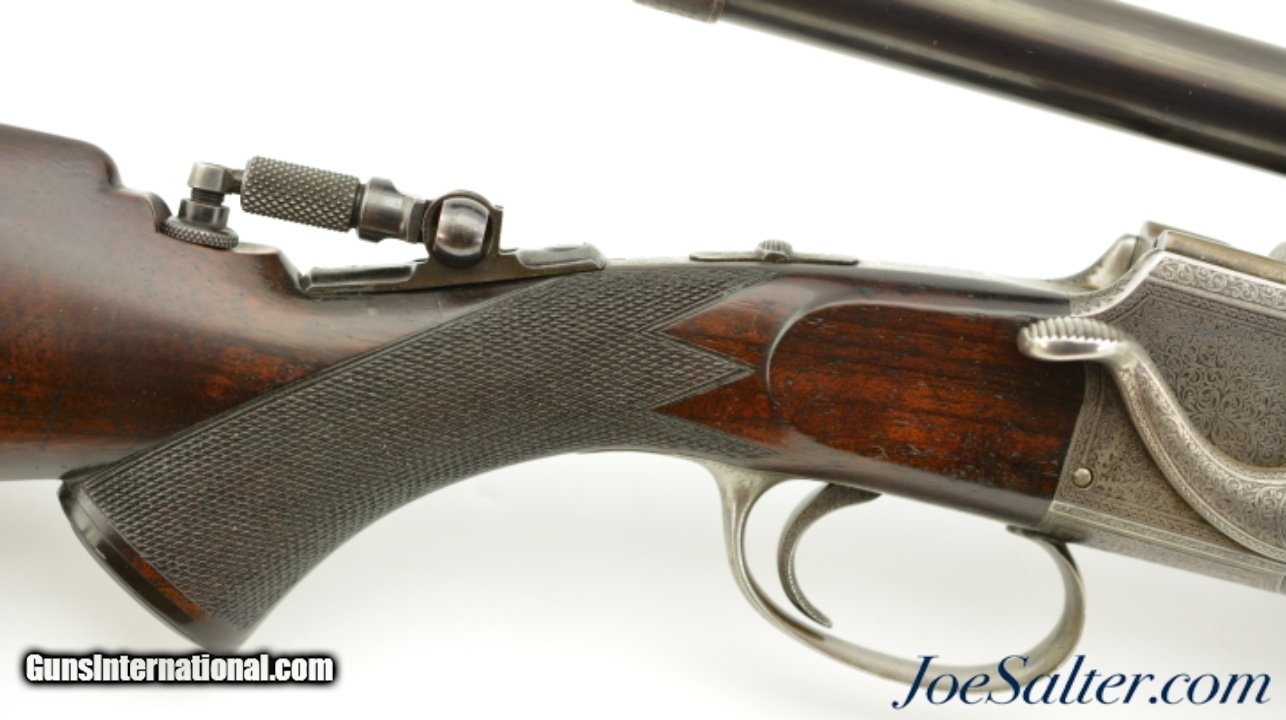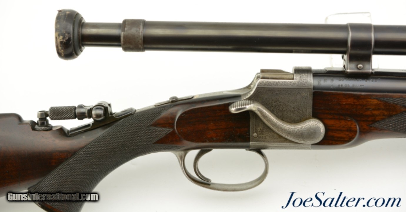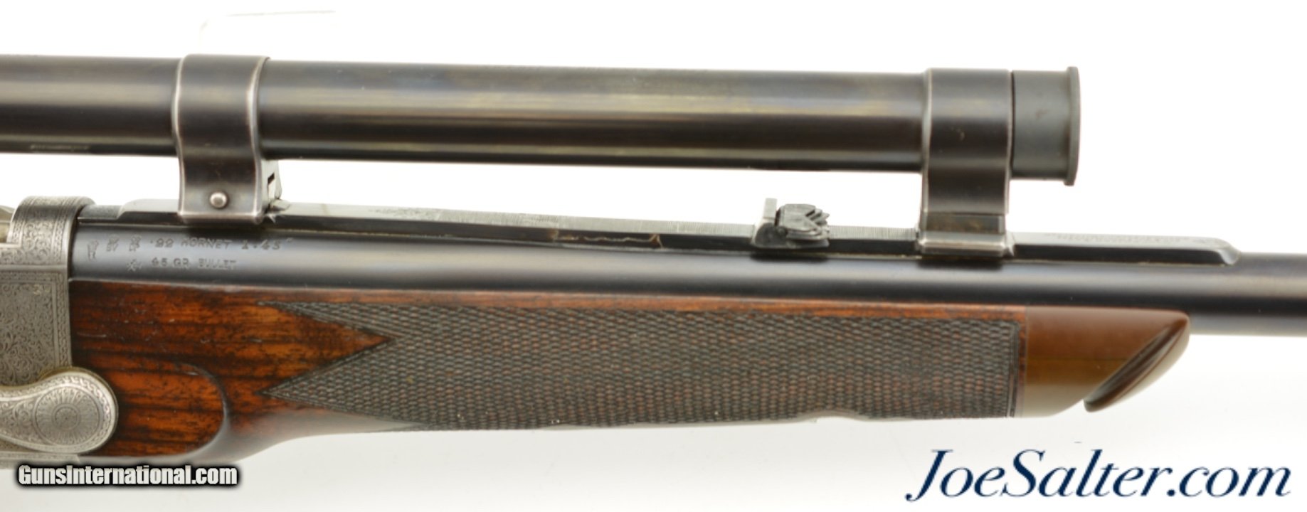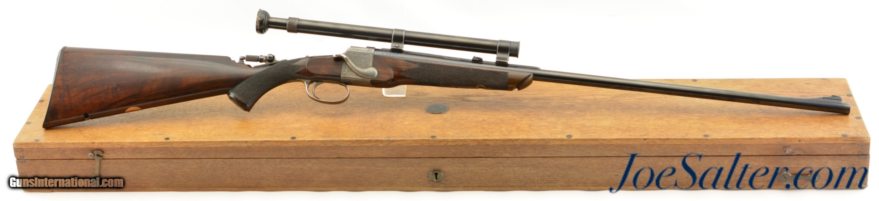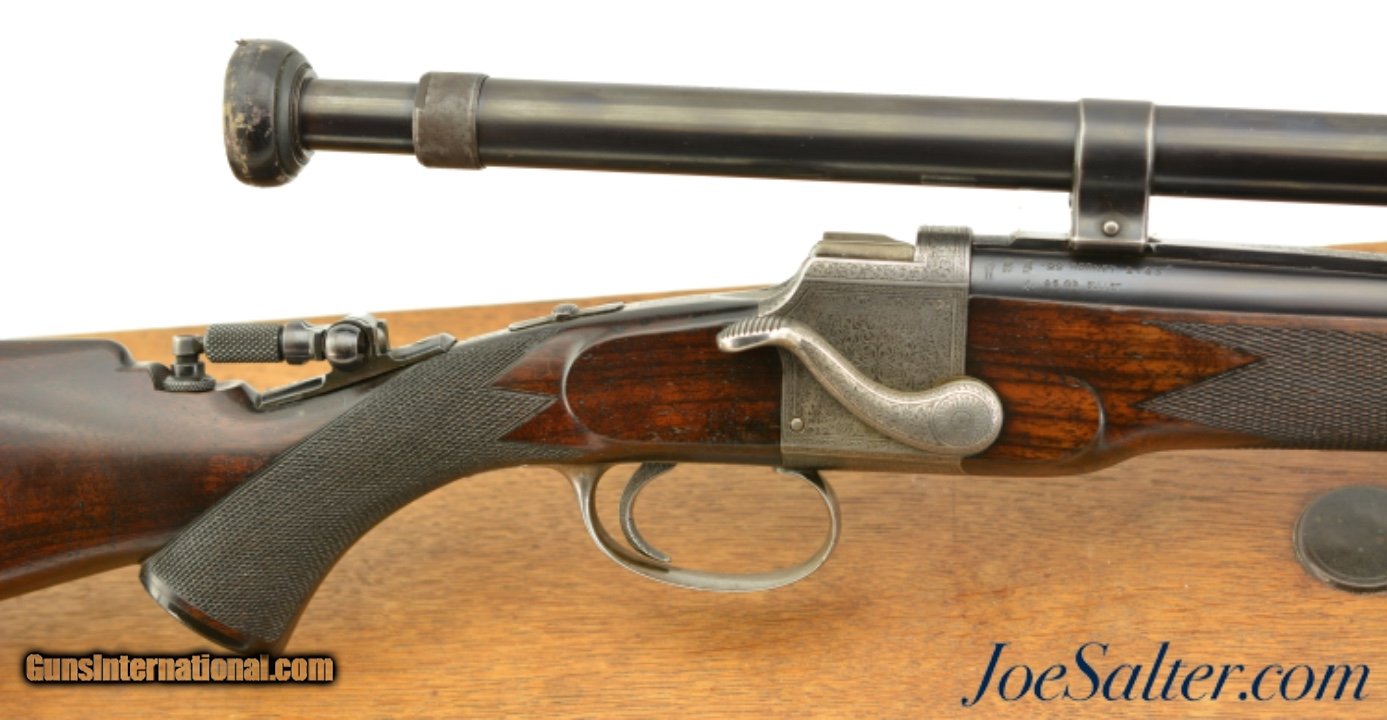Description: Serial #1858, .22 Hornet, 26" barrel with a fine, bright bore that has some very mild freckling within the grooves. This is a handsome little takedown rook rifle, probably chambered in .220 Rook originally, that was rechambered to the much more effective .22 Hornet in the 20th century, and has extensive modern Birmingham proofs on the right side of the chamber which date from 1938-39 (the original London proofs are still visible on the left side). The barrel retains nearly all of a maker reapplied blue finish with crisp and clear maker’s address on the matted quarter-rib ahead of the forward scope pad and three-leaf rear sight, "DANL. FRASER & CO. / GUN & RIFLE MANUFACTURERS / 4 LEITH ST. TERRACE EDINBURGH" (Fraser operated at this address from 1878 & 1889). The receiver has extensive scrollwork engraving throughout, and has an overall pewter gray patina with hints of mottled color case-hardening still visible on protected areas. The sliding tang safety has a gold inlay "SAFE" label paired to a red enamel inlay opposite, and even the sides of the trigger are decoratively engraved. The English walnut Alexander Henry type forend has fine checkering with a carved and polished hard rubber tip. The pistol-grip buttstock has a slim oval cheek-piece along with a hard rubber grip cap, checkered hard rubber buttplate, and blank gold escutcheon on the belly just ahead of the single swivel stud. The rifle is accompanied by an original Alexander Henry retailed 4x scope with padded leather eye-cup and double line crosshair reticle with calibrations of 100 & 150 yds for the upper line, and 200 & 250 yds for the lower line. The optics are still clear and the scope mounts well onto the scope pads, but does exhibit a very small amount of lateral play. The rifle and scope are housed in a period oak traveling case, relined with a sky blue baize interior fairly recently. An intact period Alexander Henry paper label is present on the interior of the lid, and the key is included. This is a really handsome and diminutive rifle, made by a great Scottish maker, and chambered in a wonderful small game chambering. It would make a splendid addition to any collection. Antique SOLD Antique: Yes |