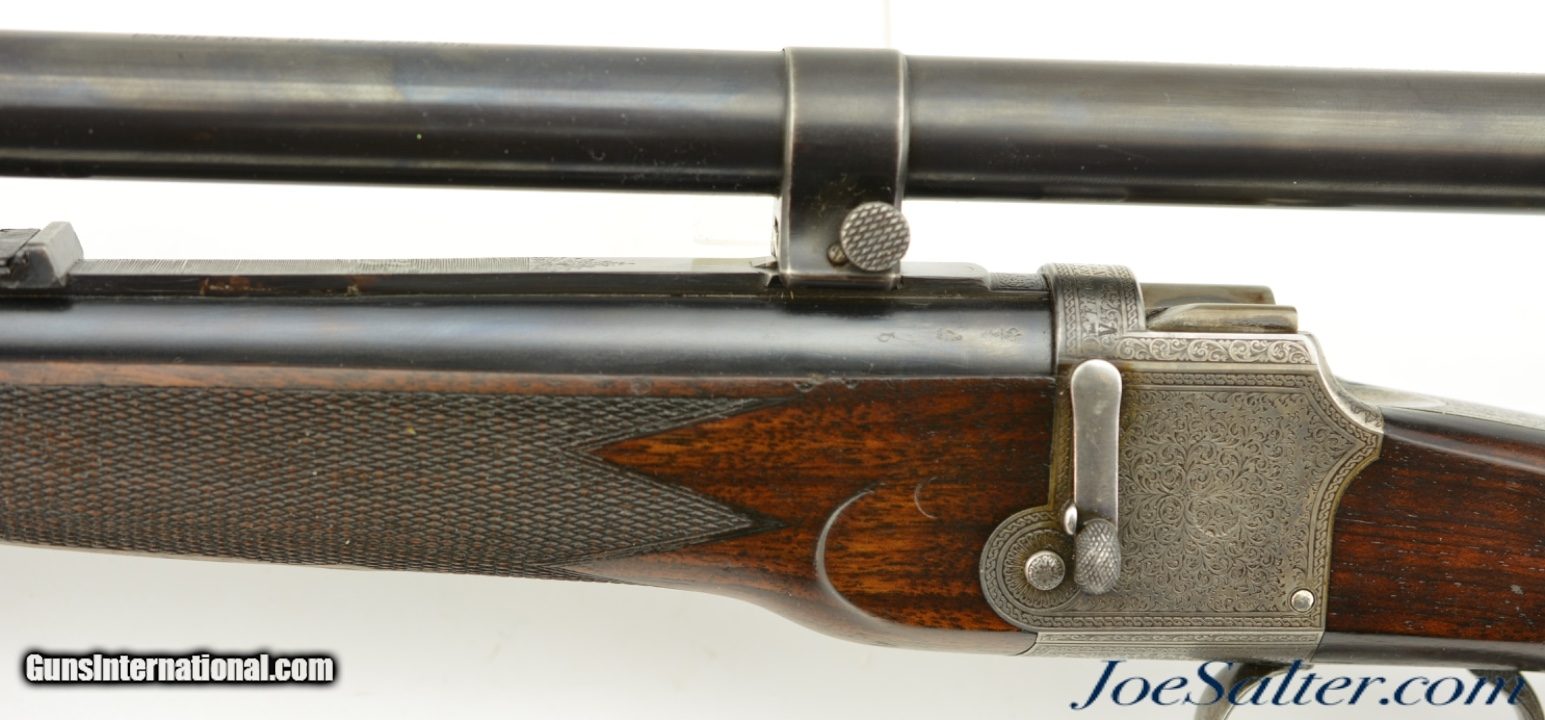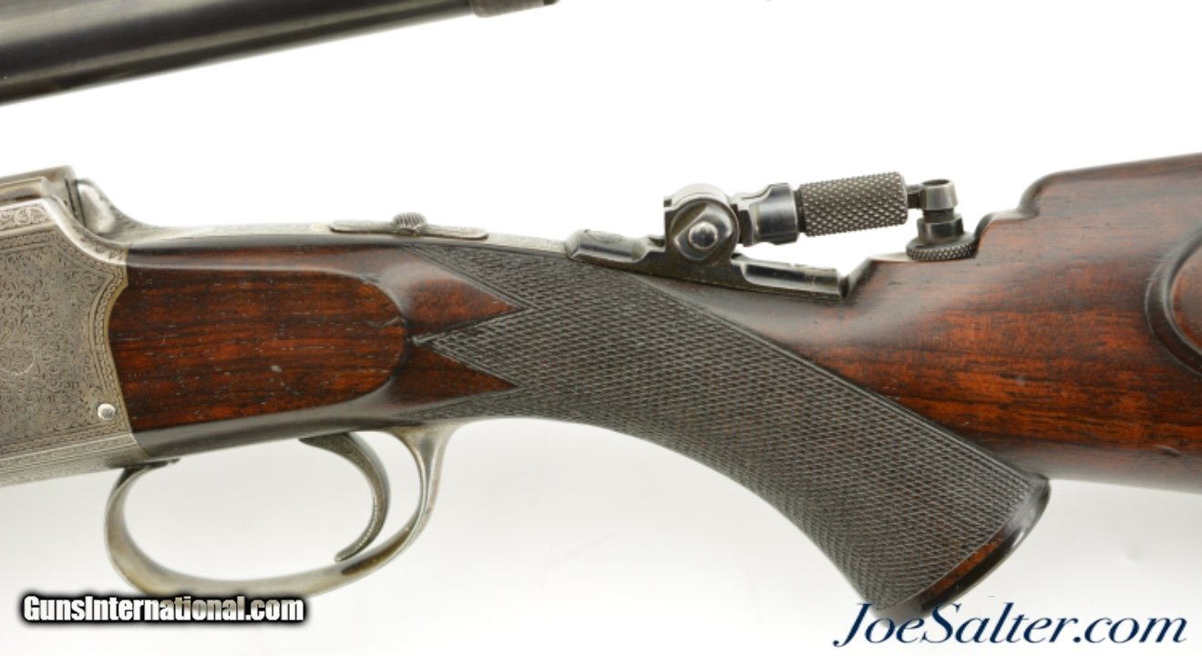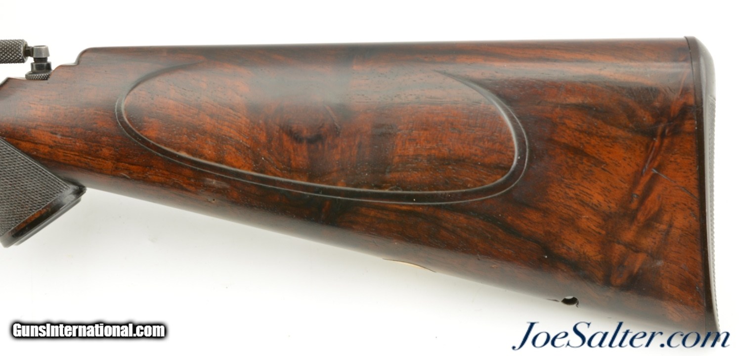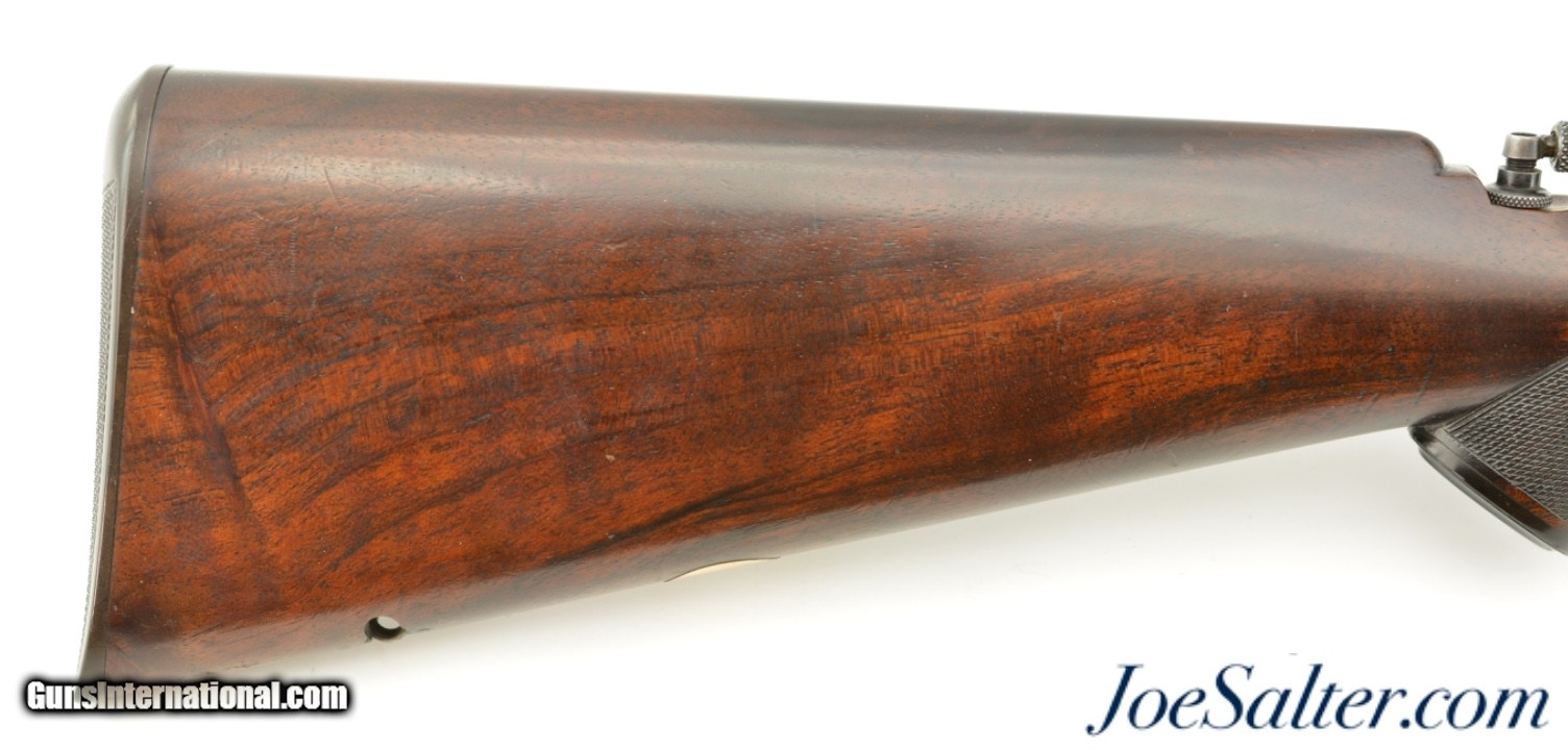 Description: Serial #1858, .22 Hornet, 26" barrel with a fine, bright bore that has some very mild freckling within the grooves. This is a handsome little takedown rook rifle, probably chambered in .220 Rook originally, that was rechambered to the much more effective .22 Hornet in the 20th century, and has extensive modern Birmingham proofs on the right side of the chamber which date from 1938-39 (the original London proofs are still visible on the left side). The barrel retains nearly all of a maker reapplied blue finish with crisp and clear maker’s address on the matted quarter-rib ahead of the forward scope pad and three-leaf rear sight, "DANL. FRASER & CO. / GUN & RIFLE MANUFACTURERS / 4 LEITH ST. TERRACE EDINBURGH" (Fraser operated at this address from 1878 & 1889). The receiver has extensive scrollwork engraving throughout, and has an overall pewter gray patina with hints of mottled color case-hardening still visible on protected areas. The sliding tang safety has a gold inlay "SAFE" label paired to a red enamel inlay opposite, and even the sides of the trigger are decoratively engraved. The English walnut Alexander Henry type forend has fine checkering with a carved and polished hard rubber tip. The pistol-grip buttstock has a slim oval cheek-piece along with a hard rubber grip cap, checkered hard rubber buttplate, and blank gold escutcheon on the belly just ahead of the single swivel stud. The rifle is accompanied by an original Alexander Henry retailed 4x scope with padded leather eye-cup and double line crosshair reticle with calibrations of 100 & 150 yds for the upper line, and 200 & 250 yds for the lower line. The optics are still clear and the scope mounts well onto the scope pads, but does exhibit a very small amount of lateral play. The rifle and scope are housed in a period oak traveling case, relined with a sky blue baize interior fairly recently. An intact period Alexander Henry paper label is present on the interior of the lid, and the key is included. This is a really handsome and diminutive rifle, made by a great Scottish maker, and chambered in a wonderful small game chambering. It would make a splendid addition to any collection. Antique SOLD Antique: Yes |