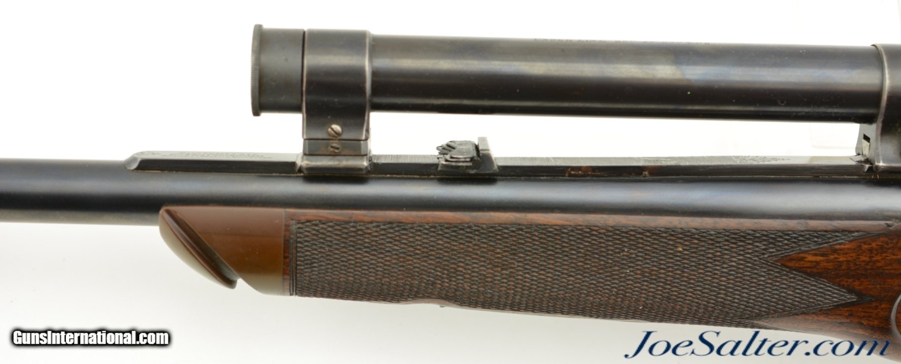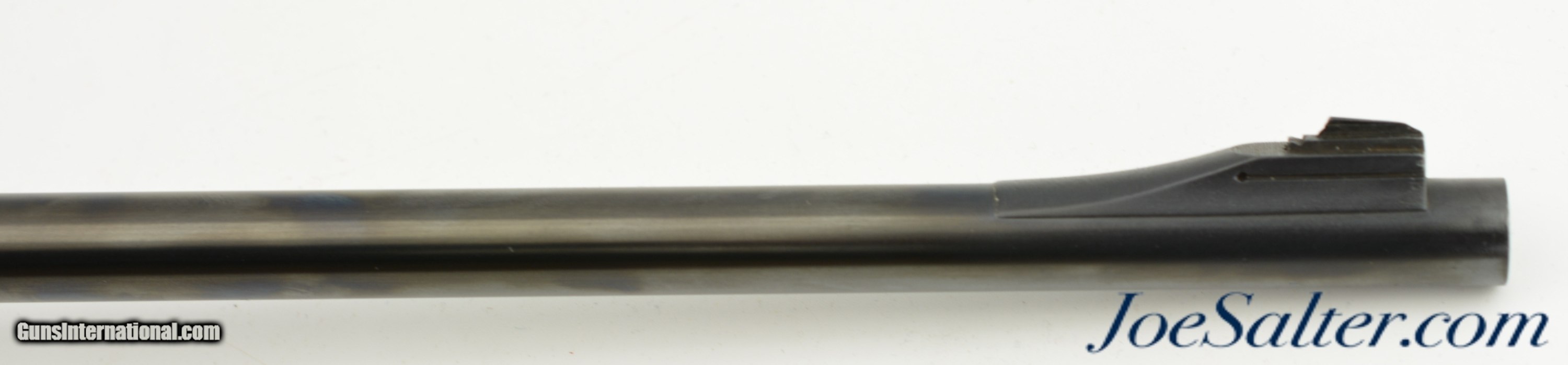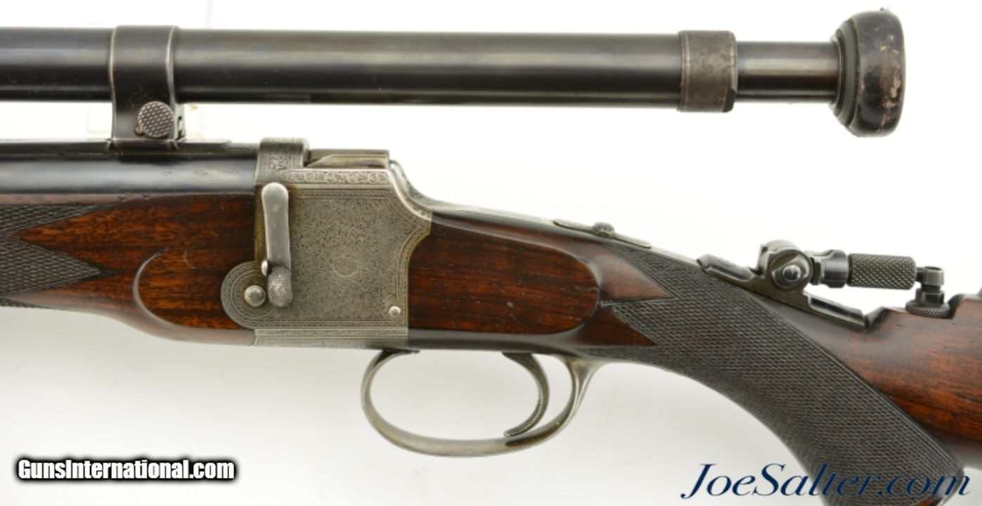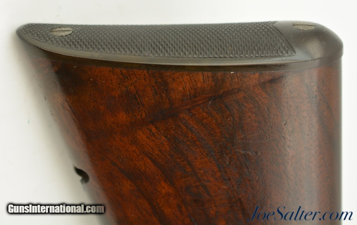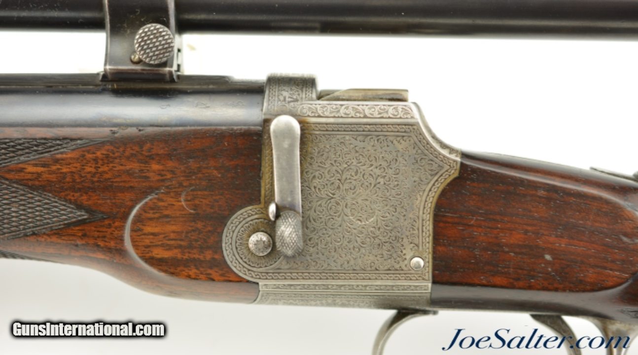 Description: Serial #1858, .22 Hornet, 26" barrel with a fine, bright bore that has some very mild freckling within the grooves. This is a handsome little takedown rook rifle, probably chambered in .220 Rook originally, that was rechambered to the much more effective .22 Hornet in the 20th century, and has extensive modern Birmingham proofs on the right side of the chamber which date from 1938-39 (the original London proofs are still visible on the left side). The barrel retains nearly all of a maker reapplied blue finish with crisp and clear maker’s address on the matted quarter-rib ahead of the forward scope pad and three-leaf rear sight, "DANL. FRASER & CO. / GUN & RIFLE MANUFACTURERS / 4 LEITH ST. TERRACE EDINBURGH" (Fraser operated at this address from 1878 & 1889). The receiver has extensive scrollwork engraving throughout, and has an overall pewter gray patina with hints of mottled color case-hardening still visible on protected areas. The sliding tang safety has a gold inlay "SAFE" label paired to a red enamel inlay opposite, and even the sides of the trigger are decoratively engraved. The English walnut Alexander Henry type forend has fine checkering with a carved and polished hard rubber tip. The pistol-grip buttstock has a slim oval cheek-piece along with a hard rubber grip cap, checkered hard rubber buttplate, and blank gold escutcheon on the belly just ahead of the single swivel stud. The rifle is accompanied by an original Alexander Henry retailed 4x scope with padded leather eye-cup and double line crosshair reticle with calibrations of 100 & 150 yds for the upper line, and 200 & 250 yds for the lower line. The optics are still clear and the scope mounts well onto the scope pads, but does exhibit a very small amount of lateral play. The rifle and scope are housed in a period oak traveling case, relined with a sky blue baize interior fairly recently. An intact period Alexander Henry paper label is present on the interior of the lid, and the key is included. This is a really handsome and diminutive rifle, made by a great Scottish maker, and chambered in a wonderful small game chambering. It would make a splendid addition to any collection. Antique SOLD Antique: Yes |