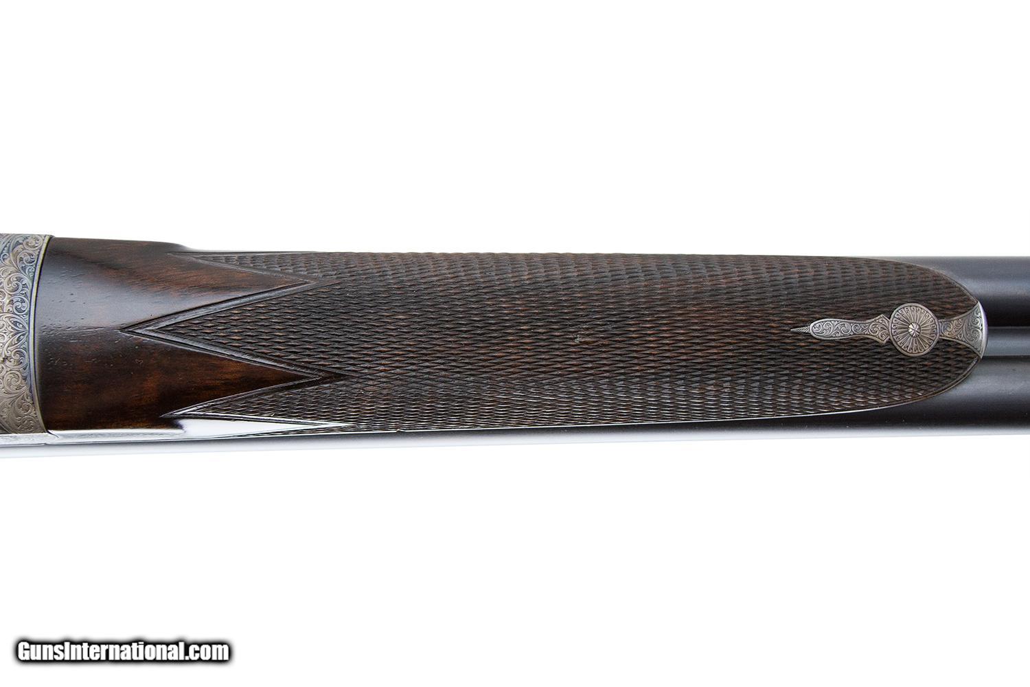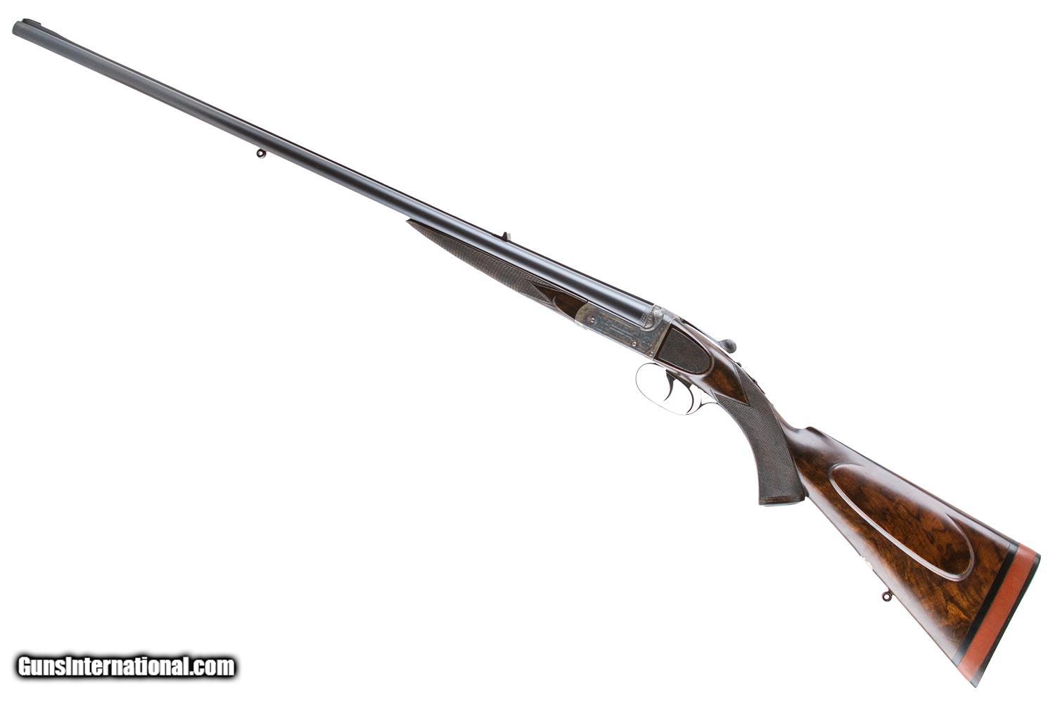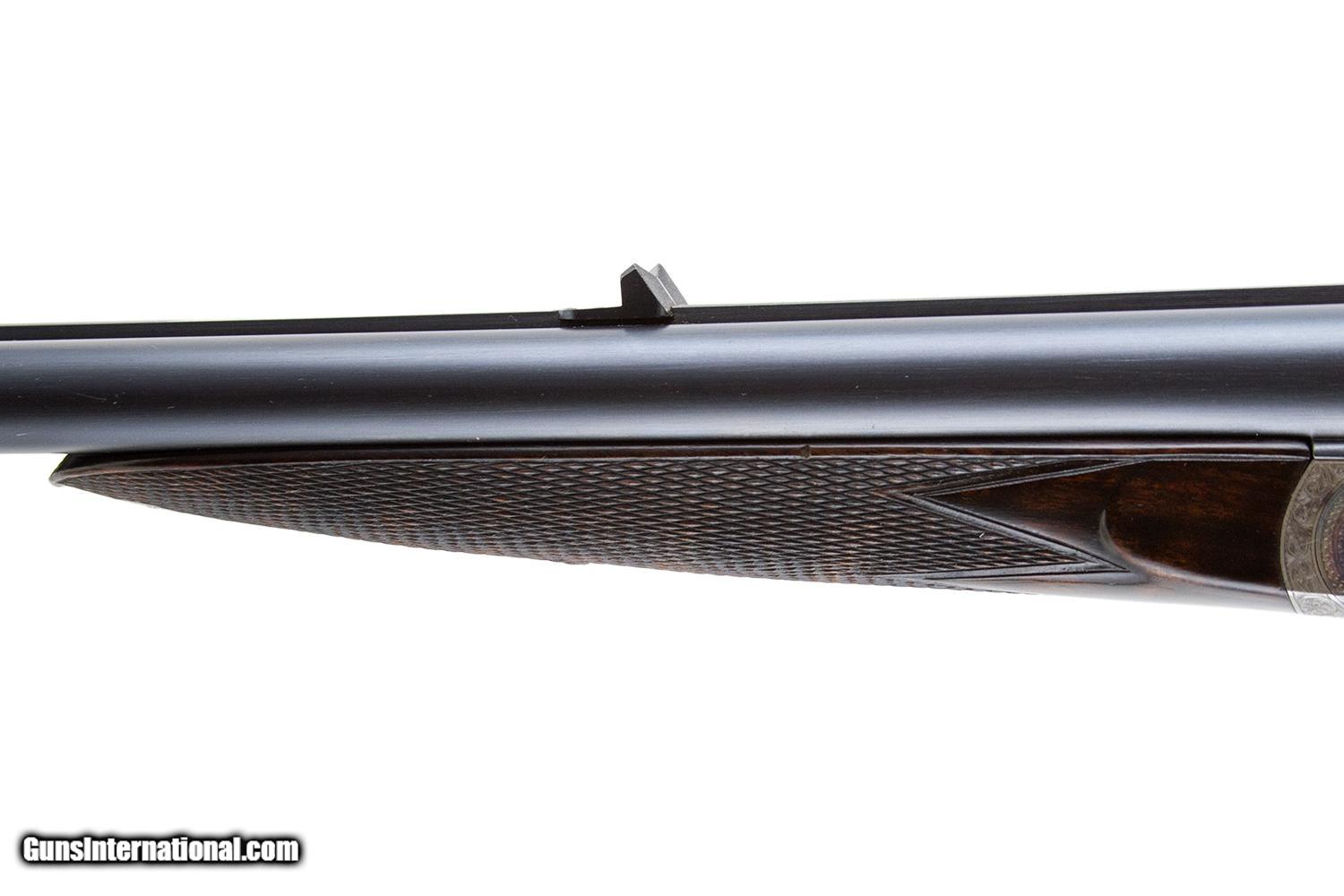 Description: 26 3/4" BARRELS WITH GREAT BORES SINGLE LEAF EXPRESS REAR SIGHT DOUBLE TRIGGER EXTRACTOR SPLINTER FOREARM PISTOL GRIP LEATHER MAKERS CASE 8LB 1 OZ X 14 1/2 SOLD |