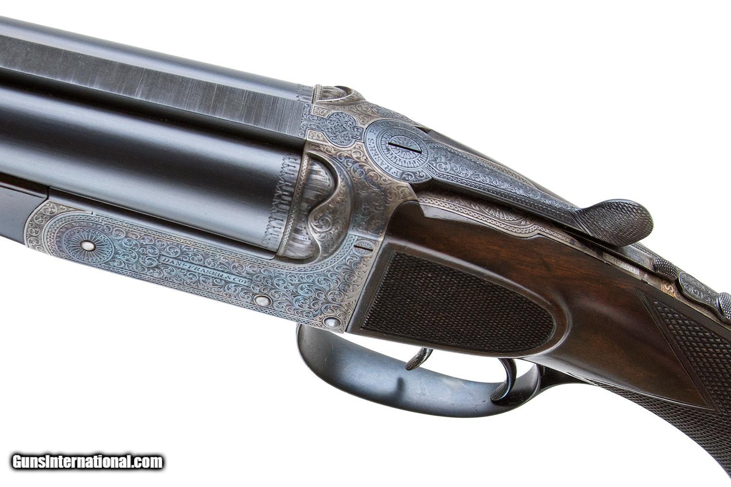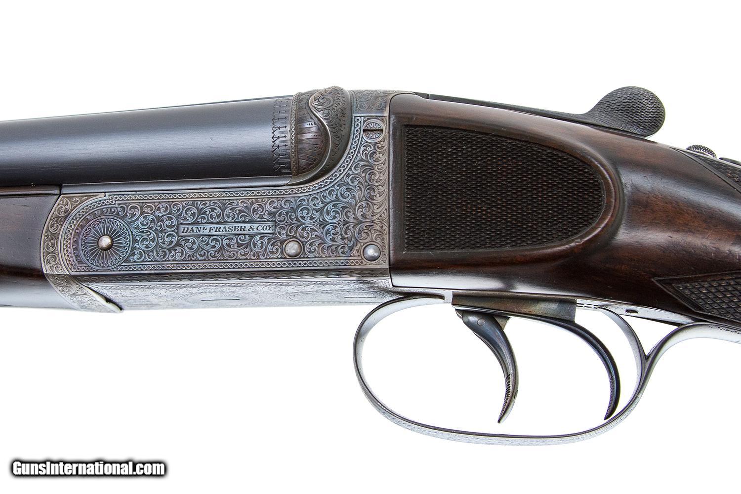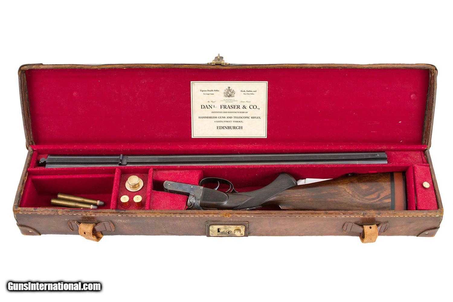 Description: 26 3/4" BARRELS WITH GREAT BORES SINGLE LEAF EXPRESS REAR SIGHT DOUBLE TRIGGER EXTRACTOR SPLINTER FOREARM PISTOL GRIP LEATHER MAKERS CASE 8LB 1 OZ X 14 1/2 SOLD |
