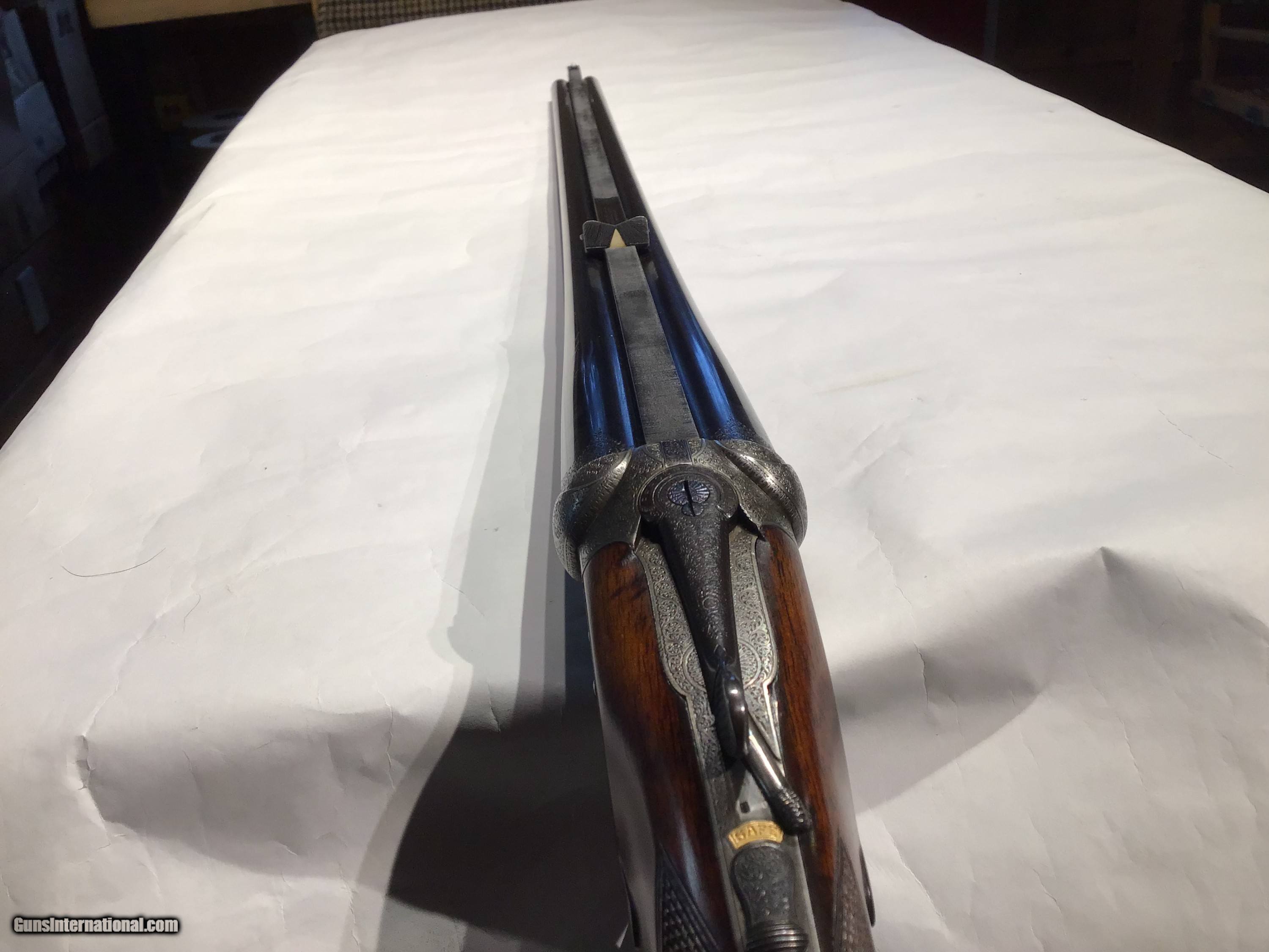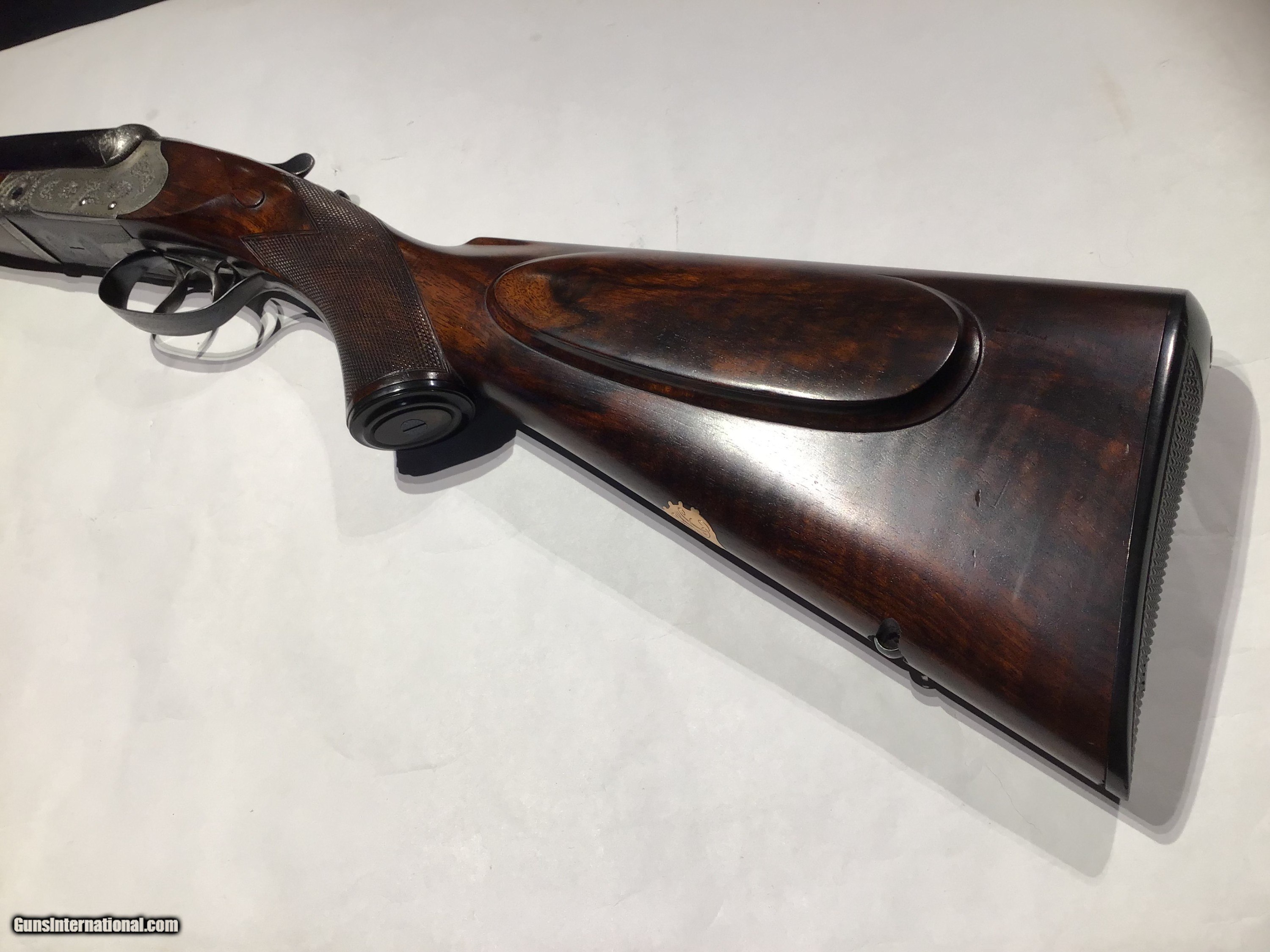 Description: Beautifully made rifle, very fine condition, bores very good, shoots very well. Features include, sideclips, dolls head, bushed huts, safari safety, sling mounts, long strap, and pistol grip cap. Original case in very fine order. SOLD Rifle Caliber: .303 British Manufacturer: Daniel Fraser Model: BLE Serial Number: 3246 Barrel Length: 26 1/4 Ejectors: Yes Condition: Excellent Action: Anson & Deeley Triggers: Double Stock: Pistol Grip & Cheek Piece Stock Comb: 1 3/4 Stock Heel: 2 1/2 LOP: 14 1/4 Rib: Solid Crossfiled Weight: 9 lbs. 3 oz. Sights: 3 Stage Leaf & Moon Sight Engraving: Full Scroll Engraved |