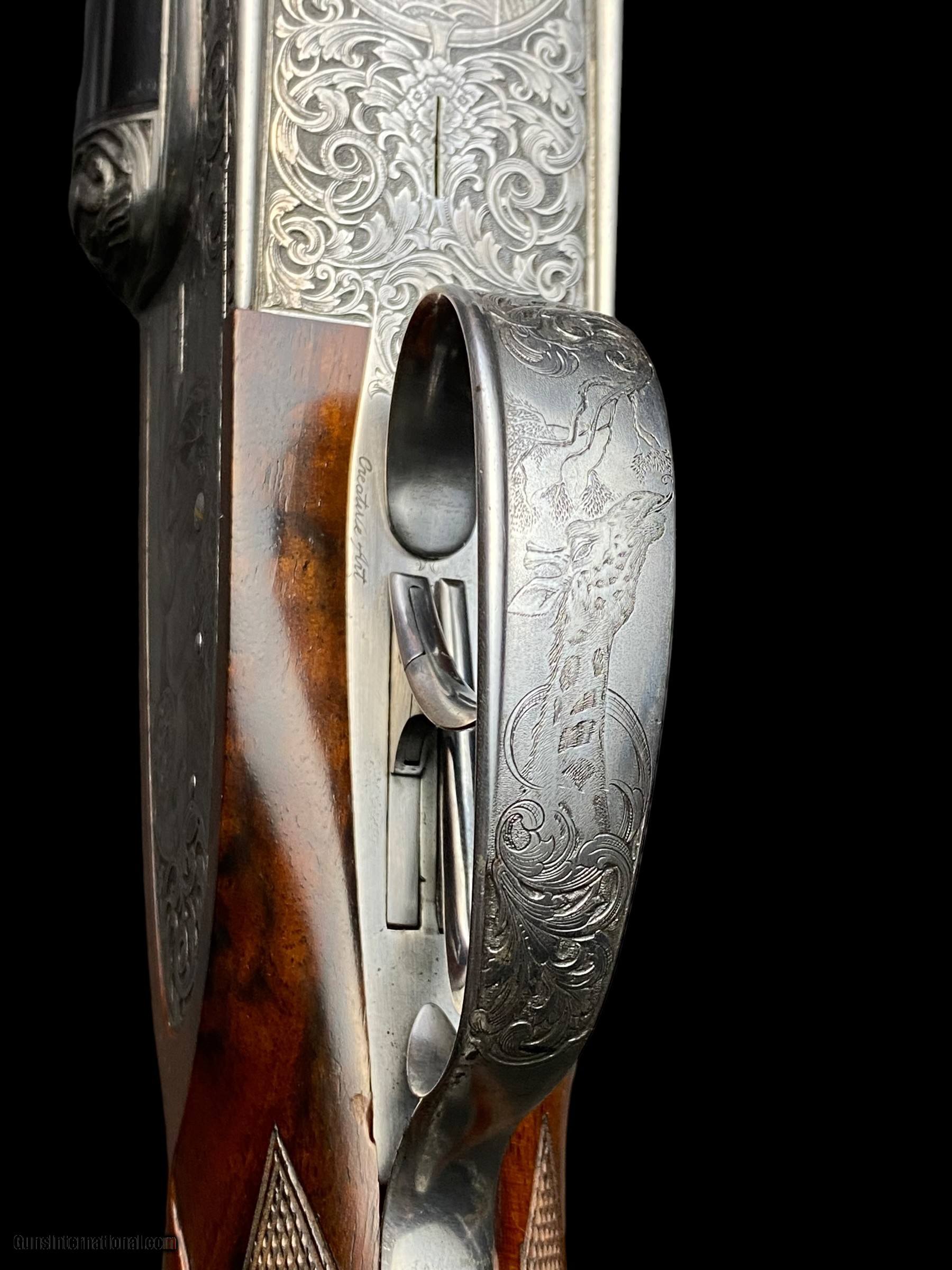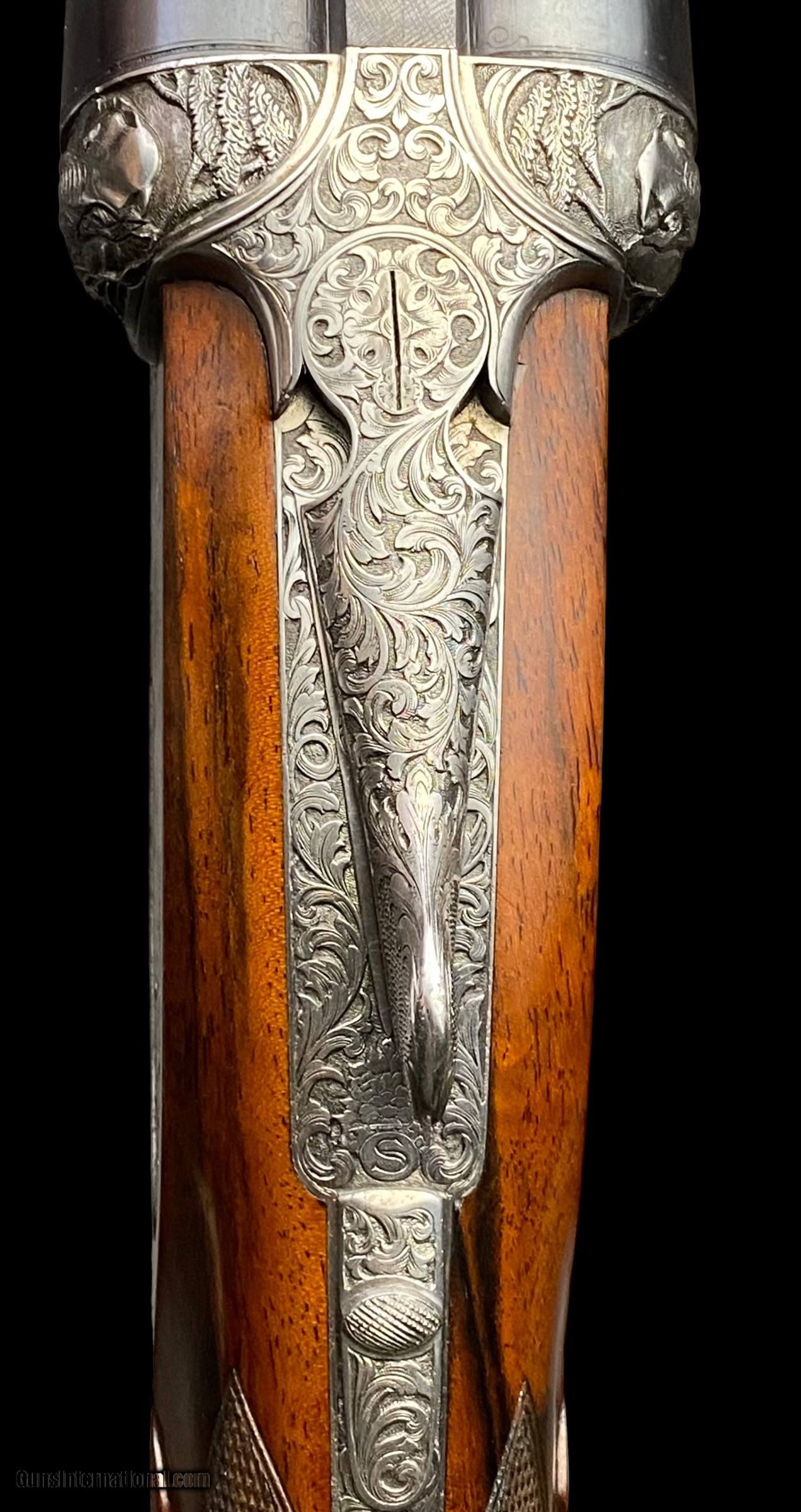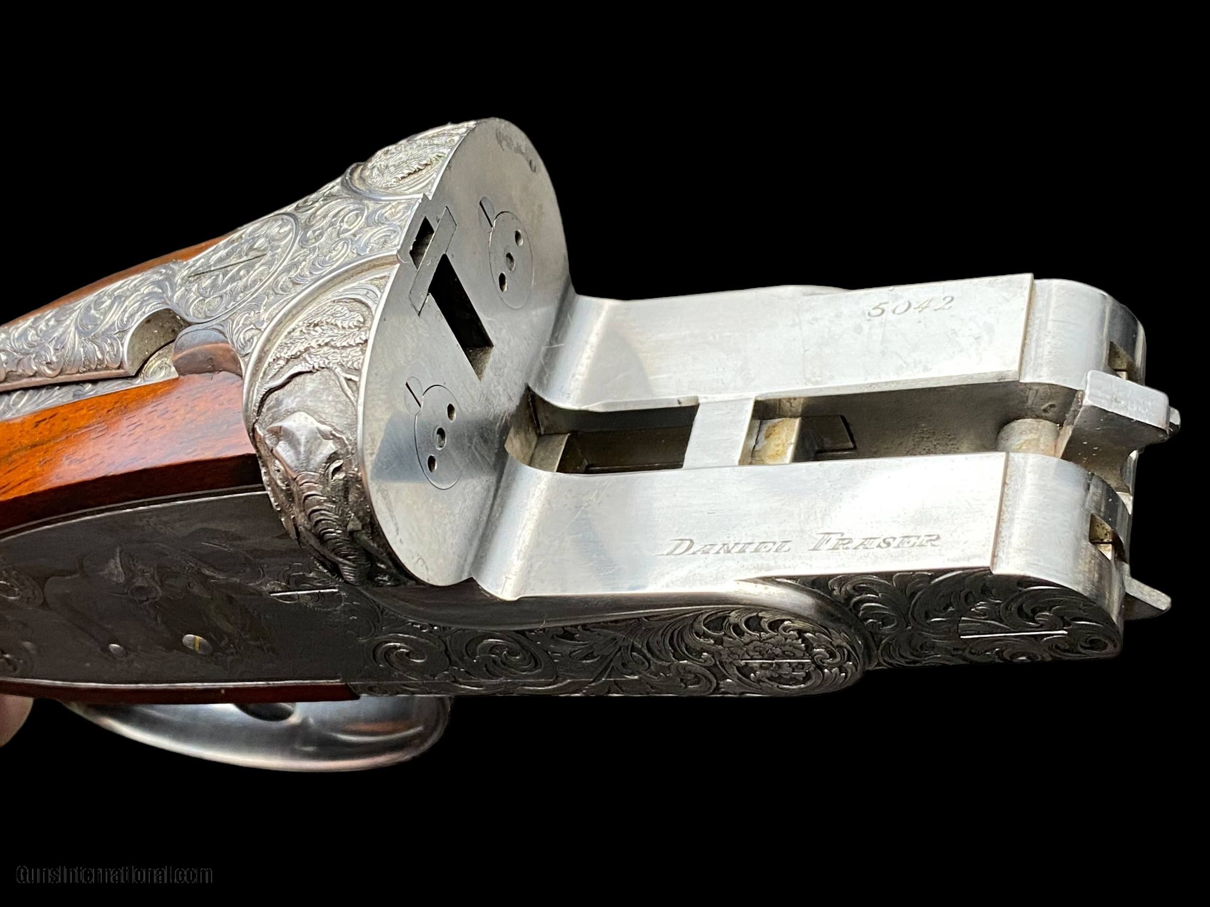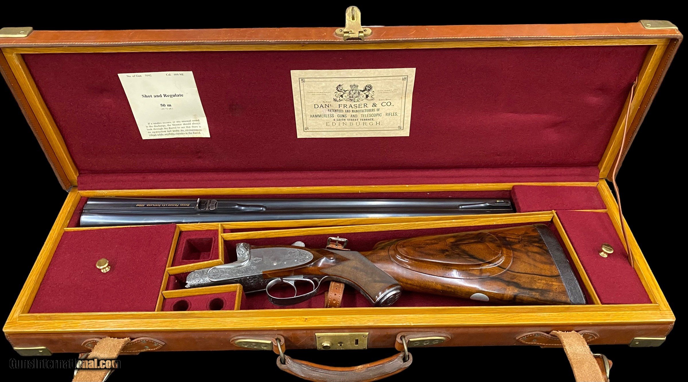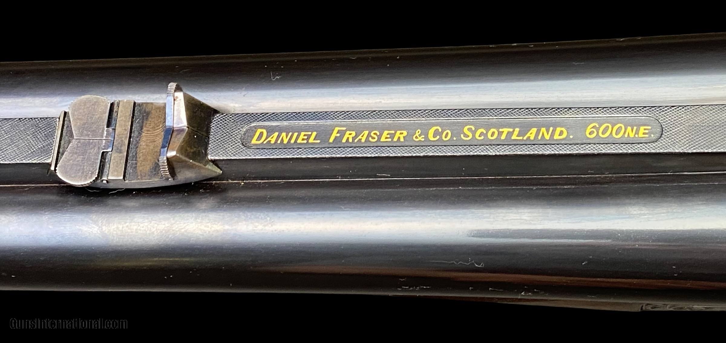Description: SOLD ---- THIS GUN HAS BEEN SOLD TO A SATISFIED CLIENT. ---- PLEASE SEE OUR OTHER FINE FIREARM LISTINGS. DANIEL FRASER & CO - SCOTLAND MODEL: DELUXE SIDELICK EJECTOR DANGEROUS GAME DOUBLE RIFLE CAL: 600 NITRO EXPRESS COIN FINISHED AND BOLSTERED LONG-BAR (57MM) SIDELOCK ACTION W/ BUSHED SET STRIKERS DEEP CHISEL AND BULINO GAME SCENE ENGRAVED BY WORLD FAMOUS GIACOMO FAUSTI AND HIS TEAM AT CREATIVE ARTS. FEATURES FINE BULINO RHINO ON LEFT LOCKPLATE, CAPE BUFFALO ON RIGHT LOCKPLATE, ELEPHANT ON ACTION BOTTOM, GIRAFFE ON TRIGGER GUARD. ACTION BOLSTER WITH DEEP RELIEF ENGRAVED ELEPHANT BUSTS EXTENDED TOP AND BOTTOM TANGS. DOUBLE TRIGGERS WITH HINGED FRONT TRIGGER ENGRAVED STEEL GRIP CAP WITH SIGHT TRAP 24.75" NITRO PROOFED BARRELS WITH QUARTER RIB W/ UNMARKED ONE STANDING, TWO FOLDING LEAF SIGHTS. ISLAND MOUNTED FRONT RAMPED SIGHT WITH SINGLE BRASS BEAD. NICELY DARK-STREAKED ENGLISH WALNUT STOCK W/ SHADOWLINE CHEEKPIECE AND LEATHER COVERED PAD. 14.5" LOP. WEIGHT: 12LBS 4OZ. CASED IN MAKER'S OAK & LEATHER CASE W/ ACCESSORIES. CONDITION: GUN IS IN NEW CONDITION SHOWING VIRTUALLY NO SIGNS OF USE LONDON QUALITY STOCK REPOLISH AND SCANT HANDLING MARKS. ACTION TIGHT. BORES CLEAR. GENTLEMEN, THIS IS A FINE AND RARE RIFLE FROM THE RENOWNED MAKER OF SCOTLAND. WITH ONLY A SMALL NUMBER OF 600 NITRO RIFLES EVER MADE WORLDWIDE, THIS IS ONE OF THE FINEST EXTENT!. PLEASE CALL NOW! FFL REQUIRED FLAT $100 S/H/I CARD FEE APPLIES. THIS RIFLE STANDS AMONGST ITS PEERS LIKE HOLLAND & HOLLAND, PURDEY, WESTLEY RICHARDS, RIGBY, JEFFRIES, VERNEY CARRON, KRIEGHOFF, MERKEL, FRANCOTTE, AND ALL OTHER FINE DOUBLE RIFLE MAKERS. . . SOLD Rifle Caliber: .600 Nitro Express Manufacturer: DANIEL FRASER Model: DELUXE DOUBLE RIFLE Ejectors: YES Condition: EXC Metal Condition: EXC Wood Condition: EXC Bore Condition: EXC Action: SLE Triggers: DOUBLE |