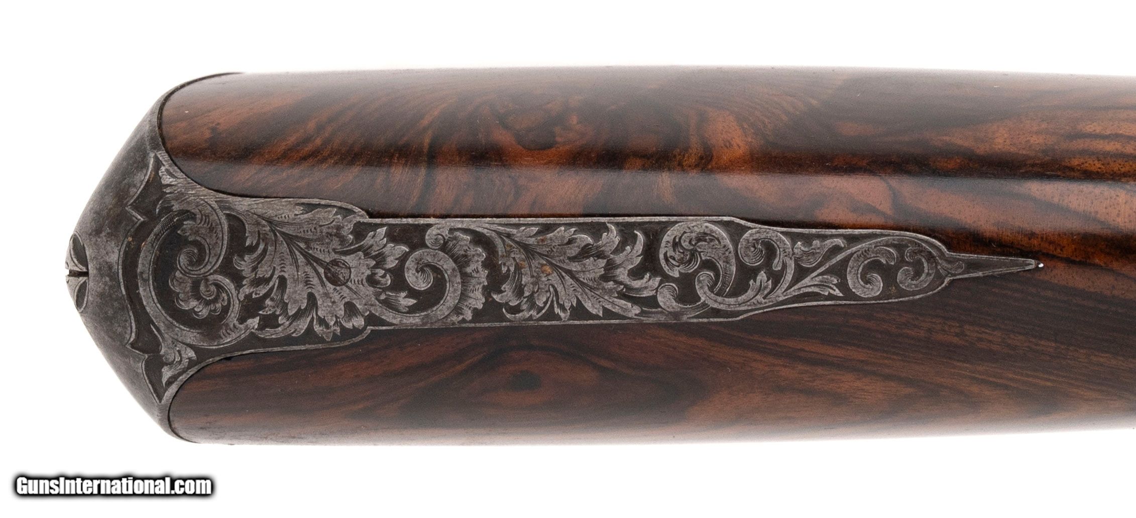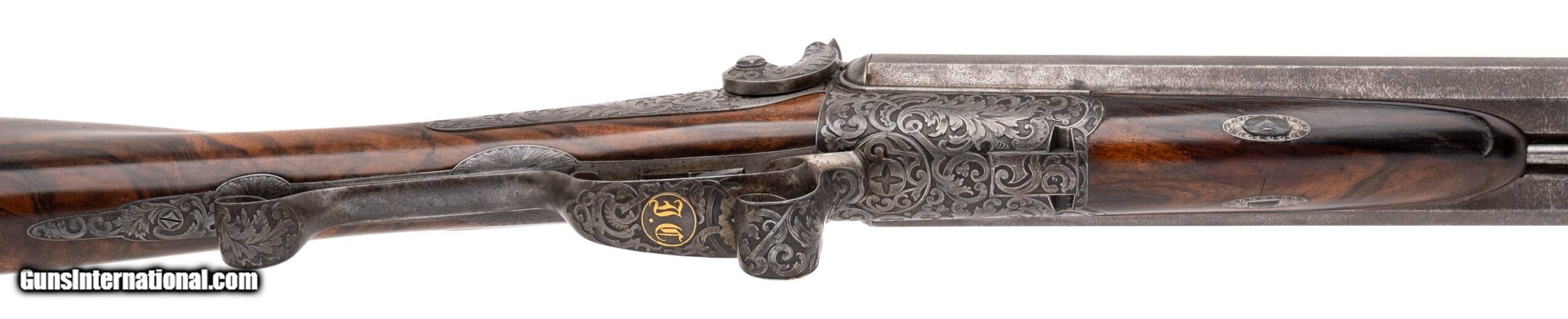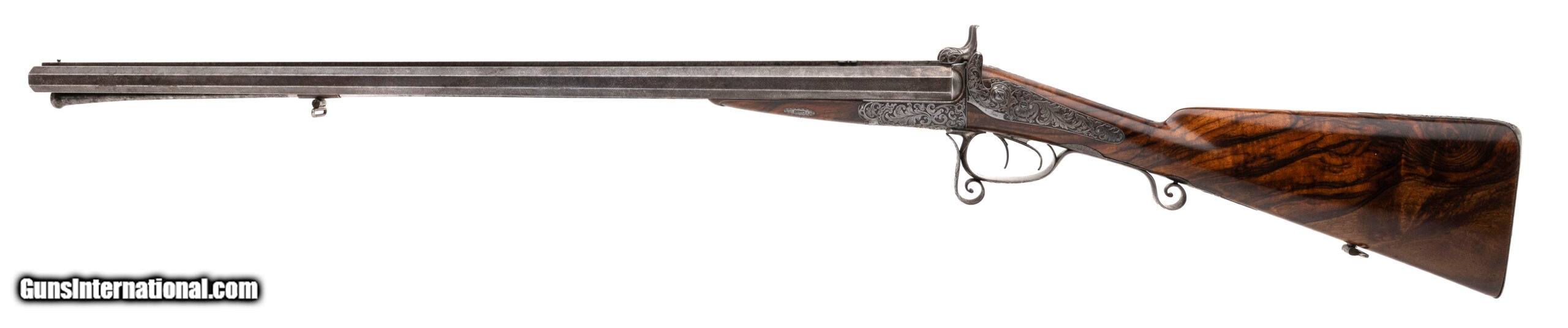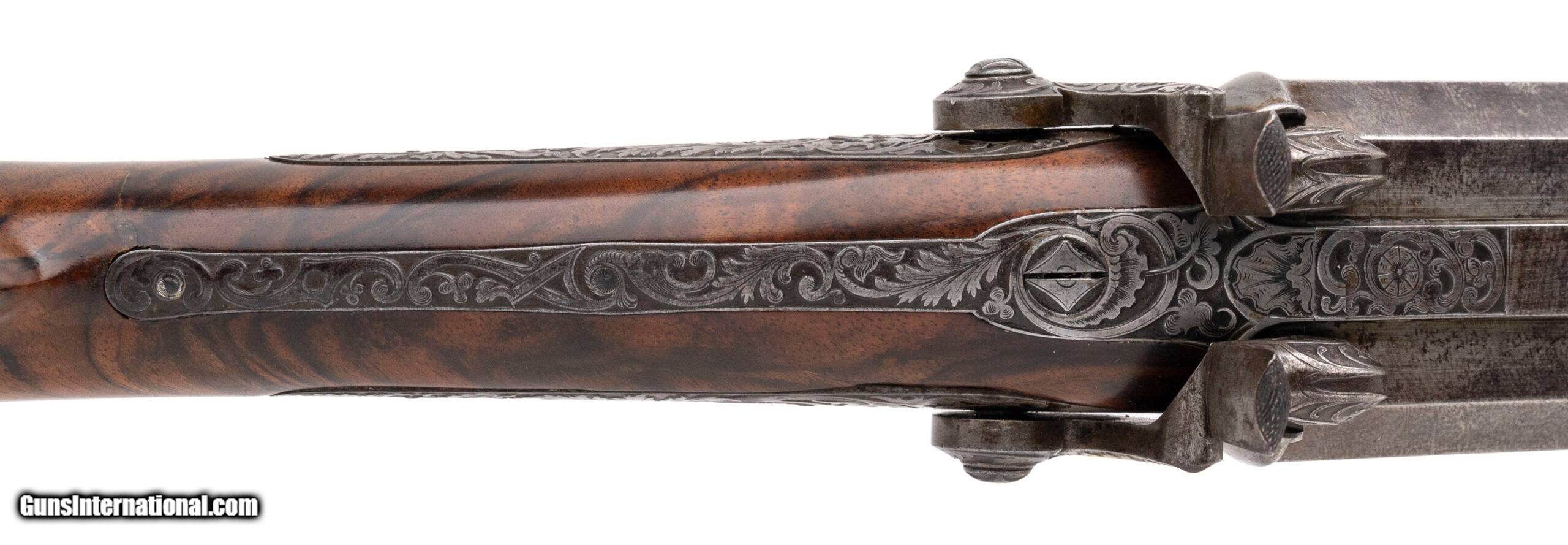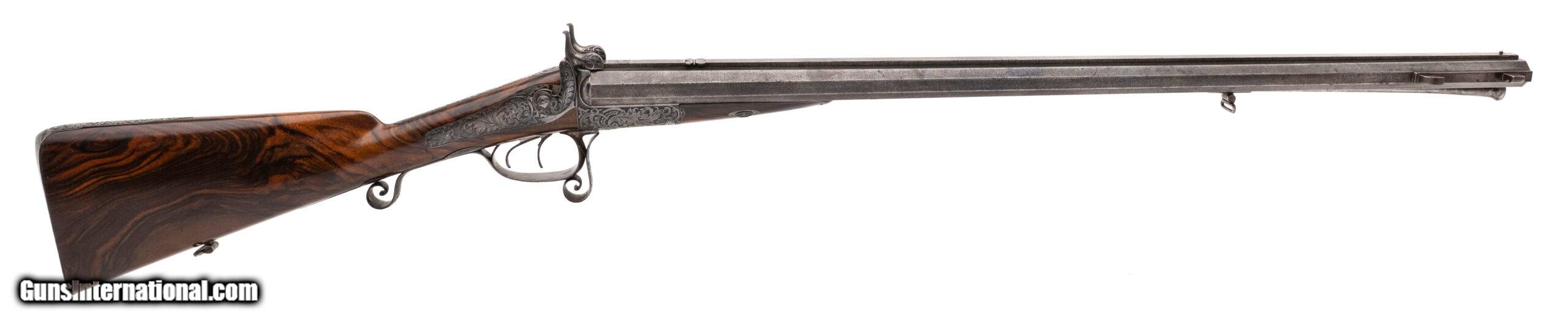 Description: "Made circa 1845. 68 Pinfire Caliber with 27.5" barrels The barrels are octagon and have a Damascus pattern. The barrels have a dark gray patina. Interestingly the barrels have a provision for a bayonet. The action is chiseled and expertly done. Both the barrels and the locks marked “Beringer a Paris" The stock is burled Circassian walnut. The trigger guard has the initials in gold “D.C." This This gun comes in an original case . The wrist has been repaired. The interior is relined. Very fine early cartridge double rifle. Antique: Yes Price: $4,500.00 Contact Seller |