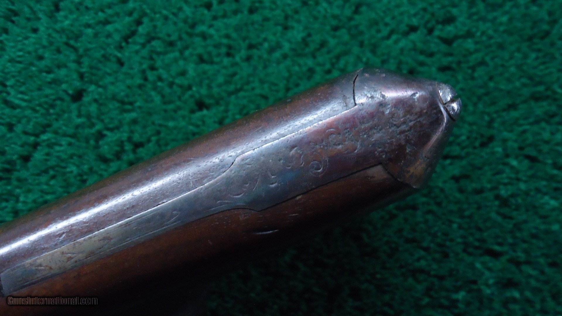 Description: Fairly decent rifling and decent action. Rib is marked "Tambor". Original ram rod as well as sling swivels. Wooden patchbox with sliding cover. Checkered wrist with fairly sharp checkering. Nicely engraved. Back action lock with game scene on each. Shotgun style buttplate. Good mechanical condition. Wood shows a fair amount of use but still sound. Barrels have visible Damascus pattern. Stationary sights. Unique tang sight is fully adjustable. Leroy Merz Antique Firearms specializes in antique and vintage Winchesters and other fine American firearms. Since 1965 Mr. Merz has taken part in the world of firearms and has been a contributor to many well known reference books. We have hundreds of additional guns in every price range at our home online. Search for Merz Antiques in google. SOLD Antique: Yes |