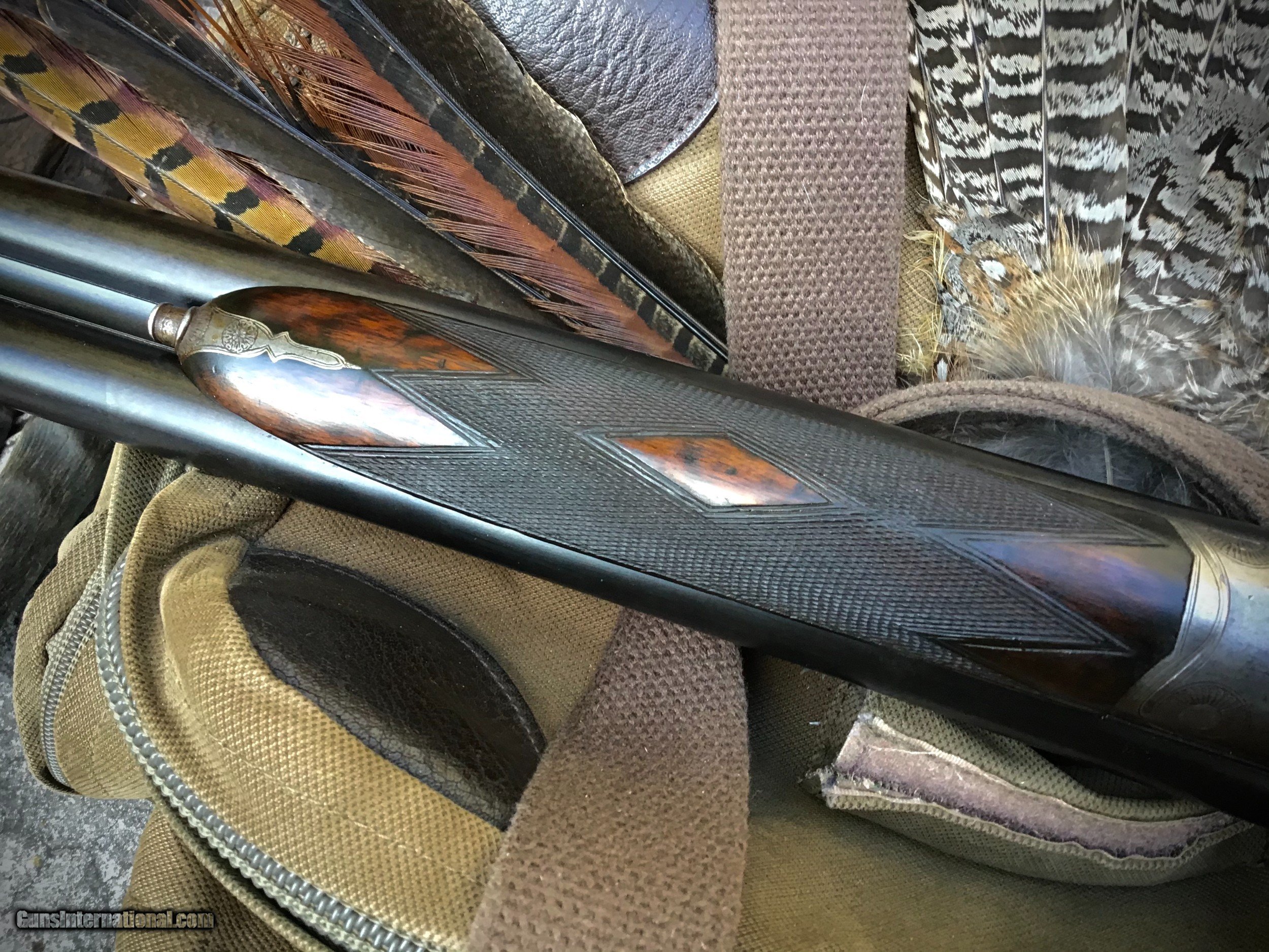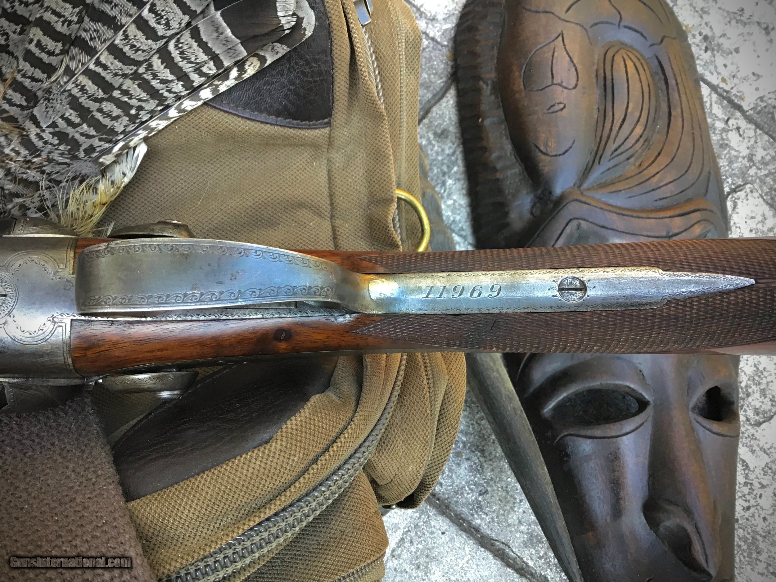 Description: (FULL OR PARTIAL TRADES CONSIDERED AGAINST QUALITY SCOTTISH AND IRISH SHOTGUNS & RIFLES -- CENTERFIRE, HAMMER OR PERCUSSION) DESCRIPTION: 12 bore; 2 1/2" chambers; black powder proofed; 28" steel barrels; short sight rib with blade bead fore-sight; 2 flip up rear sights marked for 50 & 100 yds; toplever opener; side-clips; elongated top strap extending over comb of stock; rebounding back-action island locks with dolphin hammers; very light scroll engraving to borders of all furniture; HOLLAND & HOLLAND engraved to both locks; straight hand stock with 14 1/2" LOP to thin ebony butt plate; fore-end with Anson push button release; weight approx 7lb 11oz. CASE & ACCESSORIES: Original leather case in fair to good condition; no key; handle requiring replacement; interior with blue velvet lining, H&H trade label, and most original tools including H&H bullet mould, combo powder funnel/star crimper/case re-sizer, wad cutter, handheld priming tool, and basic cleaning accessories. Modern custom-made bullet sizer measured/matched to this gun's bore diameters and serial numbered to gun. CONDITION: Overall in very good mechancial working order & condition. Barrels professionally re-blacked but not polished; barrels crisply engraved HOLLAND & HOLLAND. 98 NEW BOND STREET LONDON. “PARADOX” FOSBERY PATENT’with no rubbing to lettering. Good bores with moderate pitting/marks (having no affect on shootability); min wall thickness 28 thou right barrel & 30 thou left barrel; Paradox rifling is sharp. Very slight traces of original case color-hardening to receiver. Possible minor spot repair at rear of trigger guard. Stock and forend exhibiting excellent condition, color, and checkering. PROVENANCE: Factory records for this gun show order by “Attwood” in May 1891 with finish date of October 1892. Prior owner in Australia claimed “Attwood” to be a member of the British Indian Civil Service and, while have been unable to confirm, gun case does exhibit some remnants of Hindi writing and certainly spent a good portion of its life in the sub-Continent. If you are looking for an honest, solid H&H Paradox to take afield for actual use here it is (priced to sell!). This gun is a shooter, throwing excellent patterns with both lead and bismuth shot (proven on pheasants and ducks) and excellent target groups with cast Fosbery slugs. Full load data and sample targets provided with gun. Antique / No FFL Required. SOLD Antique: Yes |
