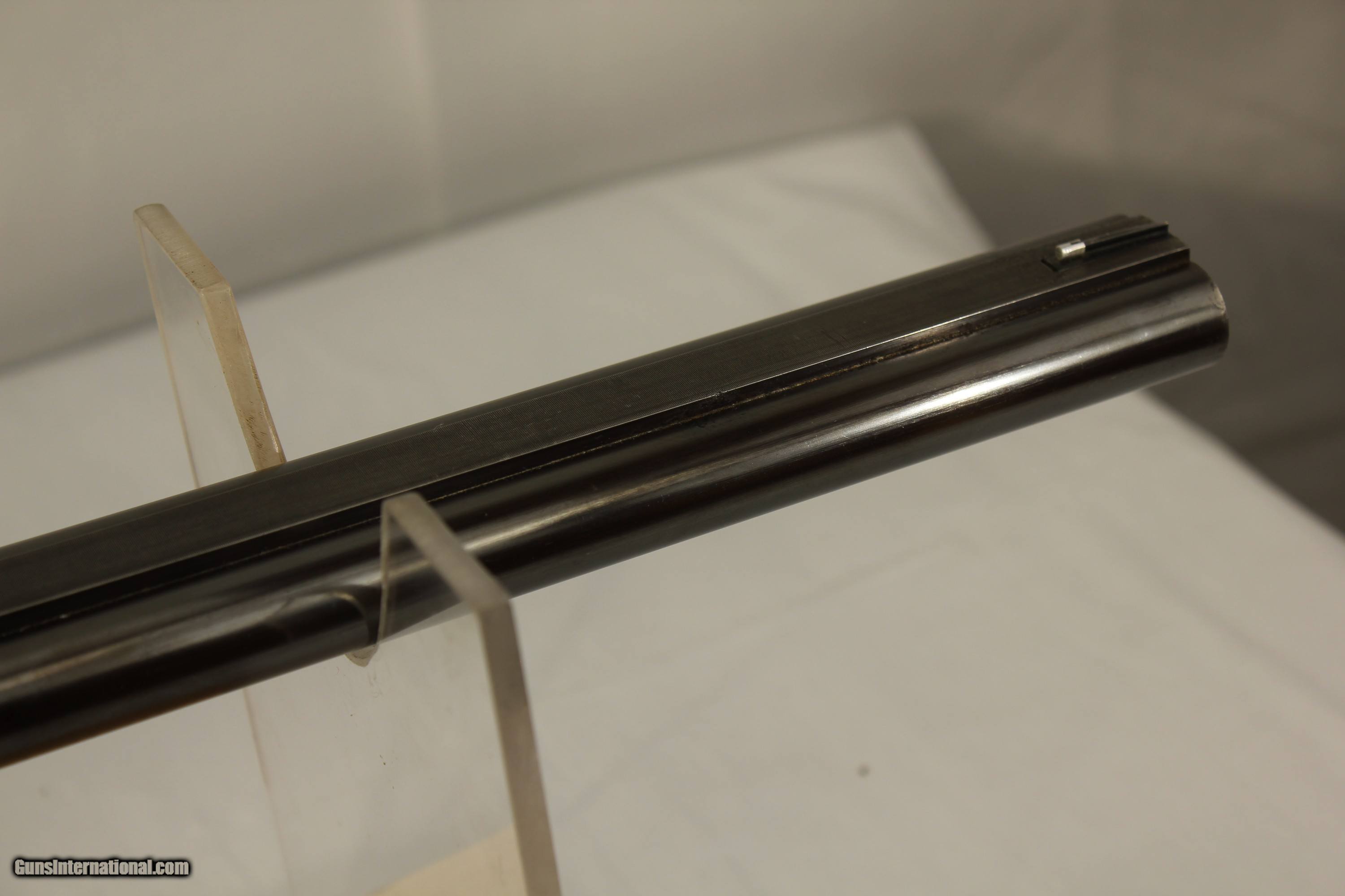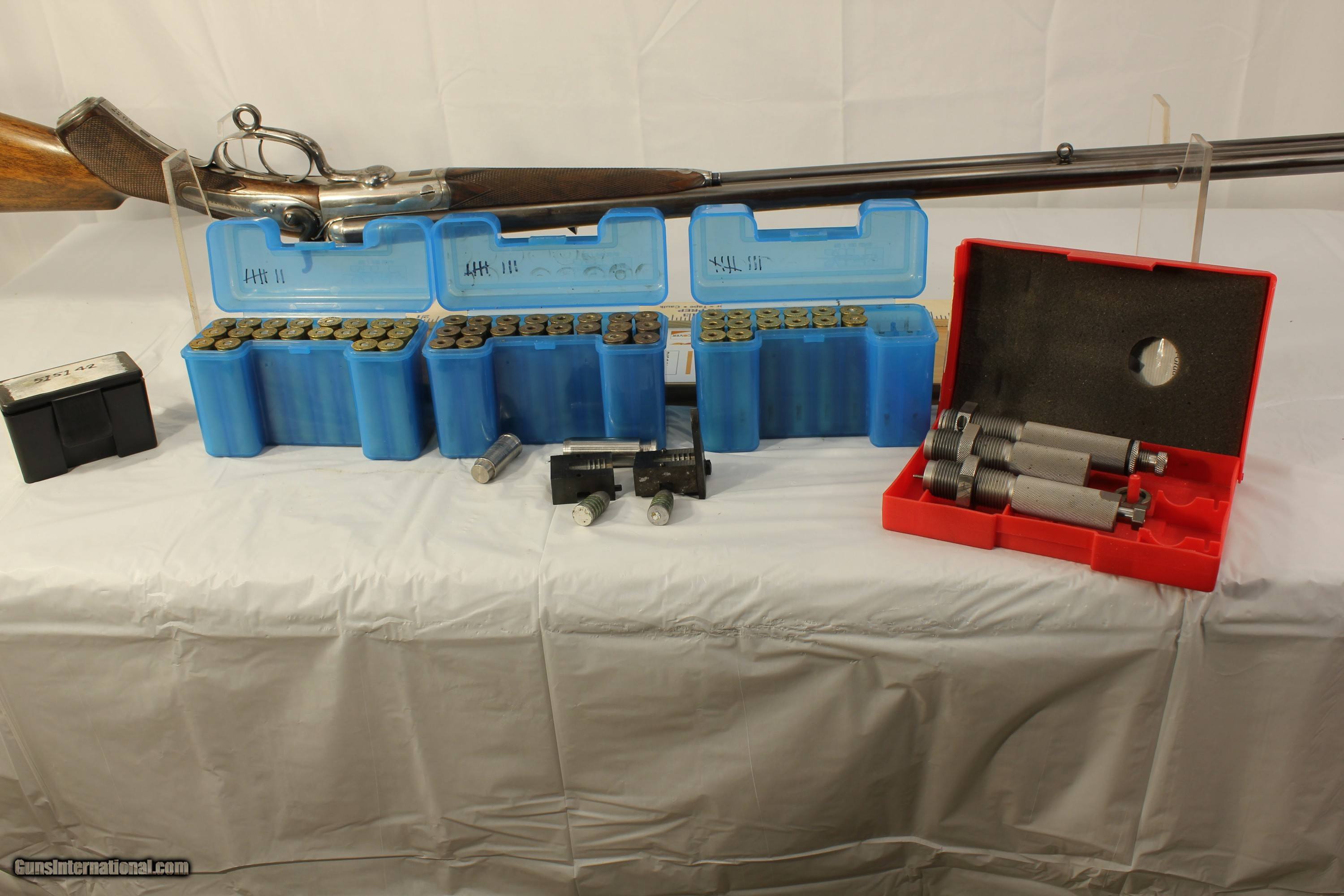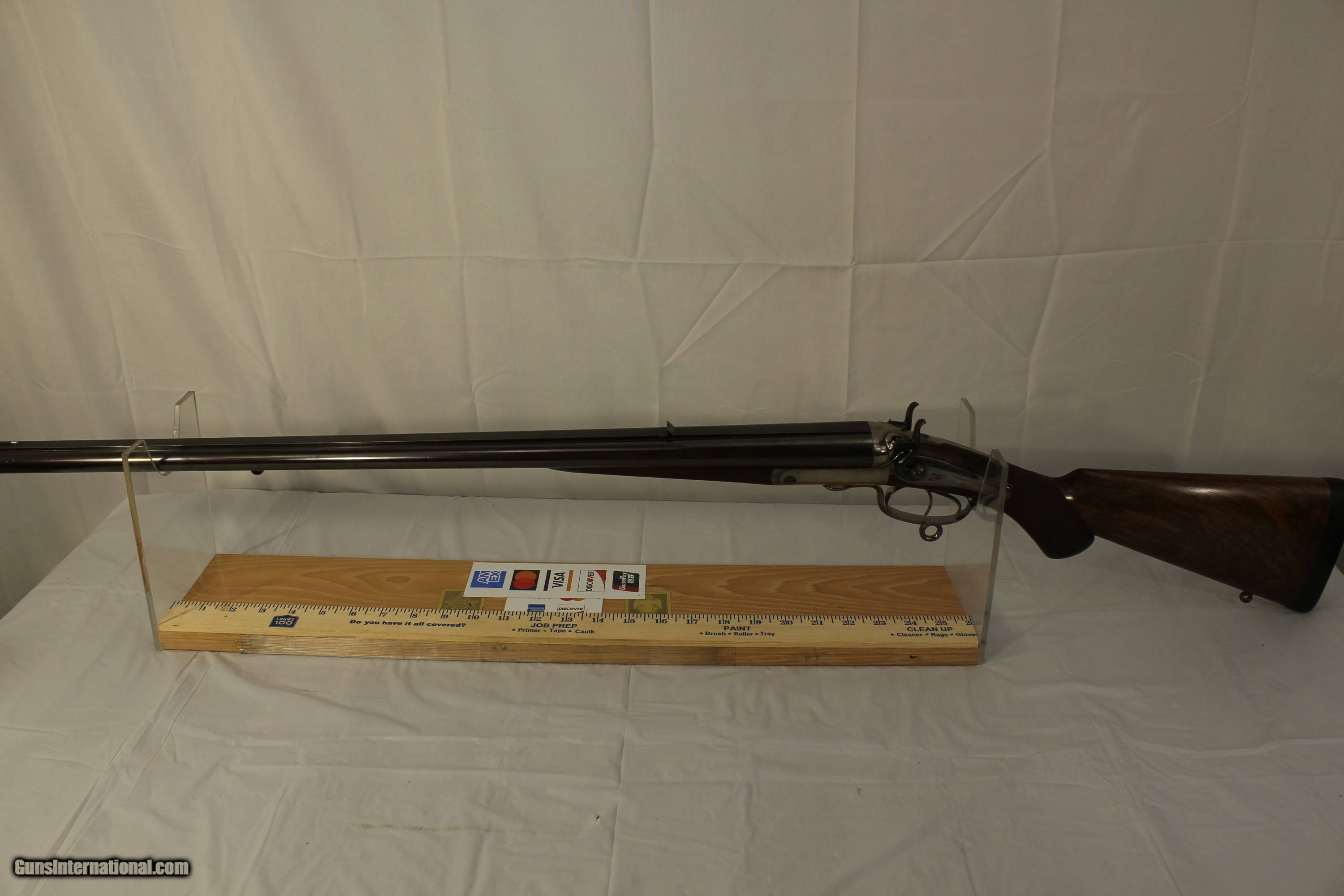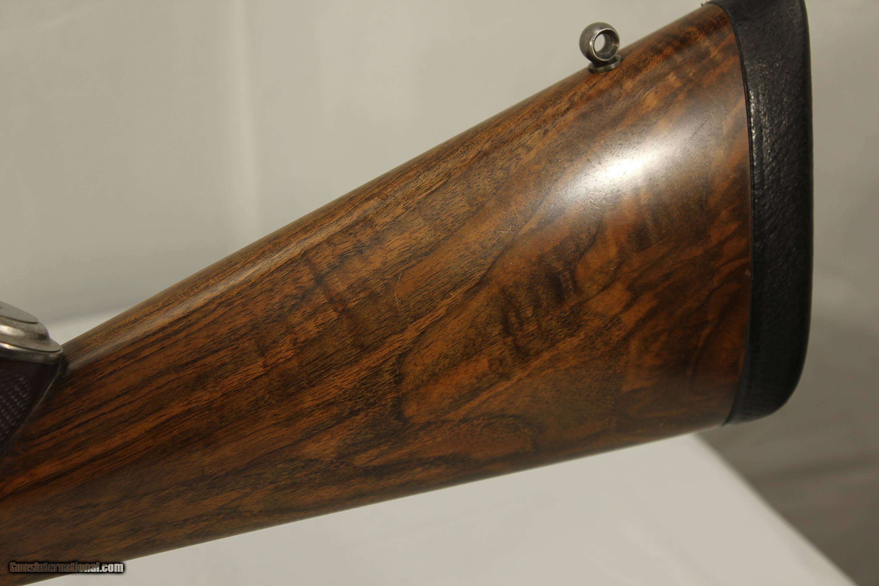 Description: This fine London England Double Rifle is in 500 3 inch BPE caliber. It comes with what may be the original leather case. It has 28 inch barrels with bright shiny Henry Rifling. It is an unusual gun as it has never been engraved. Very unusual for London high quality guns. It has very nice wood. The case contains a three piece wood cleaning rod and a period sling. The gun also comes with 34 brass cases, a Lyman bullet mold, a bag of .510 wads, a wad cutter and a set of Hornady Custom three piece loading dies With shell holder. There is also a factory letter stating that the gun was made in 1880. My scales weigh the gun at 9 pounds 2 ounces. The barrels have been reblacked some time in the past. It has a Jones underlever action and is tight as a drum. A fine gun for the range or field. This was considered a medium bore in its day. Antique No paperwork required. $100.00 shipping via Priority Mail SOLD Antique: Yes |