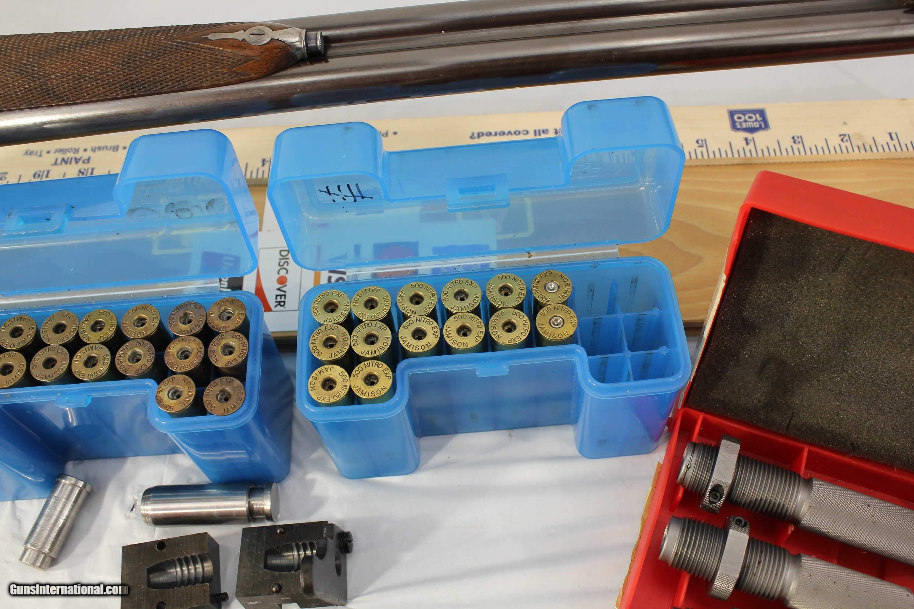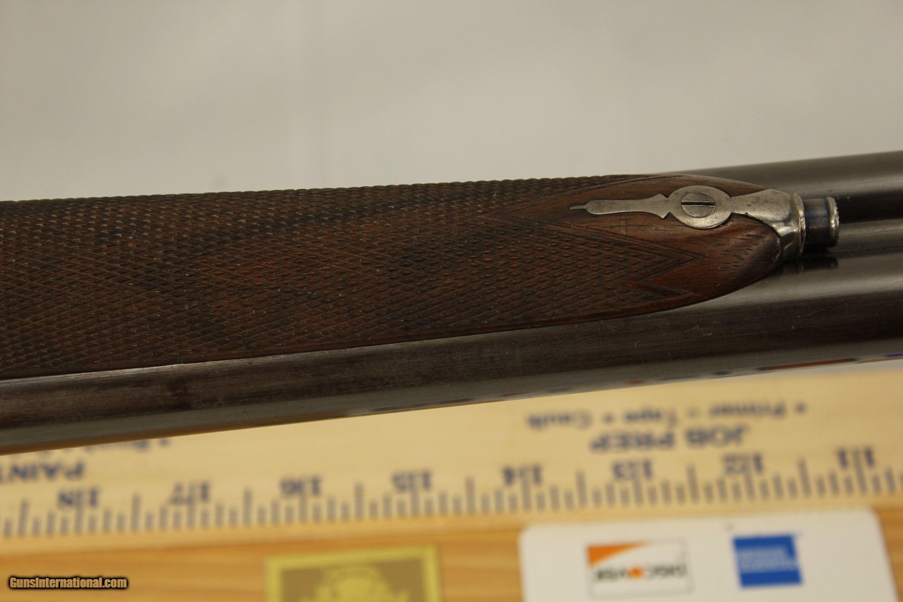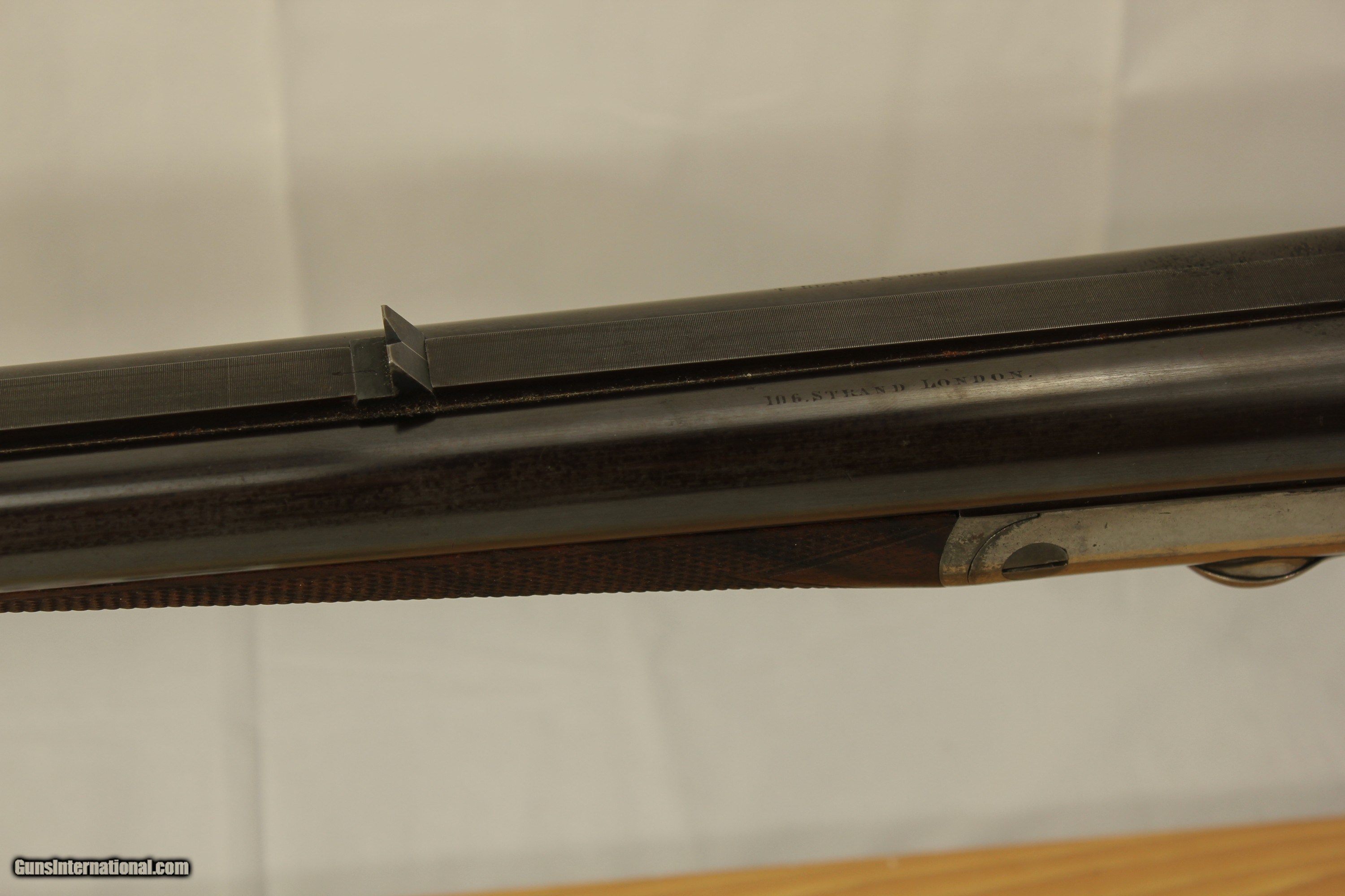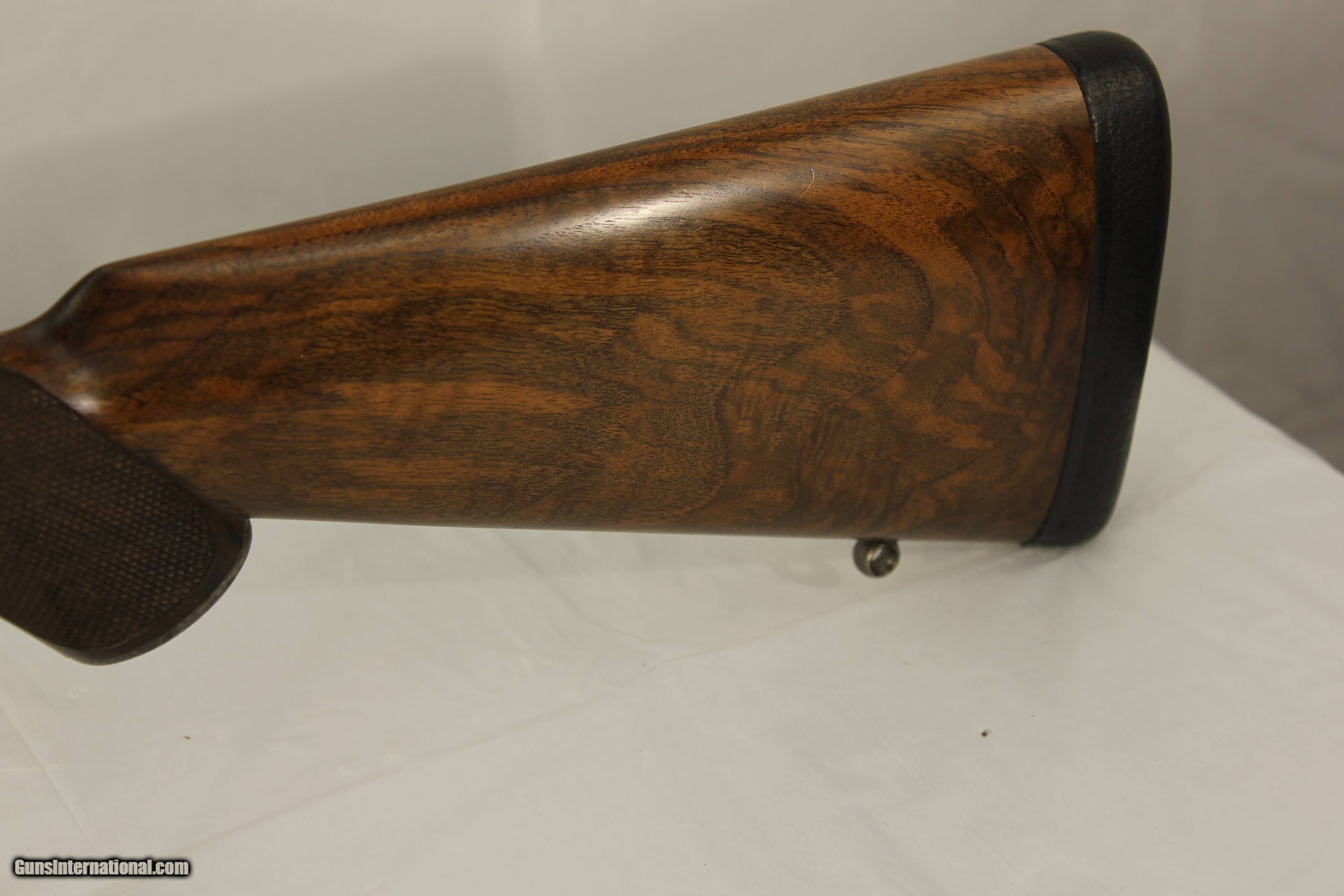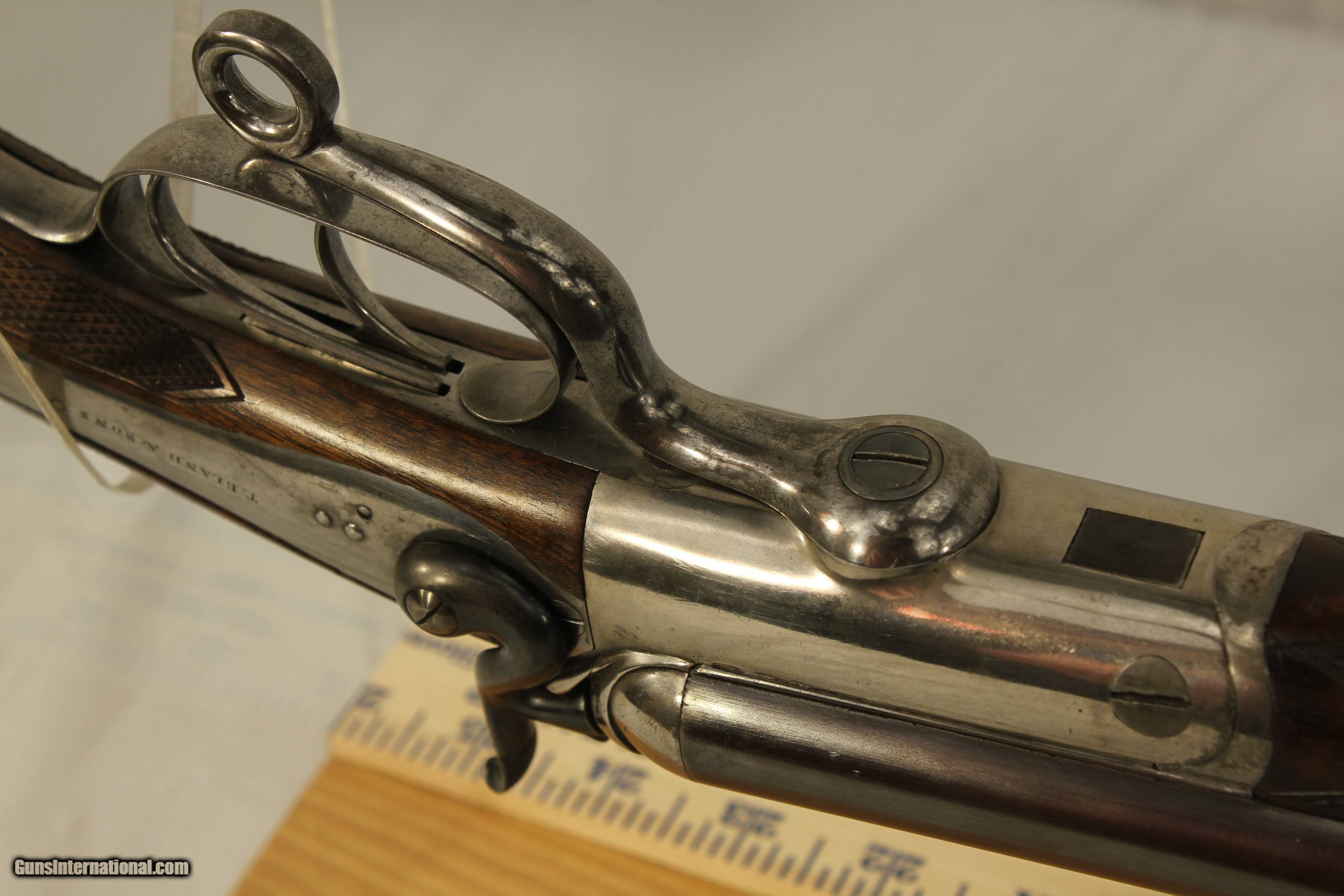 Description: This fine London England Double Rifle is in 500 3 inch BPE caliber. It comes with what may be the original leather case. It has 28 inch barrels with bright shiny Henry Rifling. It is an unusual gun as it has never been engraved. Very unusual for London high quality guns. It has very nice wood. The case contains a three piece wood cleaning rod and a period sling. The gun also comes with 34 brass cases, a Lyman bullet mold, a bag of .510 wads, a wad cutter and a set of Hornady Custom three piece loading dies With shell holder. There is also a factory letter stating that the gun was made in 1880. My scales weigh the gun at 9 pounds 2 ounces. The barrels have been reblacked some time in the past. It has a Jones underlever action and is tight as a drum. A fine gun for the range or field. This was considered a medium bore in its day. Antique No paperwork required. $100.00 shipping via Priority Mail SOLD Antique: Yes |
