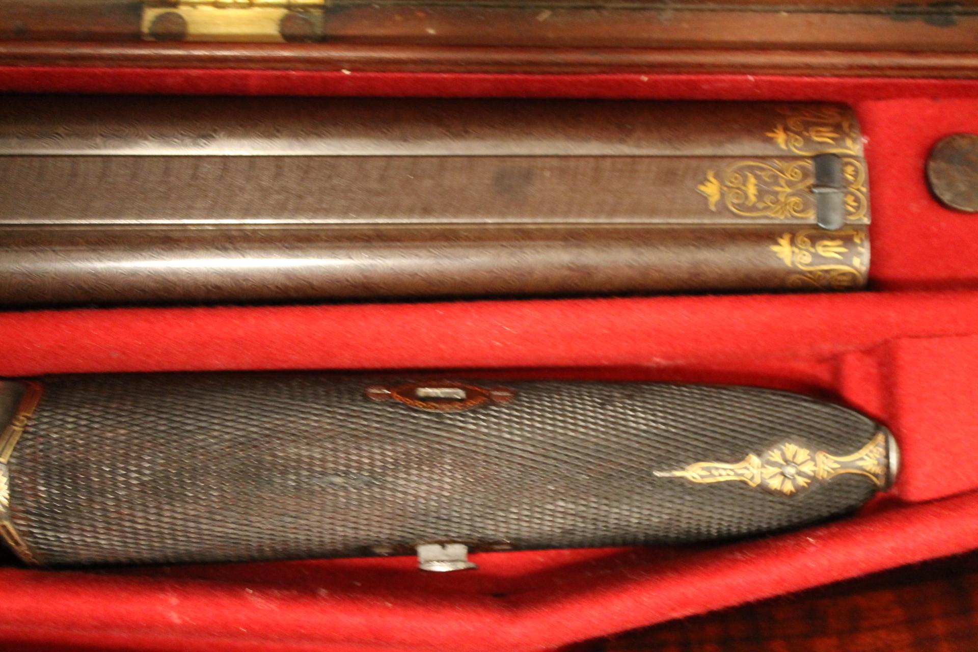 Description: An extreemly rare Manton 16 Bore 2 1/2" case Howdah double rifle. The 19 3/4" damascus barrels have fully rifled bores that are in excellent condition and the barrels have almost all the brown finish (probably redone years ago). The pull on the very fine condition stock is 14 3/8" and has a cheekpiece. The grip cap is Gold inlayed and of steel, as is the buttplate. The barrels have three sights, 100, 150 and 200 yards. The excellent condition forend uses a cross pin and the locks are non-rebounding. The action is a Jones underlever and locks up as new. The rifle appears to be little used. About 95% of the Gold inlays remain. This was the most prized rifle of the late gun dealer Thad Scott. In almost 50 years of collecting English black powder double rifles I have only seen two other Howdah double rifles. They are much more scarce than Howdah pistols! I had a Master Engraver from the Firearms Engravers Guild of America look at the rifle and he said he wouldn't even guess what it would cost to reproduce the engraving but it would be many thousands! He charges $100.00 per inch for Gold inlay lines, let alone the intricate scroll work! Weight is about 9 pounds. Cased in a period Mahogany brass cornered case with period correct bullet mold, powder measure, capper/decapper and chamber brush. The tools have FAUX Ivory handles. There is also a Gold plated screw driver. In Cal Pappas's British Bore Rifles there is an exact duplicate of this rifle in it's original case with tools in the 16 Bore section. That rifle is located in Alaska. SOLD |