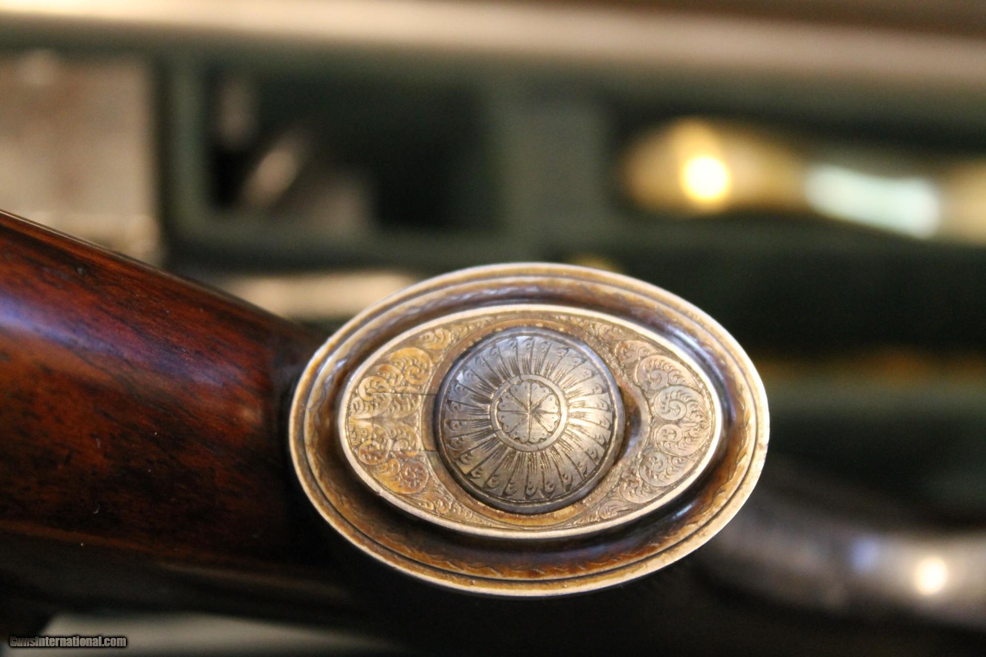 Description: .450/.400 2 3/8 BPE Alex Henry double rifle made for R B Rodda Company of Calcutta. In its original Oak and Leather case with many reloading accessories fitted to the case, as was common with best quality Henry rifles. Approx 30% muted case colors and 90% I believe original brown on the 28" damascus barrels. The rifle looks like it was very seldom used and is in excellent condition. Bores are in superb condition with Henry rifling. Very minor bruising on the beautifully figured stock. Full engraving is in as made condition and the checkering is crisp and never touched! Barrels have one standing and one flip up sight and are in excellent condition. Usual shadow lined cheekpiece. Weight of rifle is: 8lb 6.2 oz. barrels weigh 4lb 11.6 oz. Pull from front trigger is: 14 1/8". Interior of case is in very very good condition with original green baize lining and R B Rodda & Co stamped in Gold on the interior case lid. Case is SOLID inside, Exterior shows some wear, but is in very good condition. This Henry cased set is extreemly rare and in this condition even more so! No buggered screws or evidence of any tampering or abuse. I would guess this was in a Maharaja's armory. Locks up very tight and is dead on the breach face. Alex Henry rifles were at LEAST the equal of Holland and Purdey in quality.One of the finest Henry examples left! SOLD Antique: Yes |