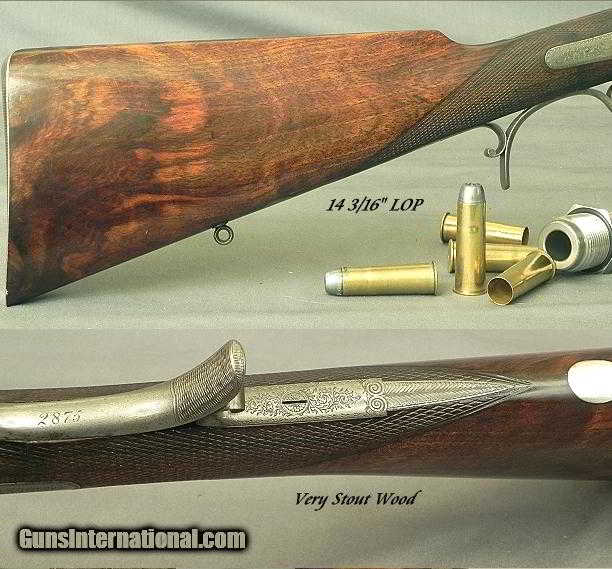 Description: #2875, Boss & Co., 73 St. James's Street, London: A Very Rare and Very Unusual Boss .577 Snider Back Action Underlever Non-Rebounding Hammer Double Rifle that was Made in 1870 for W.J. Leigh, a Member of Parliament; That's correct, a Boss Double Rifle that is only 1 of 75 centerfire rifles made from 1858 to 1890 and of all things in a .577 Snider; 29" Damascus fully rifled barrels by John Portlocks & marked accordingly with a "JP", Full length rib with 1 standing & 3 folding platinum lined rear sights at 50 - 100 - 150 & 200, Percussion style fences, Sliding hammer safeties, Full length trigger guard tang with an integral pistol grip guard bow with a checkered face, Very solid and sound wood with nice color & contrast, No cheekpiece, Sling eyes, Cross wedge forend release, Great stock length at 14 3/16" LOP over an engraved and full face checkered steel buttplate, Overall it comes out at 14 3/16 x 1 1/2 x 2 1/2" and points like a dream, Great weight at 9 Lbs. 3 Oz., This is a full rifled set of barrels and the bores remain very good plus with sharp lands the entire way, There is light pitting in front of the chambers but in no way problematic, Very nice wood and it is in very solid condition in every respect, Very nice color & contrast; 80% coverage of period Boss scroll engraving by John Thomas Sumner including the top strap, lever, trigger guard and forend, The barrel brown is 95% with all barrel markings as sharp as day one, The stock finish at 90%, The checkering is at 85% and I don't believe it was ever touched up, All the screws are in excellent shape and nearly everyone lays north & south including the 3 inside the forend, This is flat one good looking and extremely solid rifle in every respect from metal to wood with very good bores. Here is first rate Boss quality double rifle with style, grace, workmanship, handling and Boss romance from a great period at the pinnacle of sporting guns in the late years of the 19th century. This is an accurate rifle that shoots a .577" diameter 450 grain bullet with 30 grains of 4198 at 1,315 fps at 1,727 foot pounds of energy with virtually no recoil. This is very unusual and rare stuff here and it could be the only .577 Snider ever built by Boss. From 1858 to this day Boss only built about 100 centerfire double rifles. //////////////////////////////////////////// Mr. William Boss began his Gunmakers apprenticeship in 1773. He worked under Joseph Manton, a leading gunmaker of the time who employed only top-rate journeymen, of whom William Boss was considered one. During this period, Boss had three sons, who in time would follow in his footsteps and each be apprenticed to their father. Thomas Boss established his reputation as a top gunmaker. Thomas Boss worked for Joseph Manton, one of the greatest Gunmakers of that period, before leaving and starting Boss & Co. in 1812. When Thomas Boss died, the company was acquired in 1891 by John Robertson. John Robertson was responsible for two of the greatest creations by the firm; in 1909 the Boss low profile Over and Under shot gun, and in 1894 the Boss single trigger which was one of the first truly reliable single selective triggers to be made anywhere. Boss & Co. have produced guns of the highest quality for over 200 years. Today, their guns are still built in London, to those same high standards, by skilled craftsmen using the methods honed by their predecessors. Check them out at bossguns SOLD Antique: Yes |