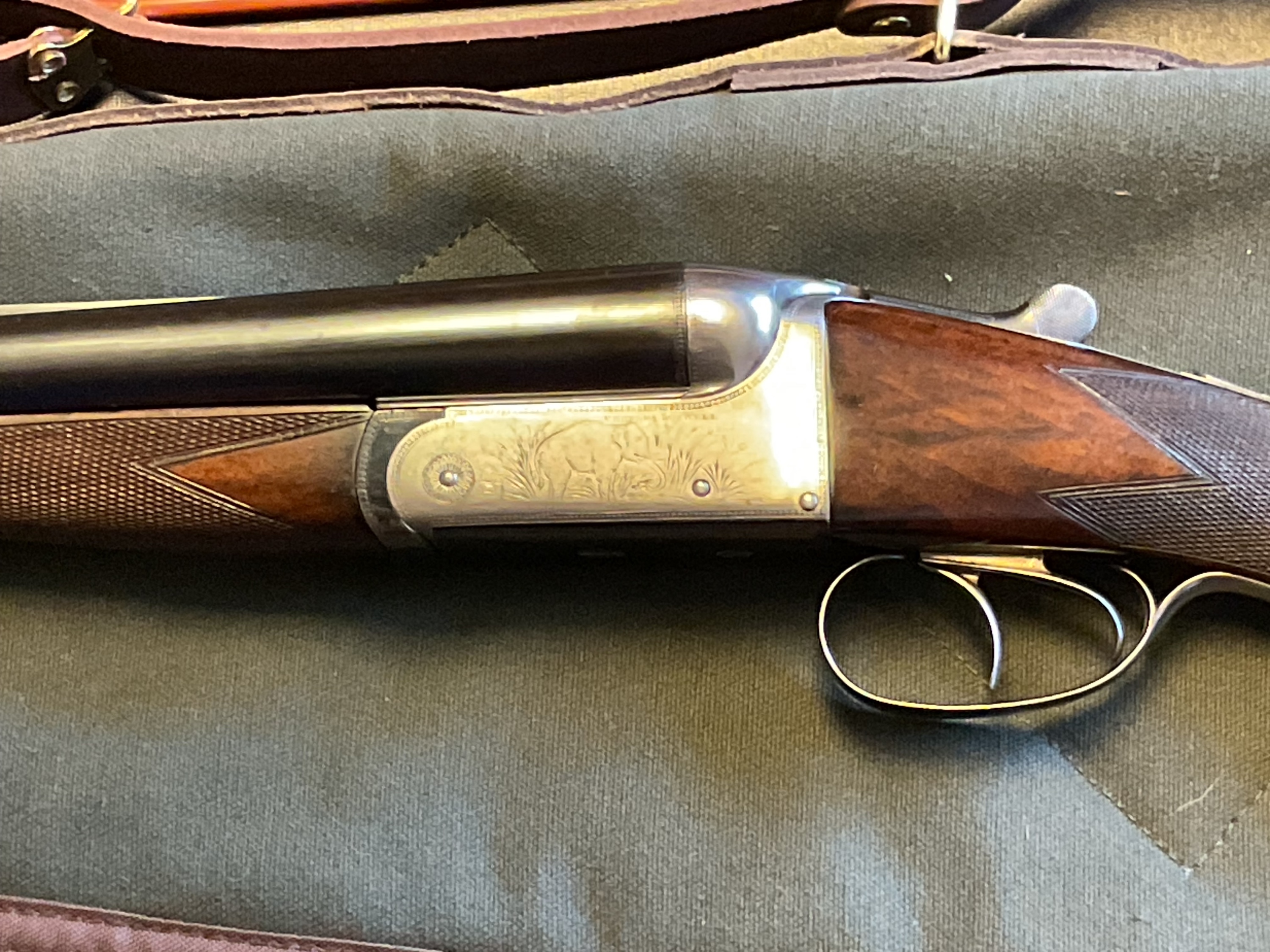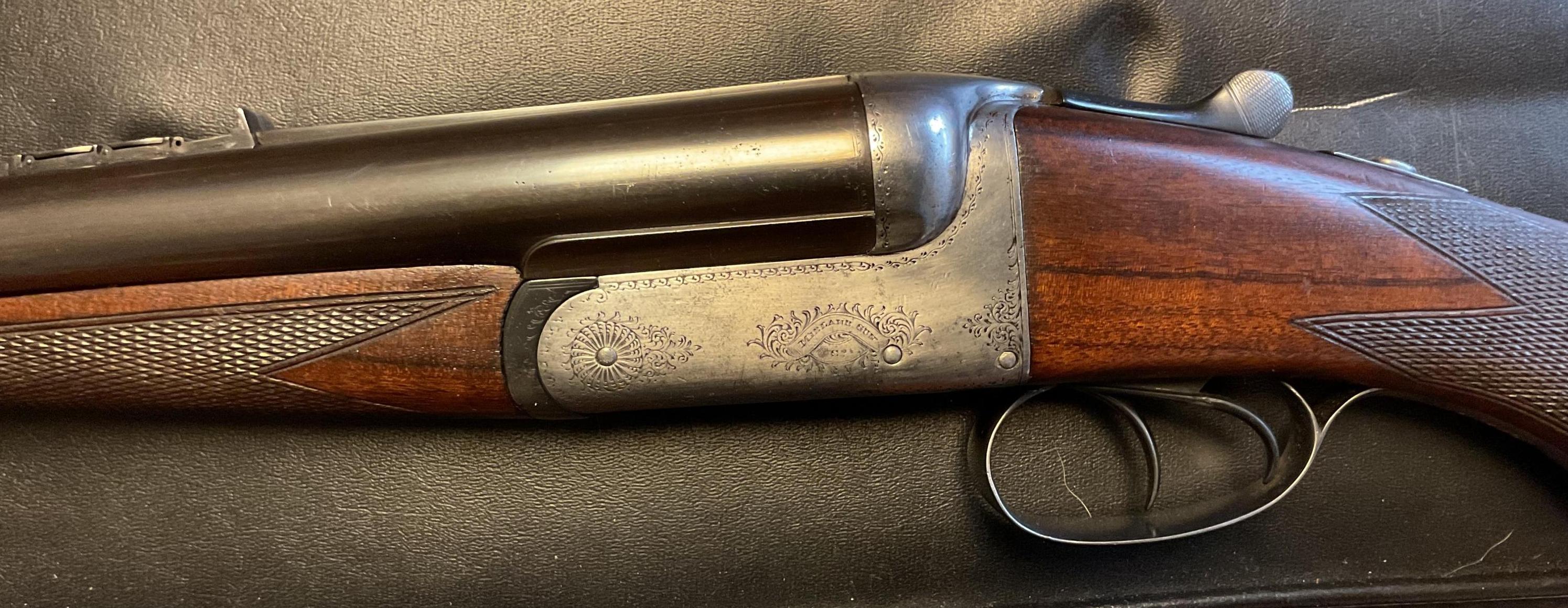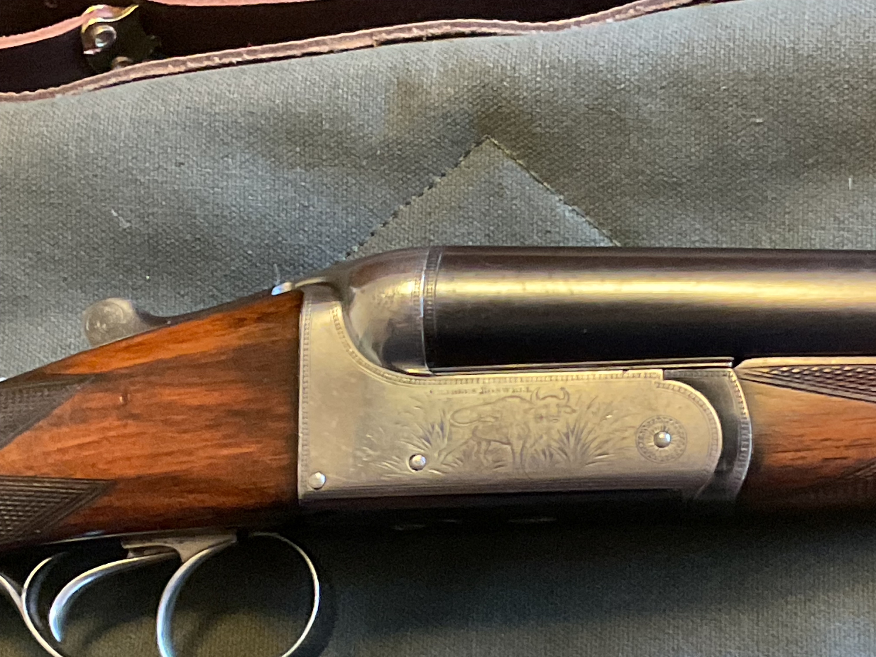 Boswell double barrel sys rifle in .450#2, extractors, disc set strikers, made in England, bore excellent, rifle 99% condition. Game scene engraved on sides and bottom. I would include some brass and some loaded ammo.
