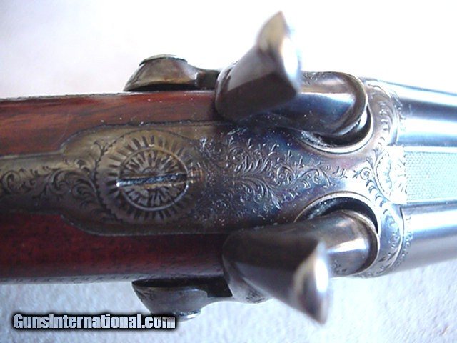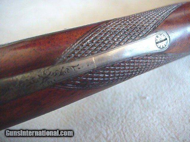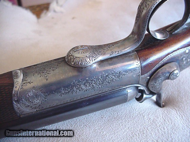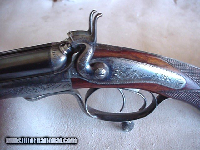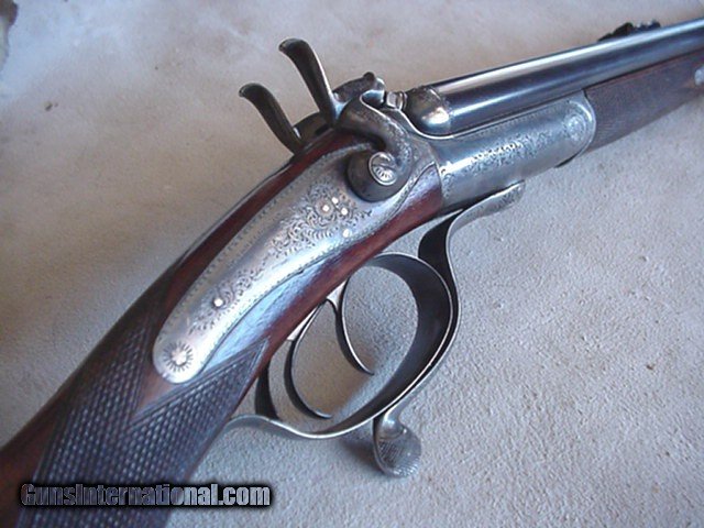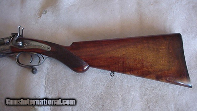 Description: This Braddell & Sons double rifle is chambered in 360 x 2 1/4 and shoots a 242 grain lead bullet. It has 7 groove Alex Henry style rifling, and may have been made by that great maker, although it appears to be more in the style of Rodda & Co. The bores are in excellent condition, with a 1 in 32 R H twist. The locks are marked J. Stanton on the inside, and numbered 1371 (R) and 1372 (L). The serial number on the 27" barrels is 3161. The rifle weighs 7 lb. 4 oz. empty and has black powder proofs only. I would guess it was made between 1880 and 1890, however I can't find much information on Braddell & Sons Belfast in any of my books. The overall condition is very fine, with evidence of an old repair to the top tang and the trigger guard (visible in the photos). I have about 50 pieces of new brass and a box or two of lead bullets which go with the rifle. Please call me, Peter Morgan 406 842 7655 for more info. Thank you. SOLD Antique: Yes |