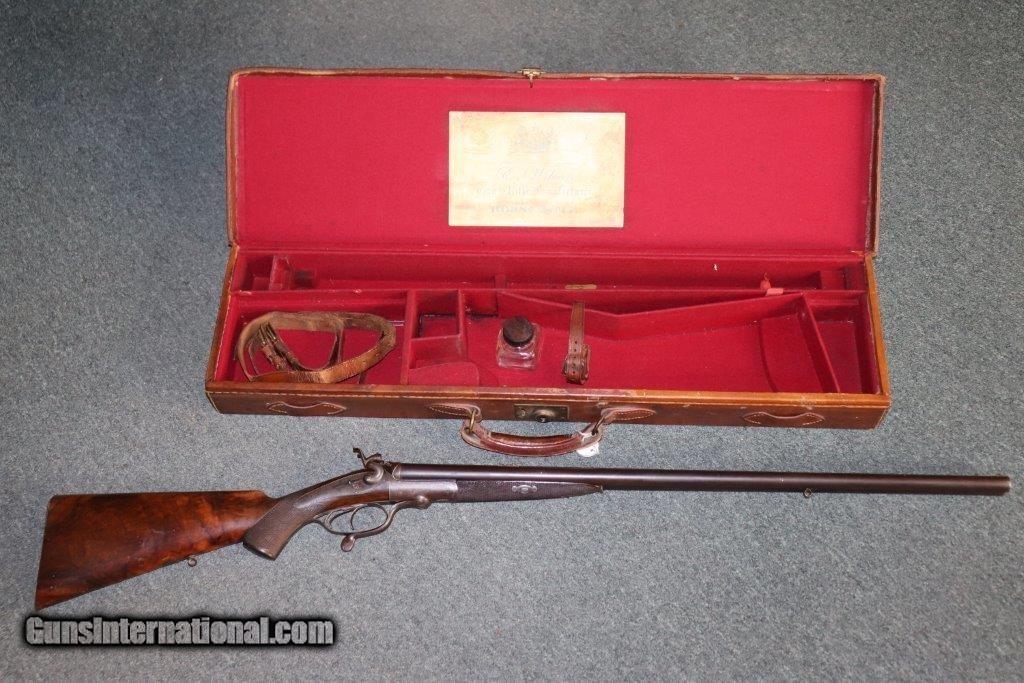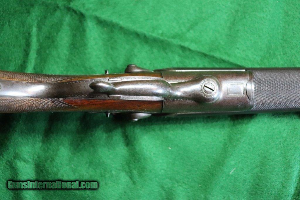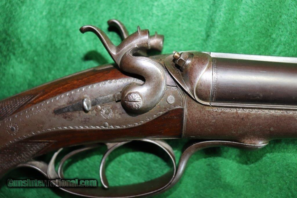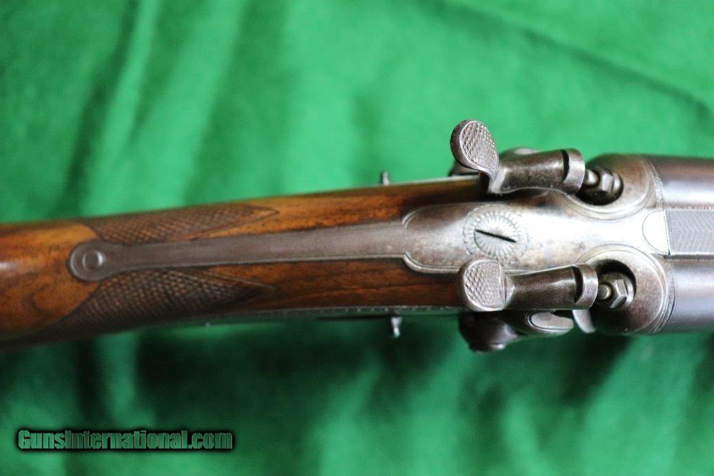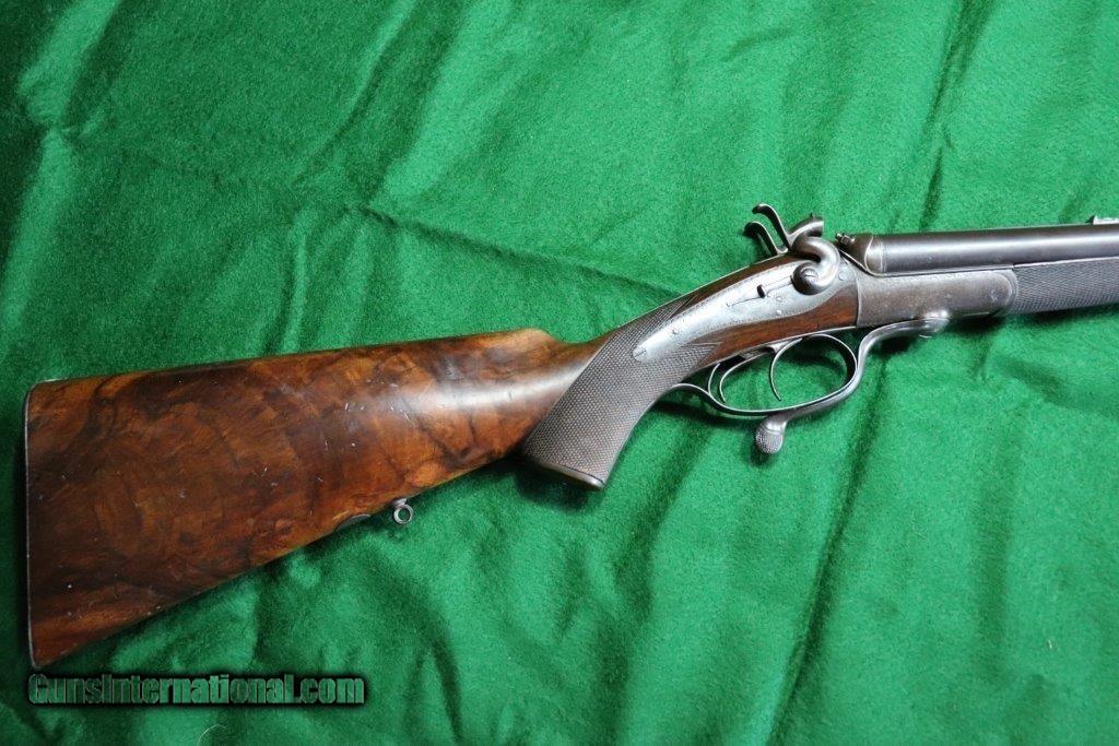 Description: Rotary underlever double barrel hammer rifle. No visible serial number. 28" black powder only barrels with raised matt rib. 3 leaf rear sight and blade fore sight. Rifling is sharp with a few minor pits. Rib engraved "E.WILSON MAKER HORNCASTLE. Jones patent rotary underlever, carved percussion fences. Non rebounding hammers with back action lock stalking safeties. Border engraving, original finish changing to warm patina. 14 inch pistol grip stock, sling loops and steel butt plate. Weight 9 lbs Original leather bound hard case with oil bottle. Case straps are missing. SOLD Curio/Relic: Yes |