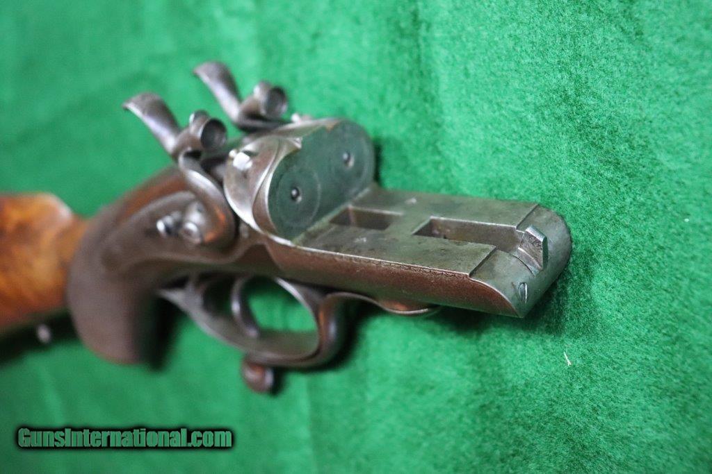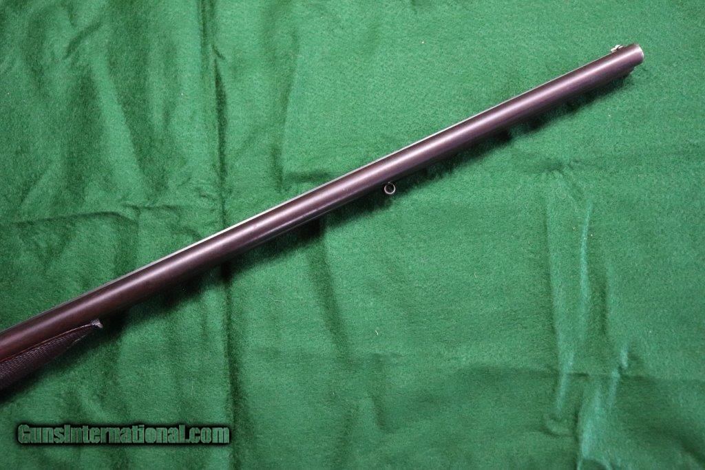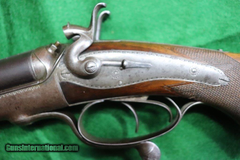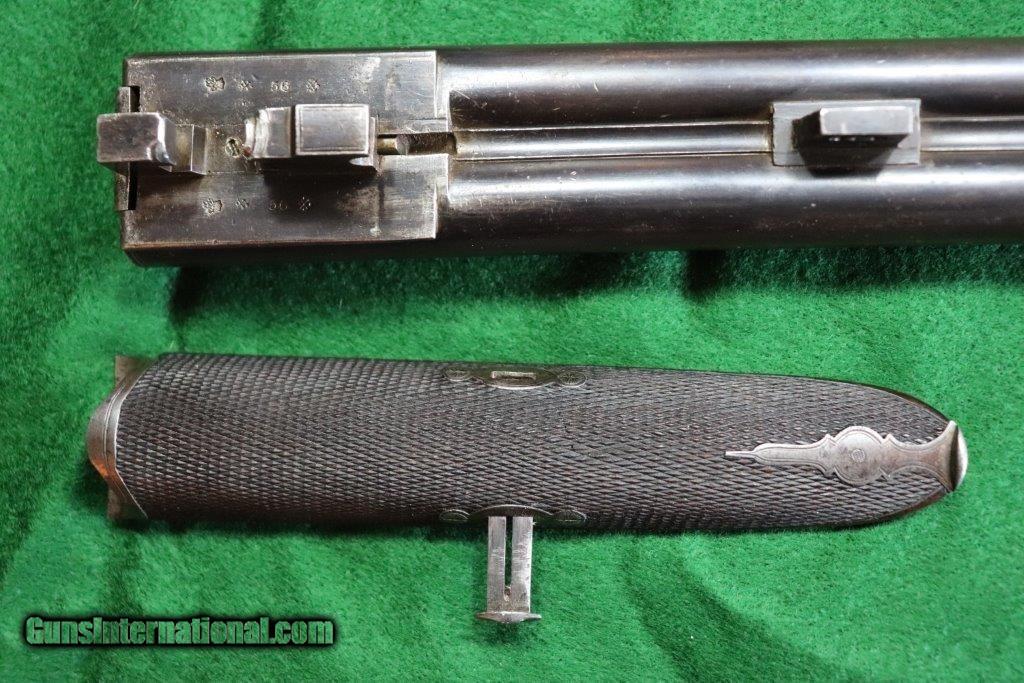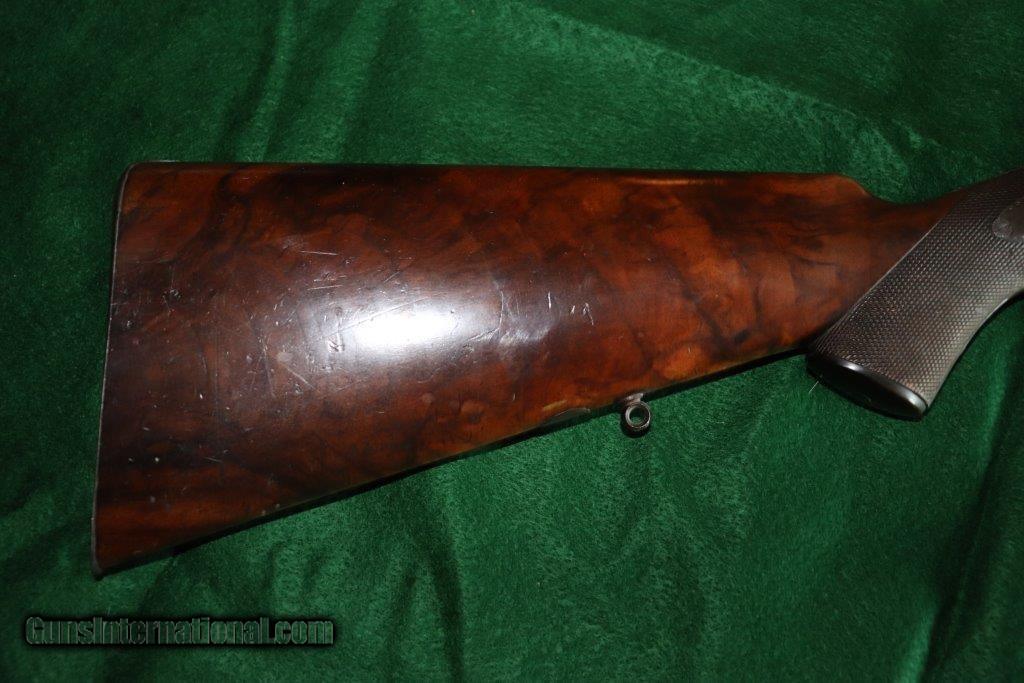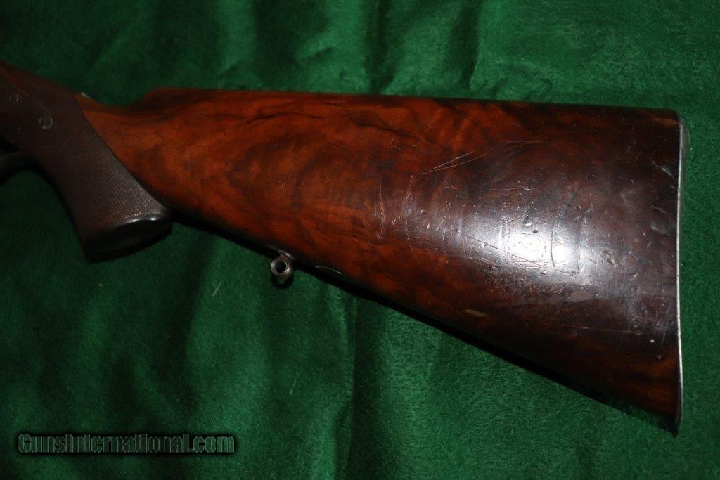 Description: Rotary underlever double barrel hammer rifle. No visible serial number. 28" black powder only barrels with raised matt rib. 3 leaf rear sight and blade fore sight. Rifling is sharp with a few minor pits. Rib engraved "E.WILSON MAKER HORNCASTLE. Jones patent rotary underlever, carved percussion fences. Non rebounding hammers with back action lock stalking safeties. Border engraving, original finish changing to warm patina. 14 inch pistol grip stock, sling loops and steel butt plate. Weight 9 lbs Original leather bound hard case with oil bottle. Case straps are missing. SOLD Curio/Relic: Yes |