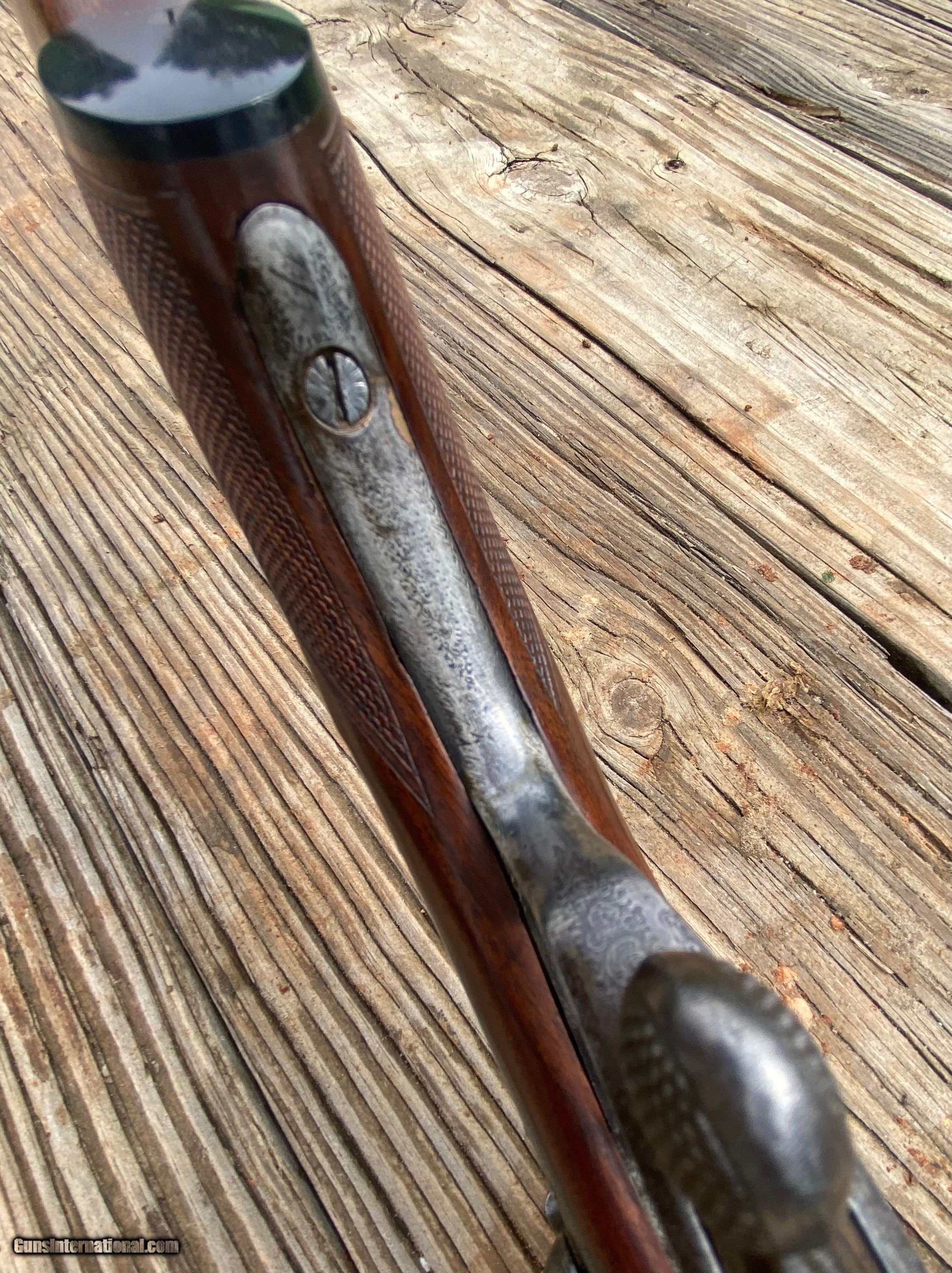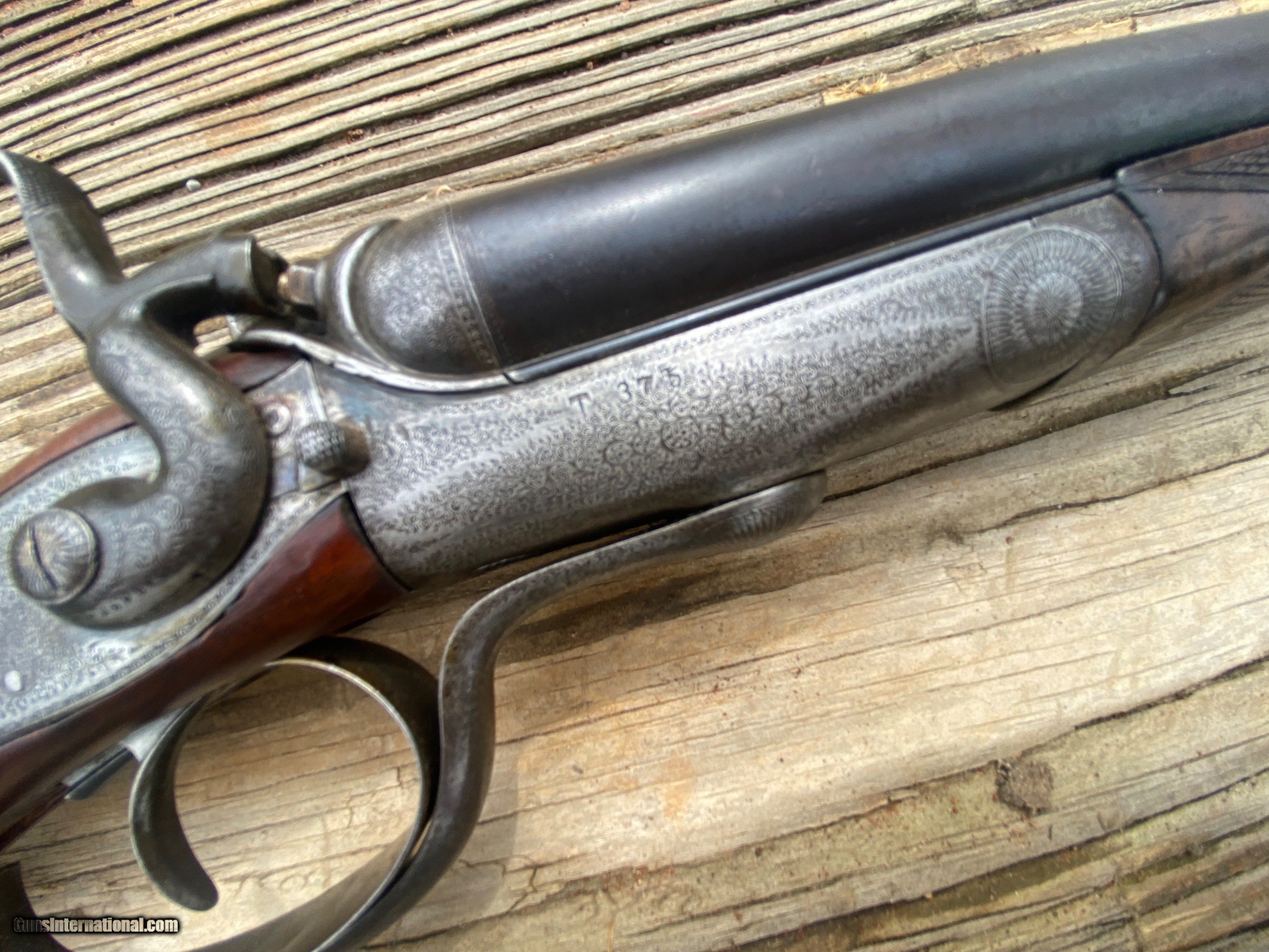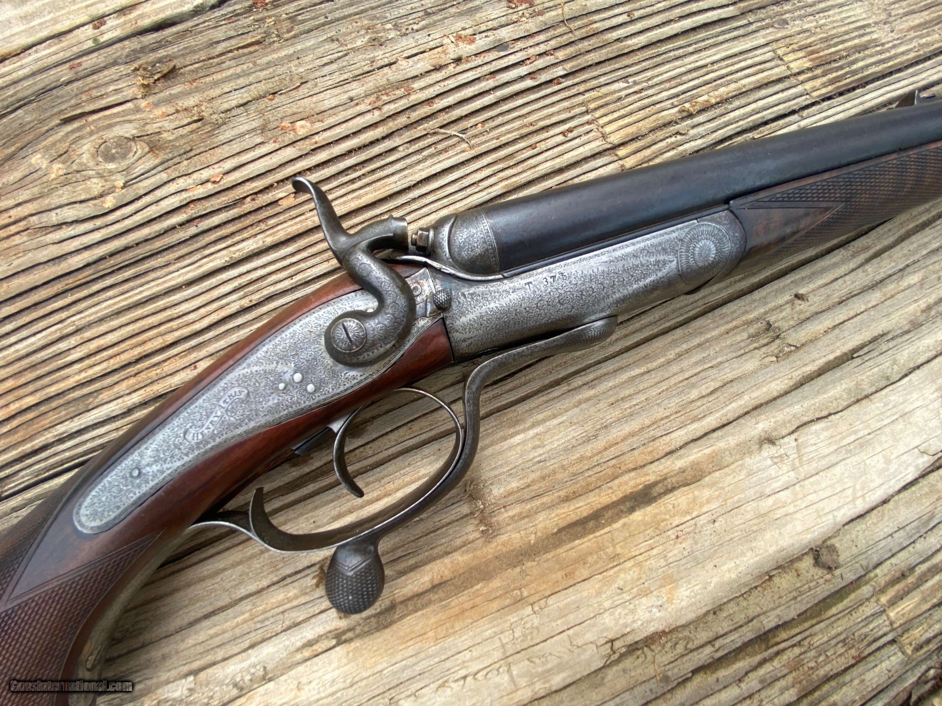 Description: Here is the opportunity at a Henry Atkin .450bpe double rifle project. The gun suffered a fall at one point, and unfortunately the craftsman whom did the repairs didn't serve the guns original quality. The buttstock is unoriginal, and while pretty was not headed up well. The rear trigger is broken, and the trigger guard was repaired around the hole for its screw via brazing. The bores are pitted; the right slightly worse than the left. I have had BPE guns through my hands in similar condition that still shot well enough. The barrels are 28" long, with tight ribs. Gun locks up tight. rifle weighs 7lbs 13oz. the forend remains in original condition. PLEASE LOOK OVER PHOTOS CLOSELY! $1500 shipped in continental US SOLD |