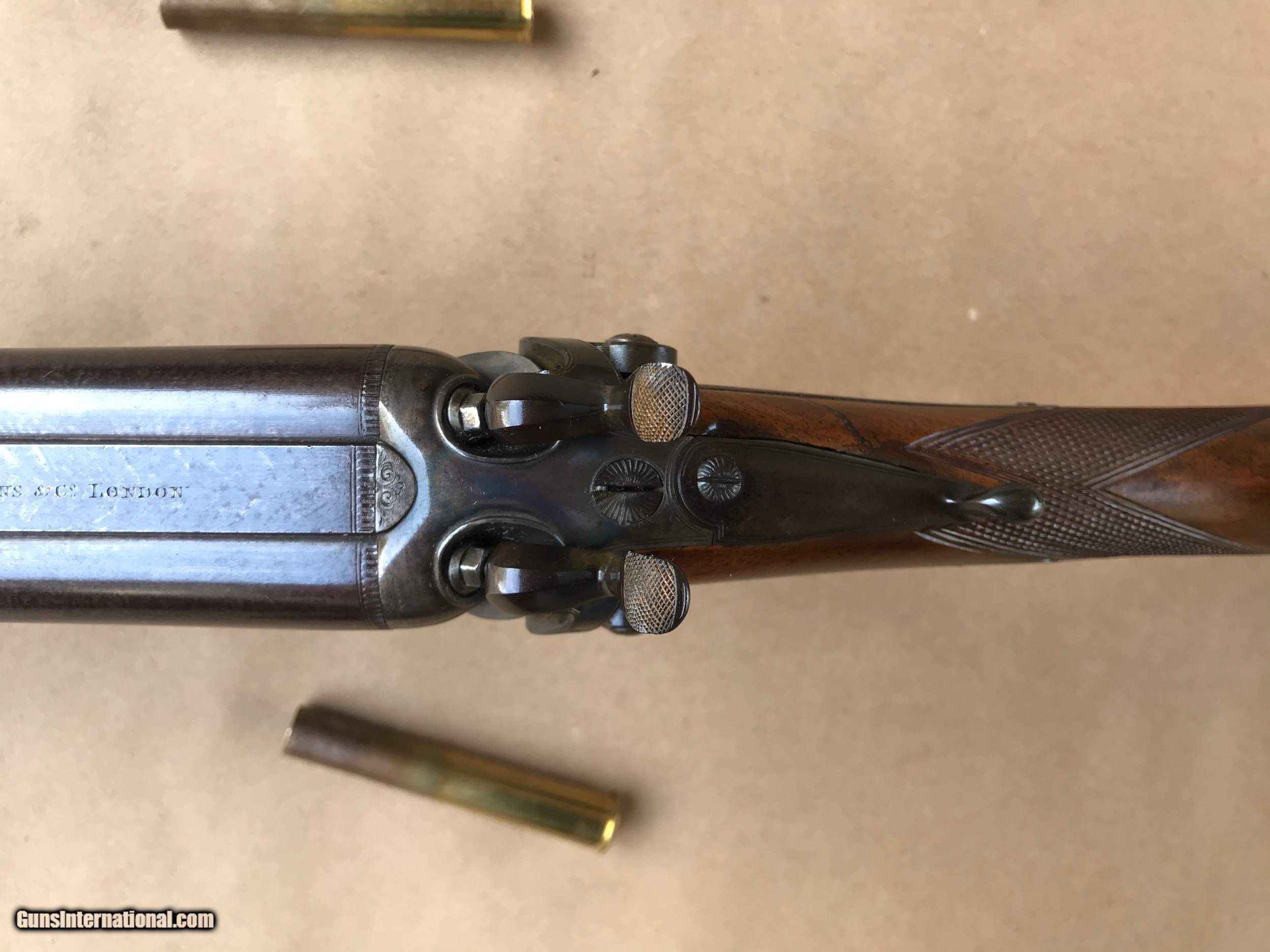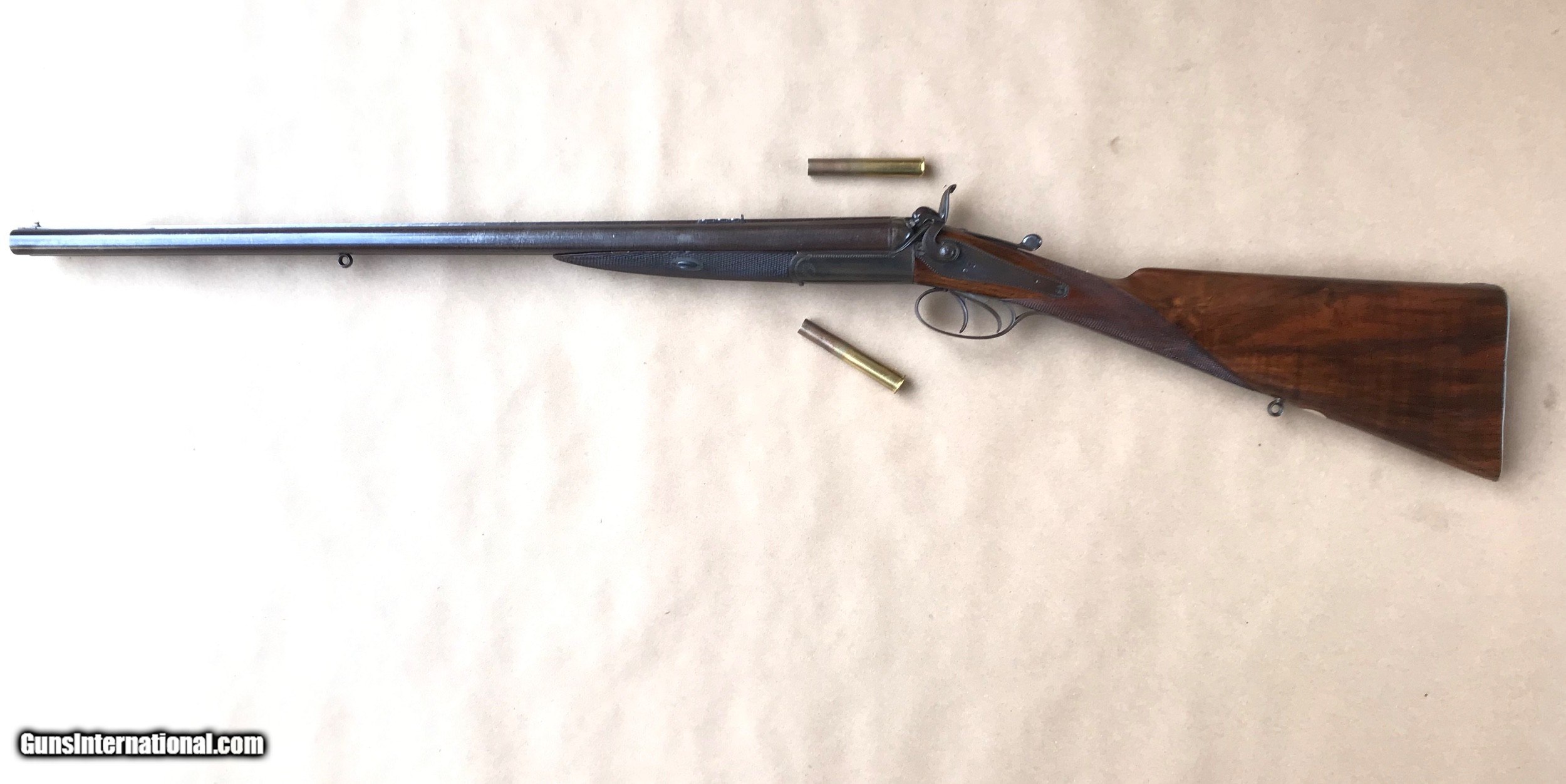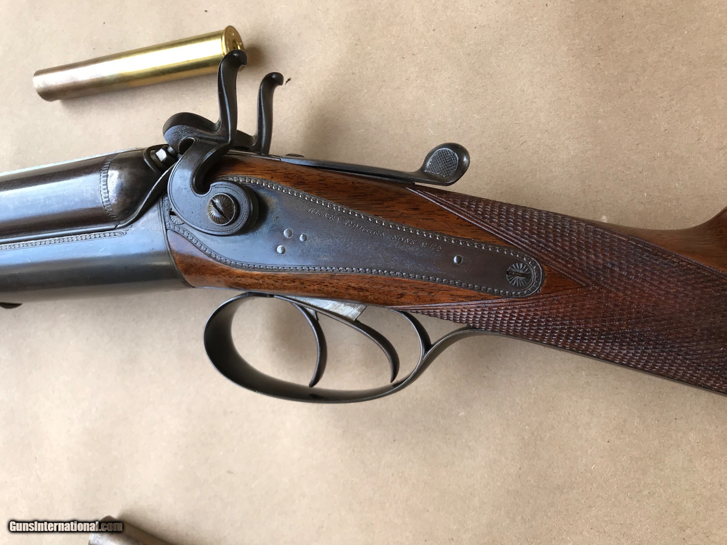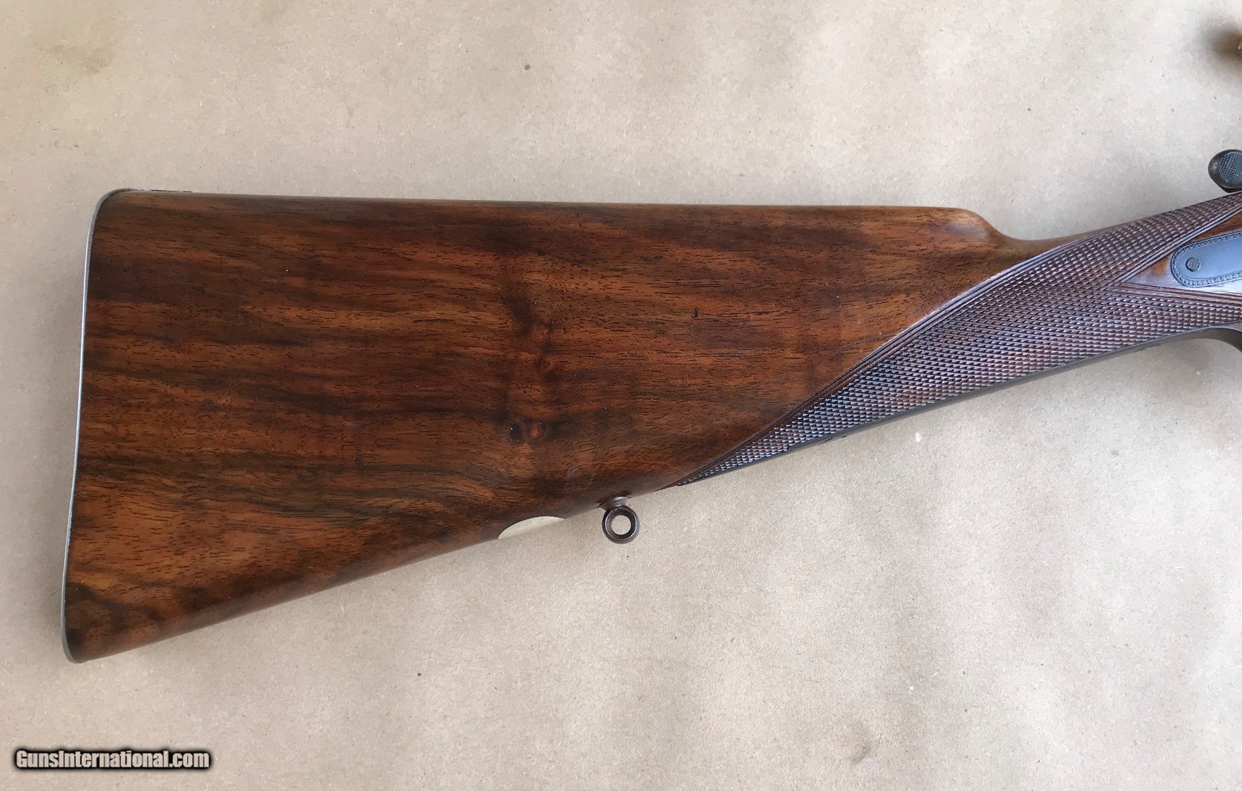 Description: Looking for a nice entry level double rifle for collecting , hunting or competition shooting but don't want to spend a lot of money? This is a plain rifle in that it doesn't have a lot of fine English scroll engraving , fancy grade wood but it is a solid gun with excellent bores and a recent refinish on the butt stock and checkering . The barrels are Damascus twist with a browned finish and has a triple leaf rear sight marked with yardages. The action is a top lever break open design and the action closes tight. The action and locks finish is a browned aged finish having been touched up over the years with probably cold blue . There is a repair of a crack on the top right side of the tang that is restricted to just the top and does not go further in the stock and should not be a problem . This type of damage is usually done from the gun falling over from a standing position and hitting the floor . The straight wrist design stock is perfect for double triggers , fire the front trigger and just slide your hand back for easy access to the rear trigger. Gun comes with a box of unfired brass. SOLD Curio/Relic: Yes Manufacturer: English Barrel Length: 23 3/4” Caliber Info: .450 B.P.E. Condition: Good Metal Condition: Good Wood Condition: Good Bore Condition: Excellant Barrel Type: Damascus Action: Top lever break open Stock Drop: 2” Butt Pad: Steel LOP: 14” Weight: 7 lb. 14 oz. Sights: Multi leaf Extras: Box of un-fired brass Proof:Black: Yes |