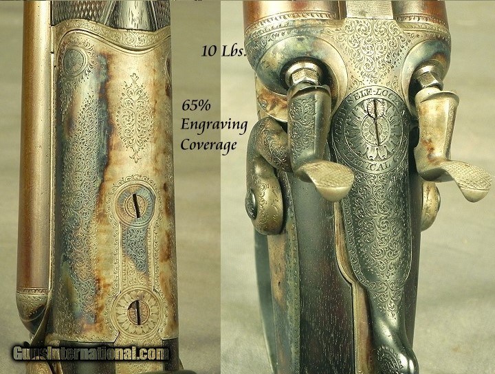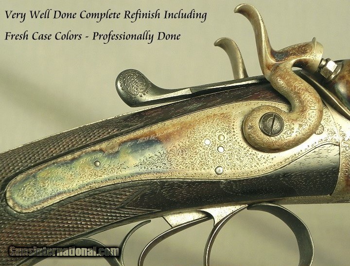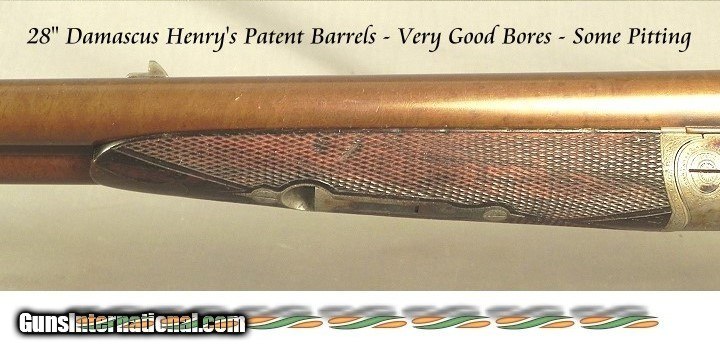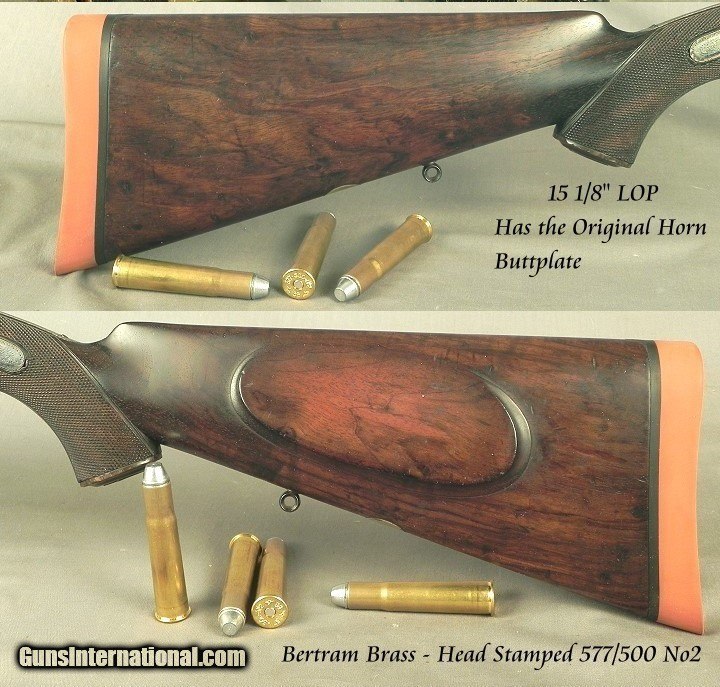 Description: #1220, Holland & Holland, 98 New Bond Street, London; A H&H 577/500 #2 Black Powder Express Rebounding Hammer Toplever Double Rifle with Ammo, It has their "Solid Self Locking Vertical Grip", It has double underlugs with an extension from the rear lug that protrudes into the standing breech and is locked in place with a locking vertical bite that moves with the opening of the toplever, This is Patent #324 and this gun was the 530th made with this particular Patent, 28" Henry's Patent A&T (Arthur Adams & Joseph Tate - Barrel makers & riflers) Damascus barrels which carry the #7888, I presume that is the number of barrels made under the Henry patent, Full length rib with 1 standing sight with a platinum V, Action inscribed "Holland & Holland", Deeley & Edge Pull Down Lever release forend, Horn grip cap, Shadowline cheekpiece, Sling eyes, 15 1/8" LOP over a Silvers 7/8" pad, It comes with the original checkered horn buttplate, 10 lbs., Percussion style fences, 65% coverage of classic H&H scroll engraving including the hammers, top strap, trigger guard and forend, This vintage gun has been completely refinished with fresh case colors, Rebrowned barrels, Refinished wood, All of it very well done and it appears to me to be done by a professional, There is zero primer burn at the striker holes, The bores are absolute very good with some pitting but the rifling is all there, This is a good looking and solid rifle in every respect from metal to wood. It comes with 14 loaded cartridges from Superior Ammo and 4 fired cases. All of the brass is Bertram and head stamped "577-500-No2" and it all remains as new. Here is first rate quality, style, grace, workmanship, handling and H&H romance from a great period at the pinnacle of sporting guns in the last years of the 19th century. Antique: Yes Rifle Caliber: .577/500 No 2 Black Powder Express Price: $7,500.00 Contact Seller |