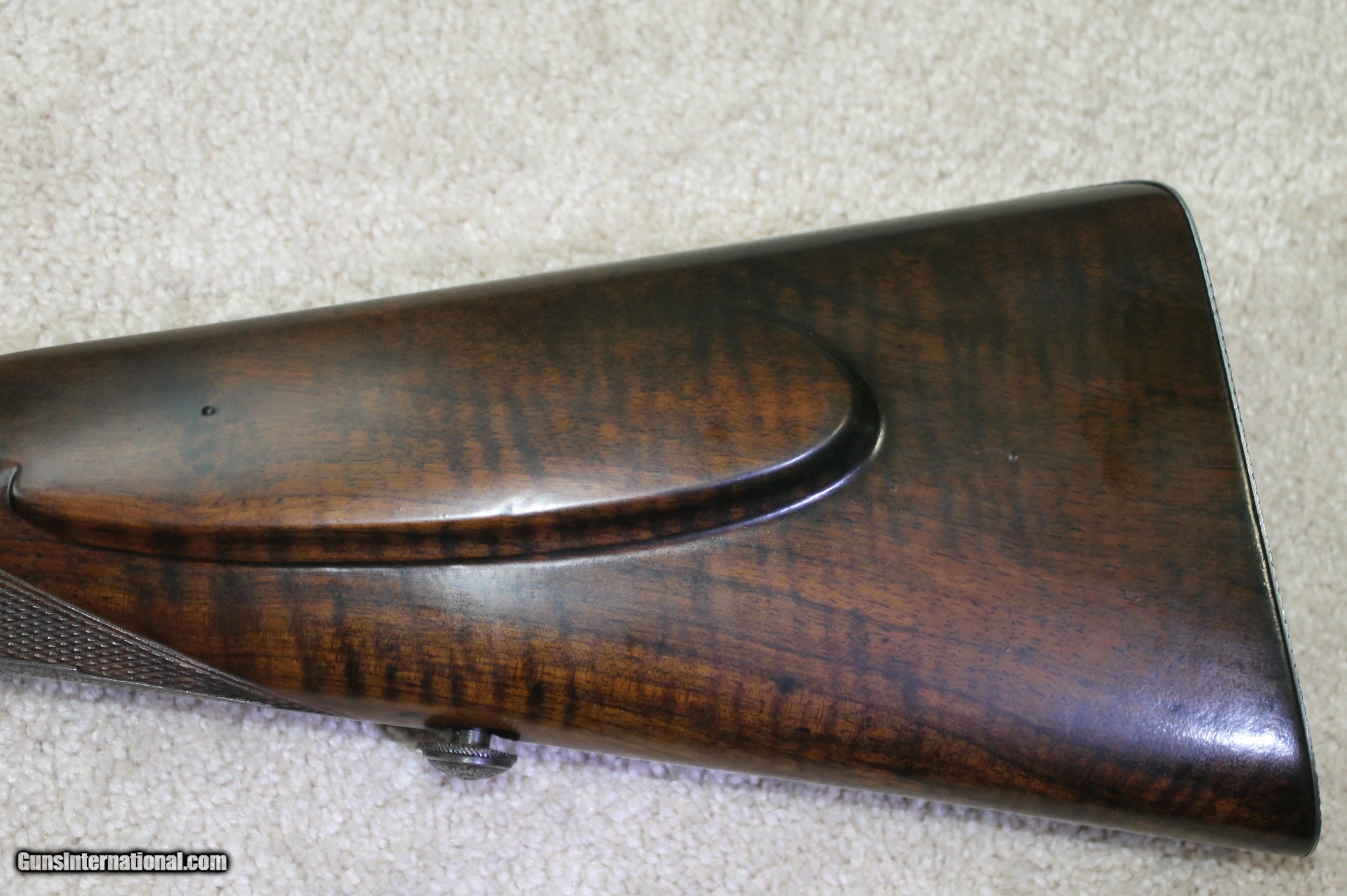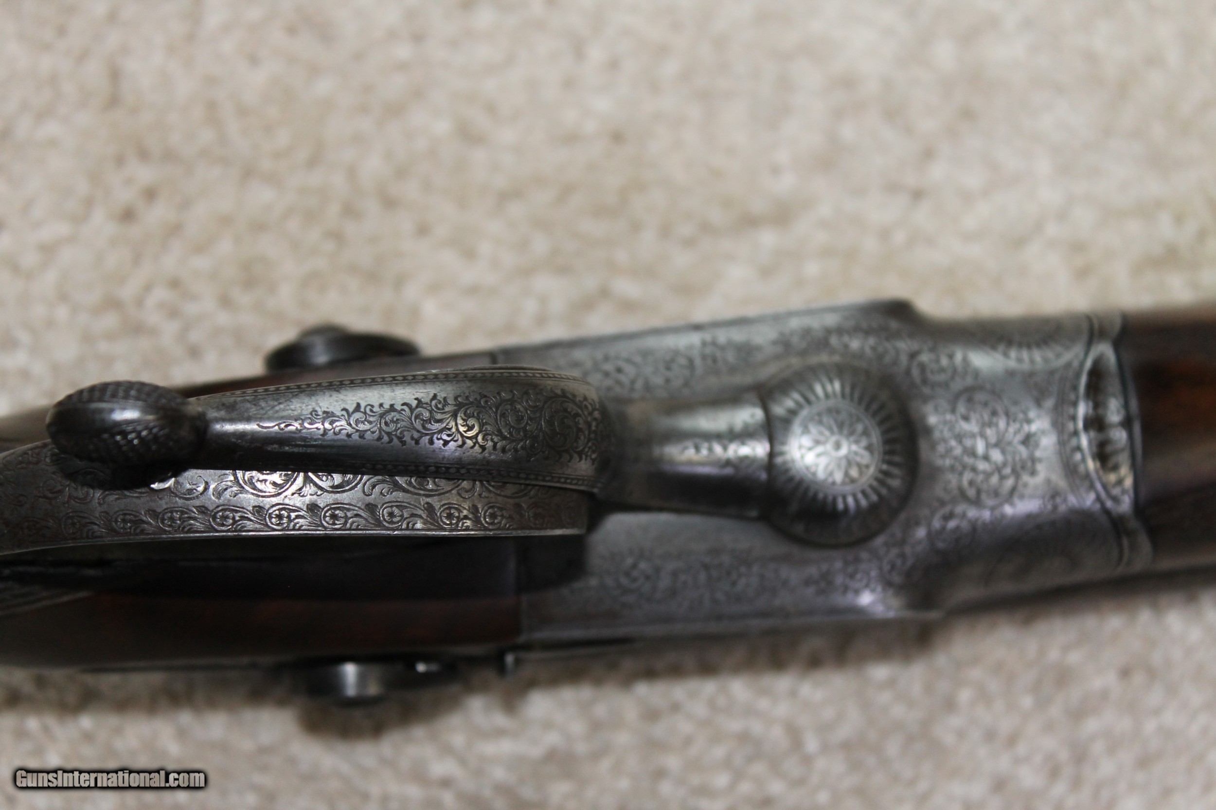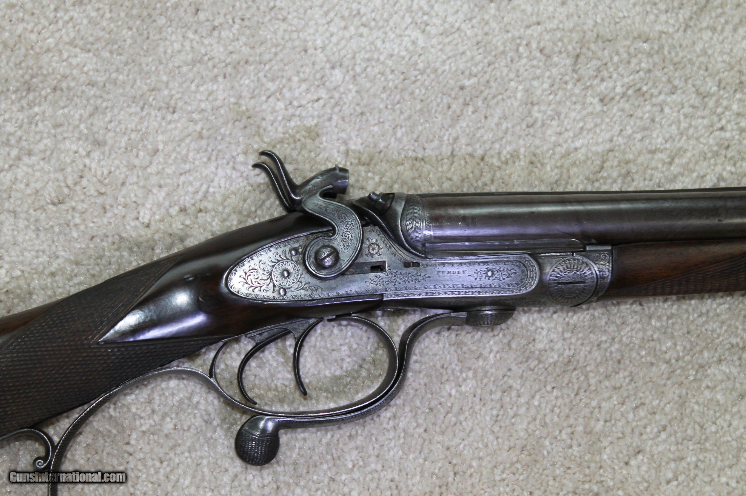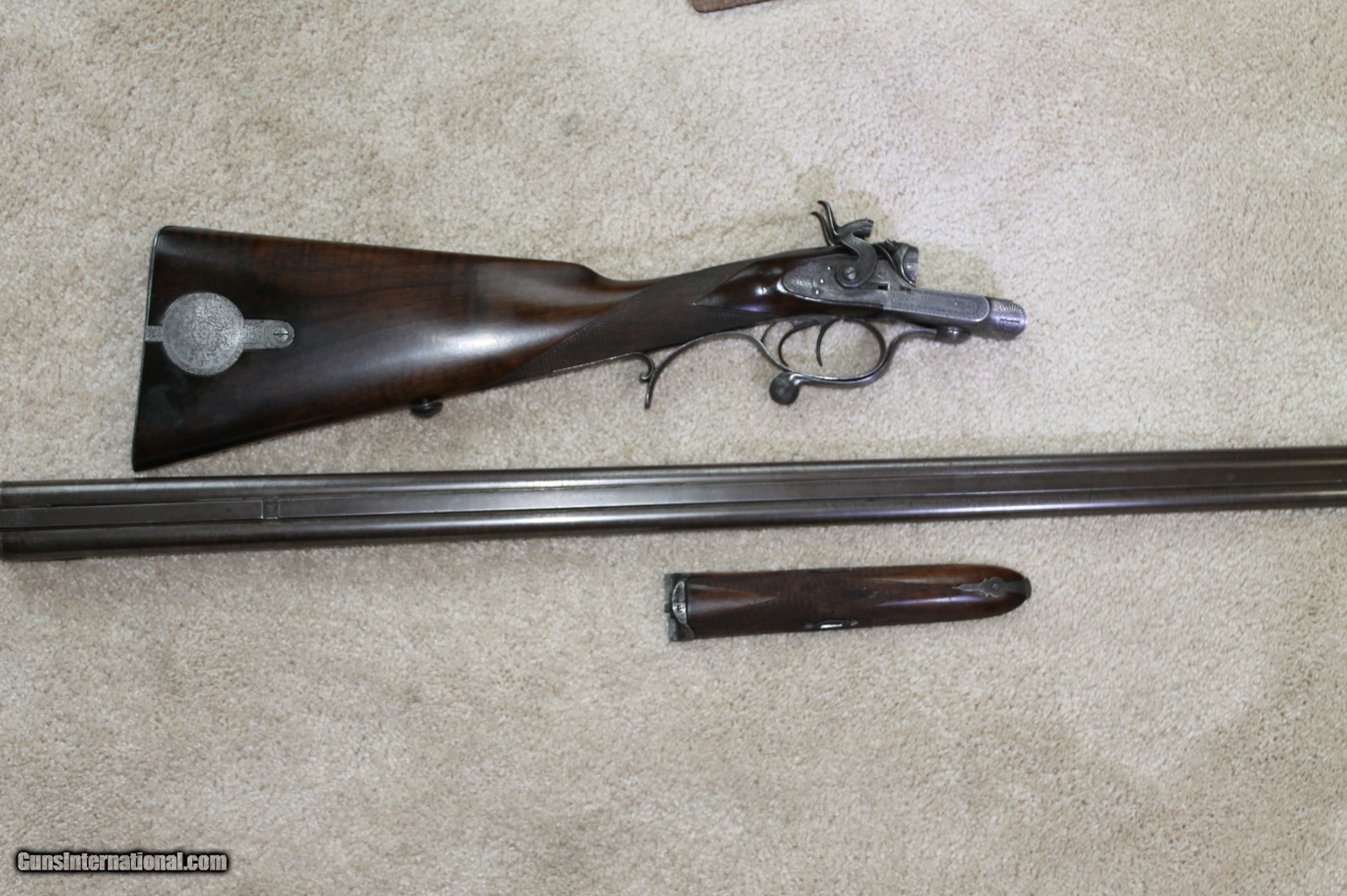 Description: Purdey double rifle made in 1857 for Sir Thomas Gresley as a muzzleloading 40 BORE Express double rifle. Converted later to a .500 Jones underlever breechloader. Two groove damascus barrels. Locks work fine, right lock missing the stocking safety and rear express sight missing. Left bore and chamber are fair, right chamber and rear of right barrel are buggered up. I bought this many years ago and the only thing I have done was send it to have a crack in the stock repaired by a stock maker. I planned on having it sleeved with smaller bore barrels such as a 32/20. Age dictates I'll never finish it. SOLD Antique: Yes |
