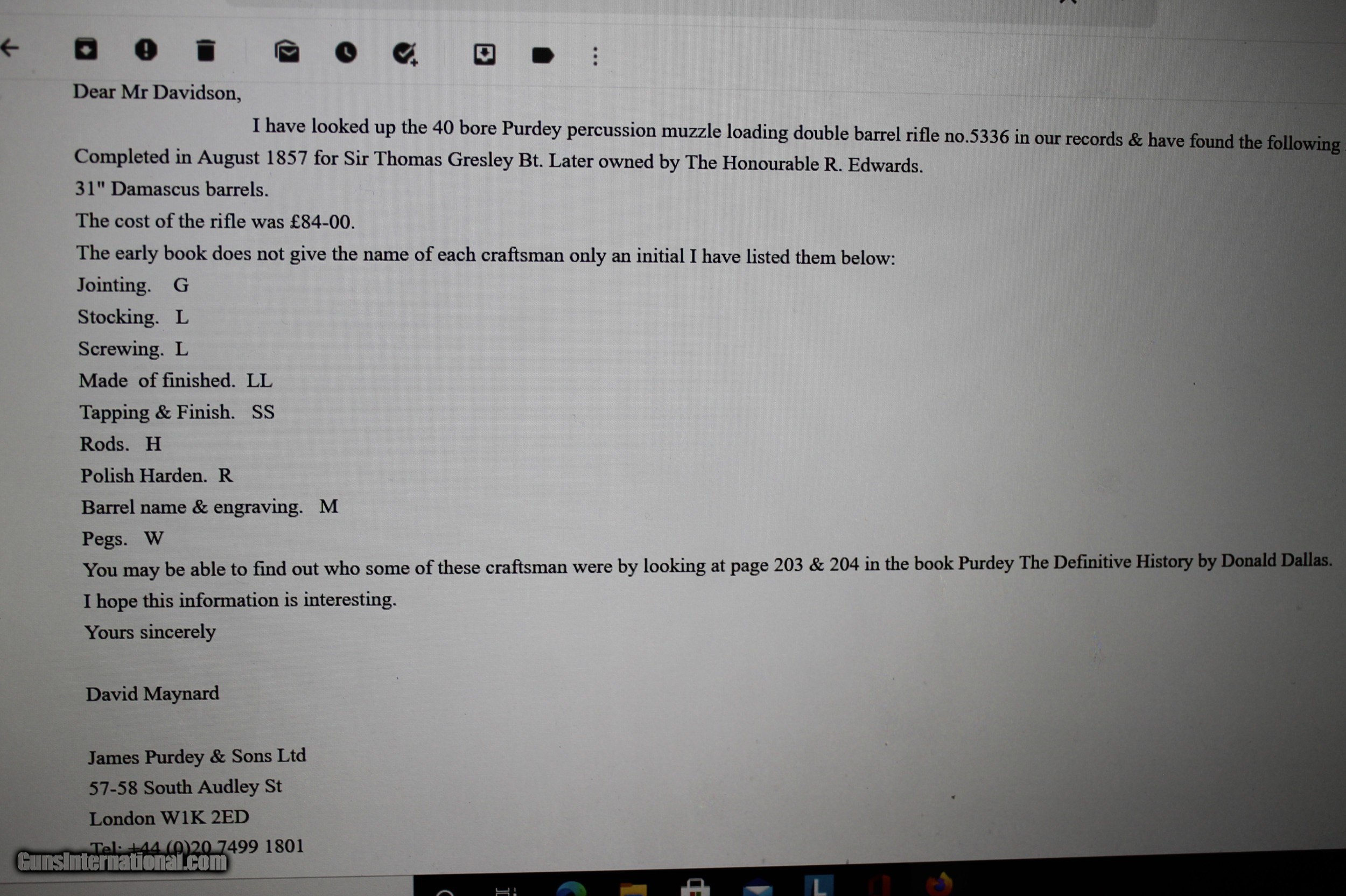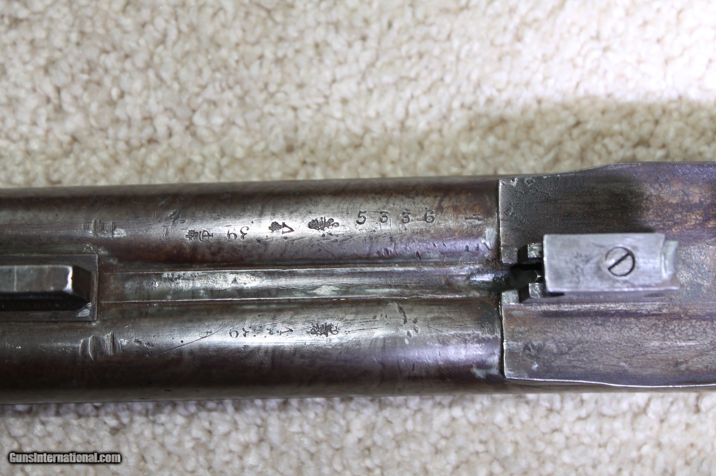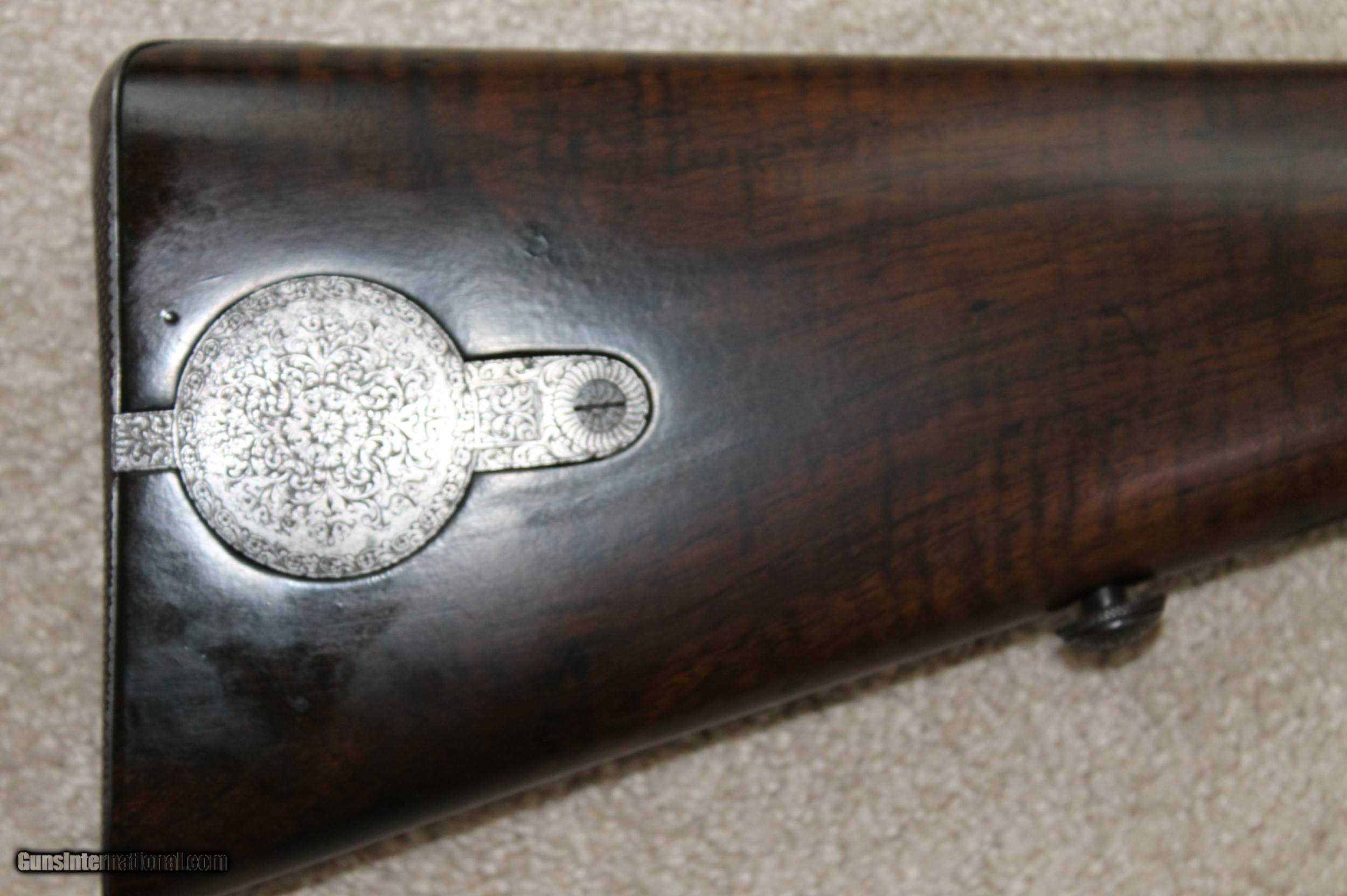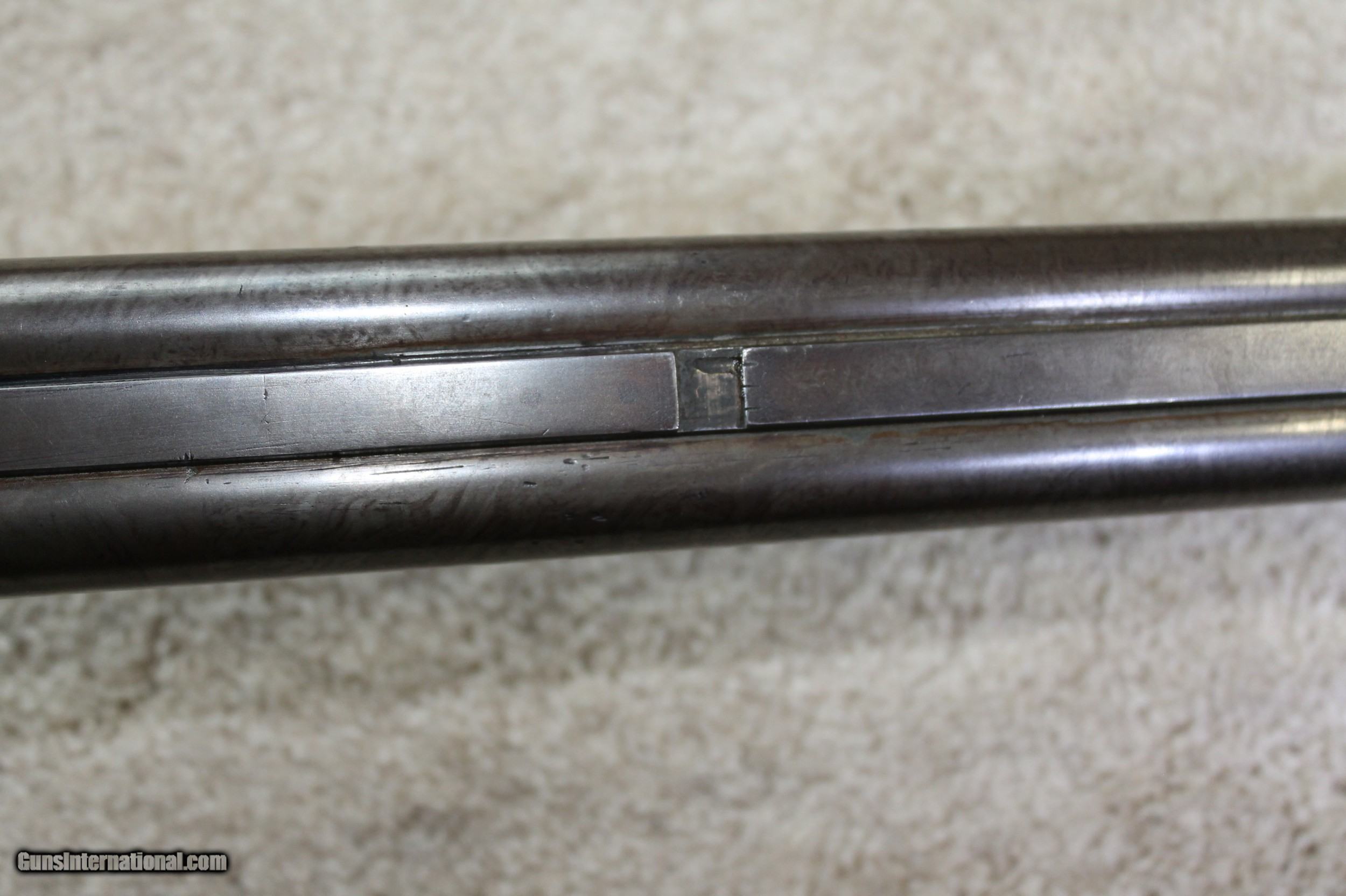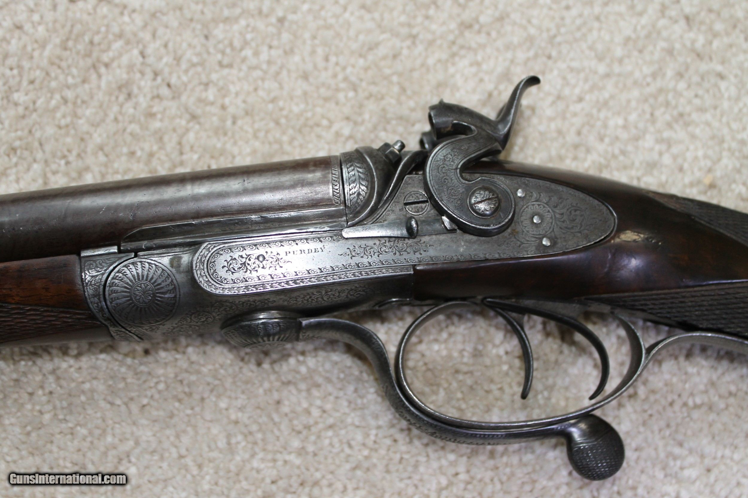 Description: Purdey double rifle made in 1857 for Sir Thomas Gresley as a muzzleloading 40 BORE Express double rifle. Converted later to a .500 Jones underlever breechloader. Two groove damascus barrels. Locks work fine, right lock missing the stocking safety and rear express sight missing. Left bore and chamber are fair, right chamber and rear of right barrel are buggered up. I bought this many years ago and the only thing I have done was send it to have a crack in the stock repaired by a stock maker. I planned on having it sleeved with smaller bore barrels such as a 32/20. Age dictates I'll never finish it. SOLD Antique: Yes |