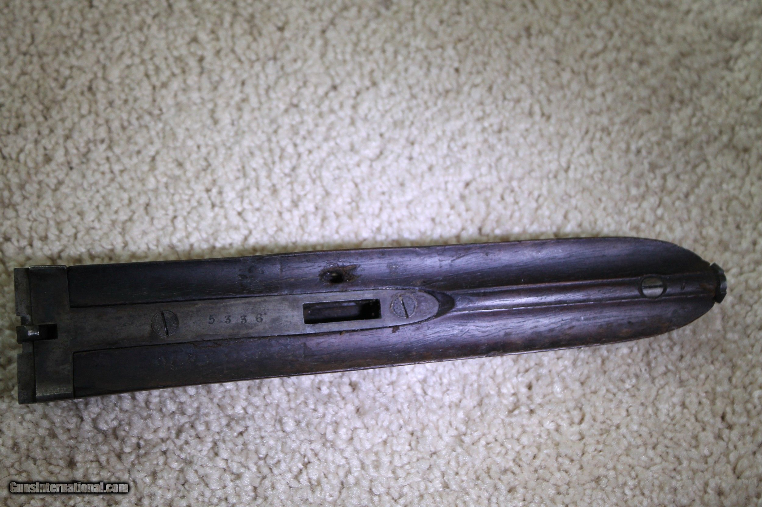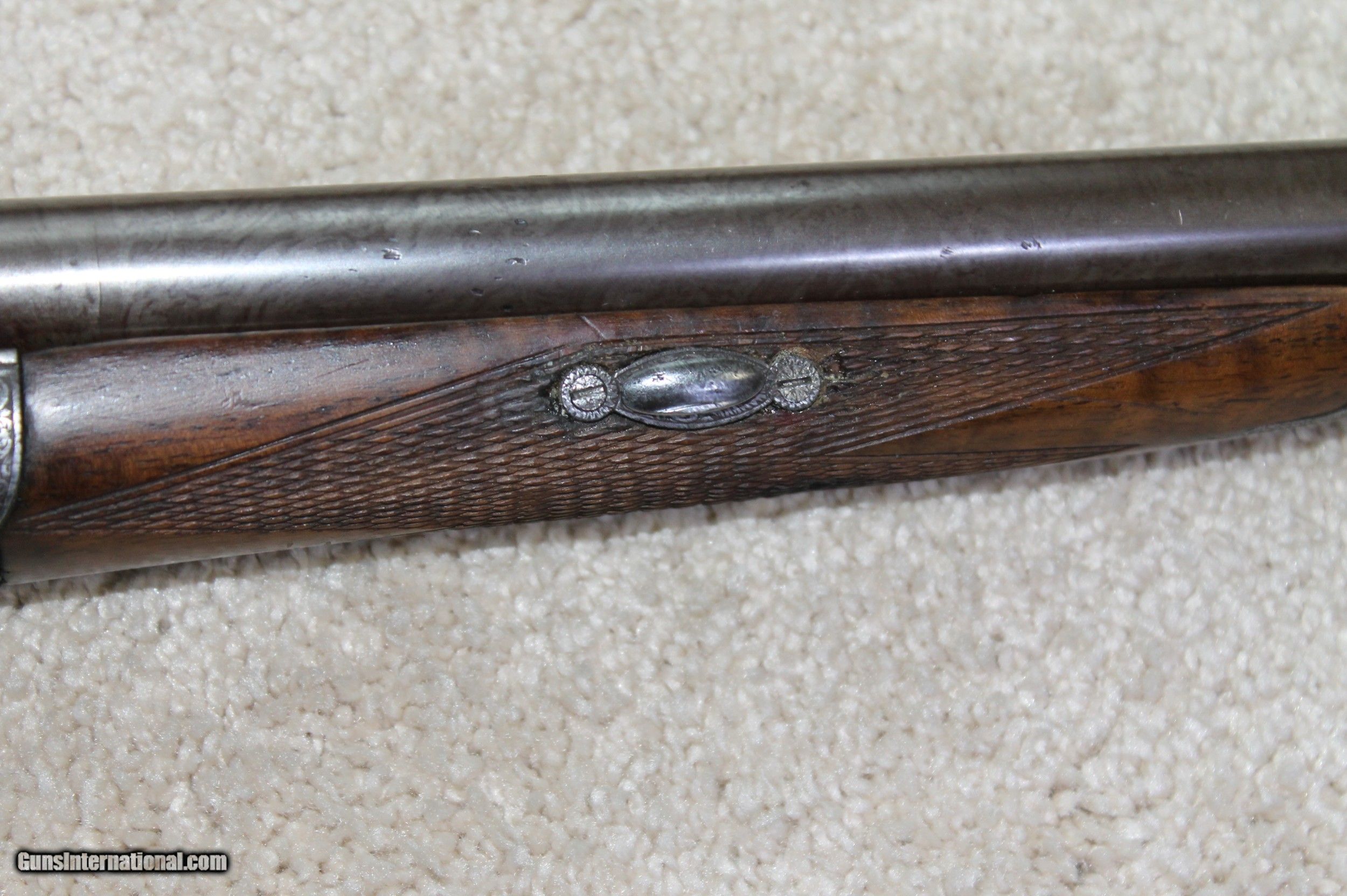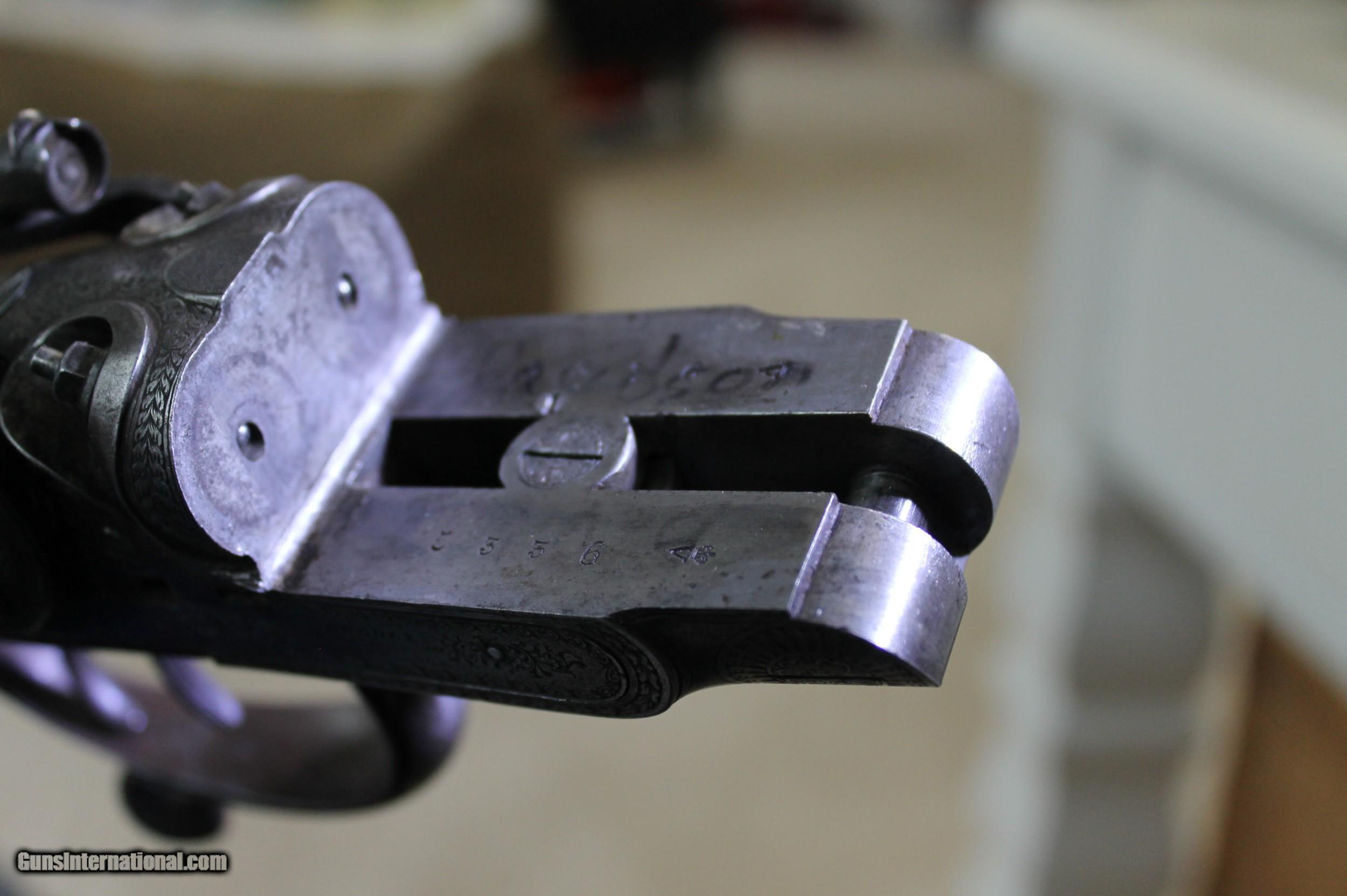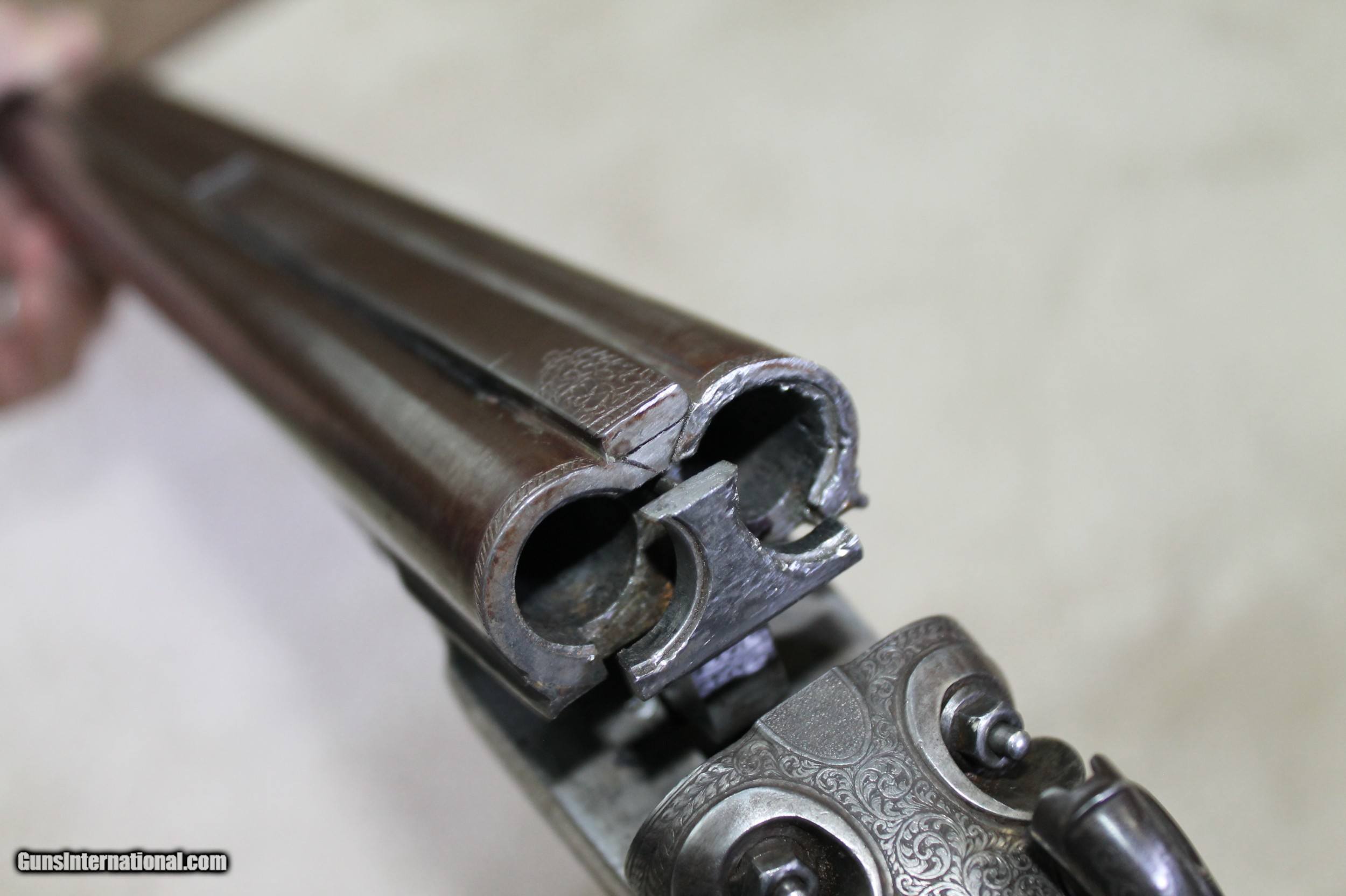 Description: Purdey double rifle made in 1857 for Sir Thomas Gresley as a muzzleloading 40 BORE Express double rifle. Converted later to a .500 Jones underlever breechloader. Two groove damascus barrels. Locks work fine, right lock missing the stocking safety and rear express sight missing. Left bore and chamber are fair, right chamber and rear of right barrel are buggered up. I bought this many years ago and the only thing I have done was send it to have a crack in the stock repaired by a stock maker. I planned on having it sleeved with smaller bore barrels such as a 32/20. Age dictates I'll never finish it. SOLD Antique: Yes |