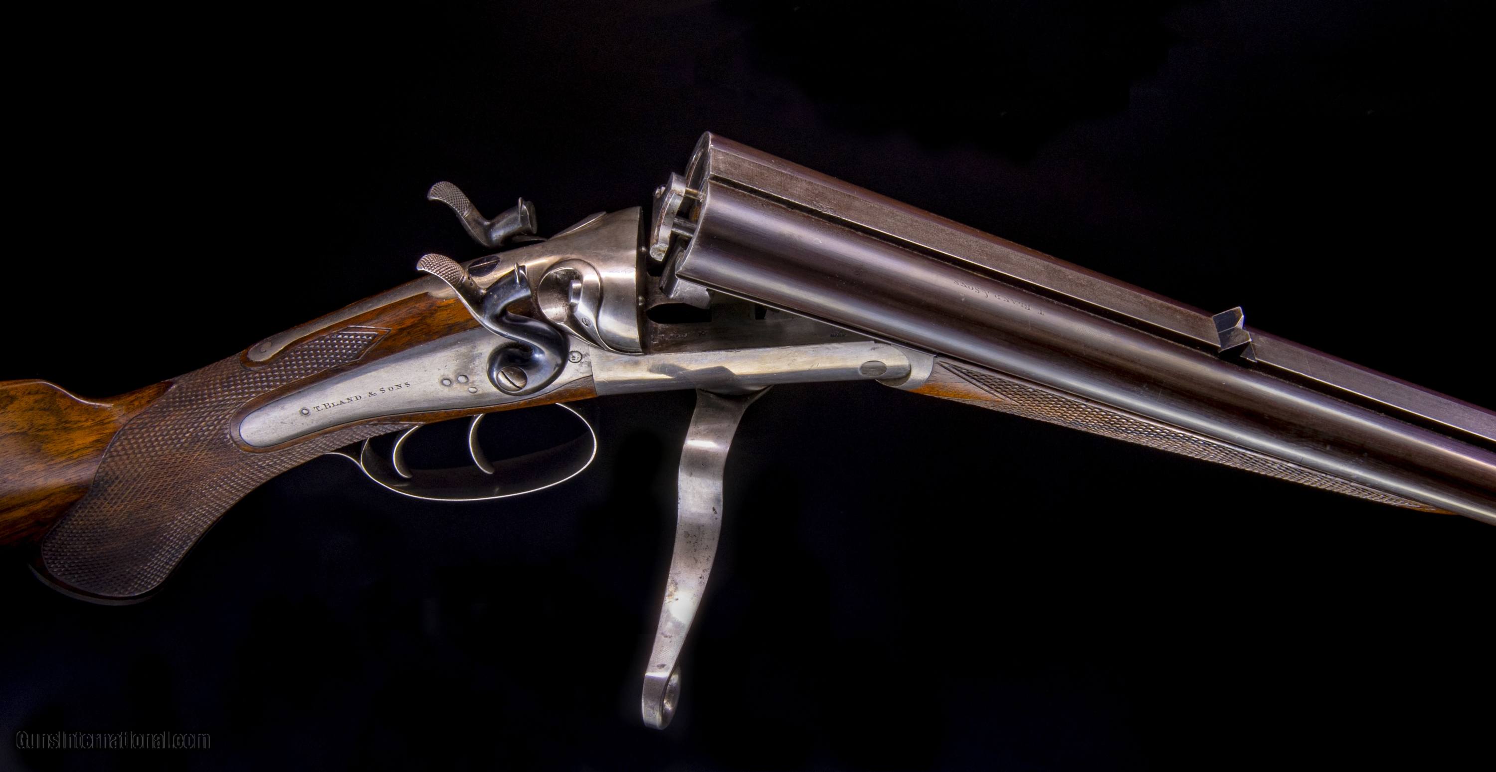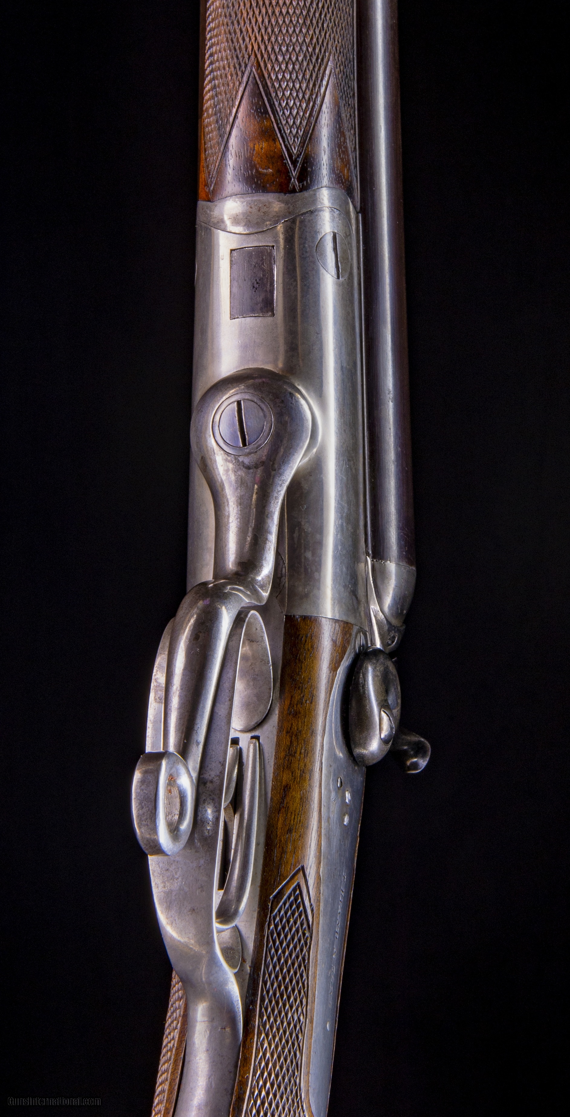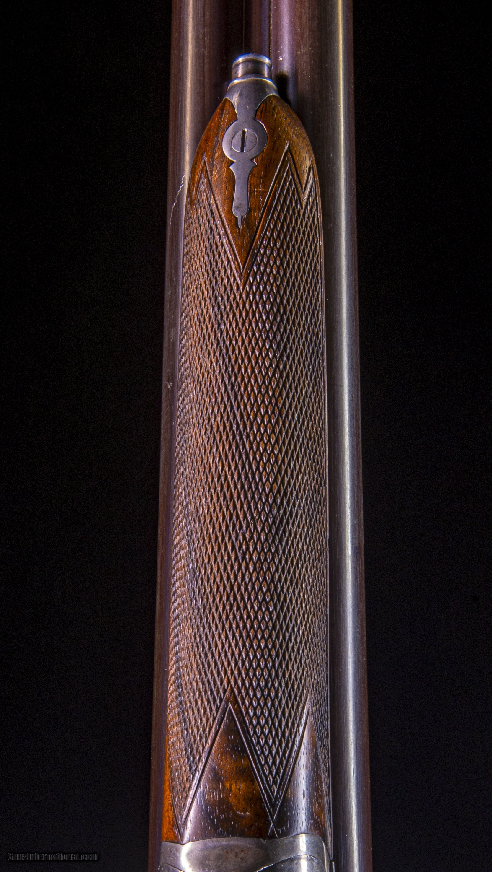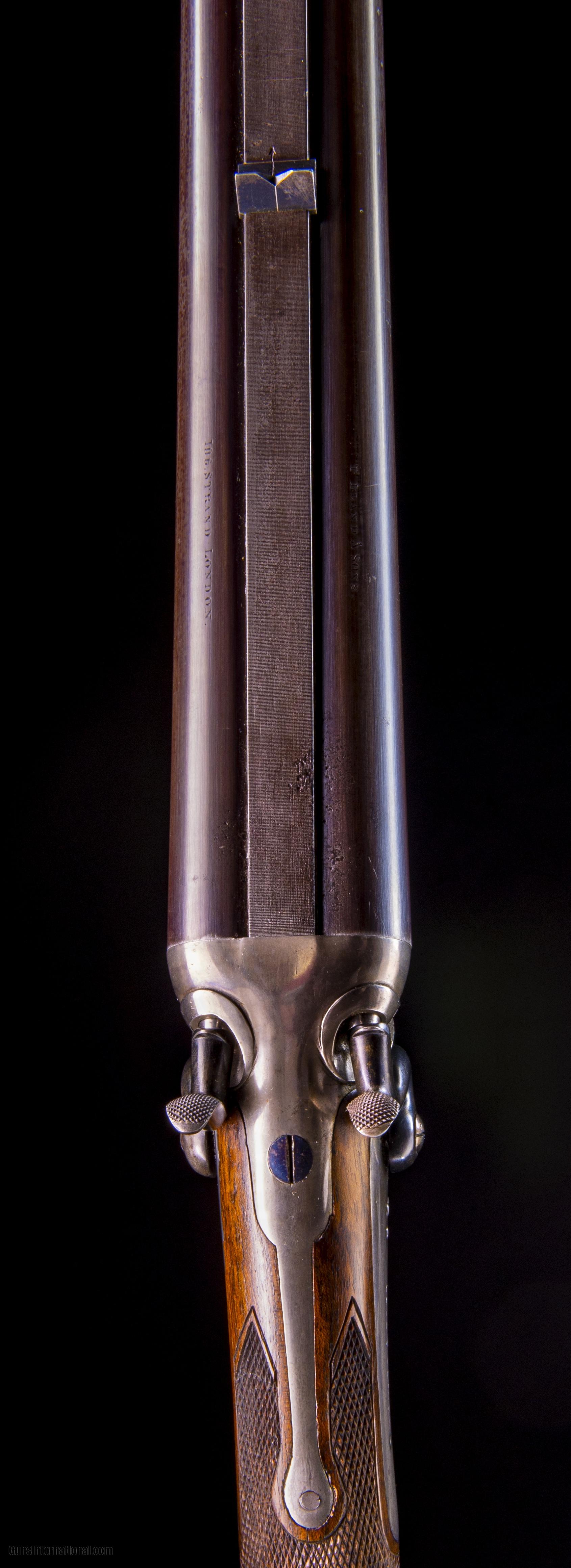 Description: Hammerguns - Very nice and bright and sharp Henry rifling on this fine double rifle *** Note: To see this gun with high resolution photos and a zoom-in feature, go to the vintagedoubles main site and search for the gun ID: 5683 or browse the main site to see our full gun collection. SOLD Manufacturer: Thomas Bland & Sons ~ 500 3" BPE with nice bores Model: None Serial Number: 9957 Caliber Info: 500 x 3" Black Powder Exp Ejectors: No Barrels: 28 Barrel Type: Steel Action: Underlever back action locks Gauge Info: Caliber Stock Comb: NA LOP: 14 3/16" with l Weight: 9 lbs 2 ozs Choke Left: NA Proof:Black: 500 x 3 Minimum Wall Thickness Left: NA |