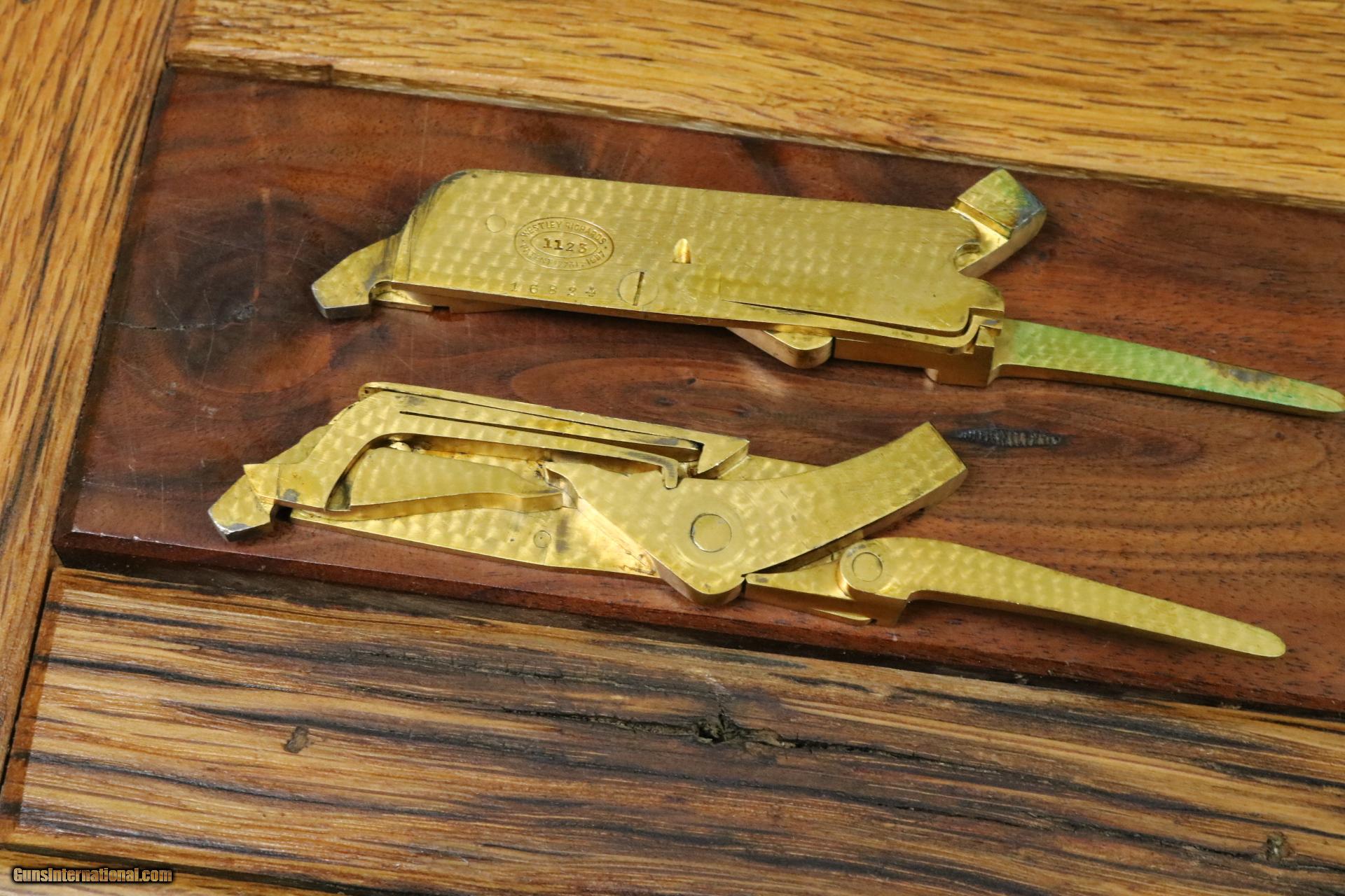 Description: SALE PENDING Westley Richards Vintage Best Quality Hand Detachable Droplock Action Double Rifle. Serial number 16824 originally produced in 1906. Completely refurbished at Westley Richards in 1984 where is was converted to .300 Winchester Magnum. Factory test targets included. Features include the rare Westley Richards Patent single selective trigger, ejectors, hand detachable locks and fine scroll engraving with gold inlays. One standing and three folding leaf express sights. Scoped in factory quick detach mount and rings is an excellent Kahles Helia Super 2x with post reticle. Length of pull is 15" from the single selective trigger over decelerorator pad. Weight is 11 pounds. Cased in its original Westey Richards labeled case with cleaning rod, snap cap and sling. Includes a very detailed Westley Richards Research Letter from 1906 through 1984. This double rifle presents itself as nearly new with only some light handling marks since its factory refurbishment in 1984. It is one of the best double rifles that you are likely to find and is ready for your next hunt. Phone for additional pictures. SOLD Curio/Relic: Yes Manufacturer: Westley Richards Model: Best Quality Drop Lock Serial Number: 16824 Caliber Info: .300 Win mag Bore: Exc |