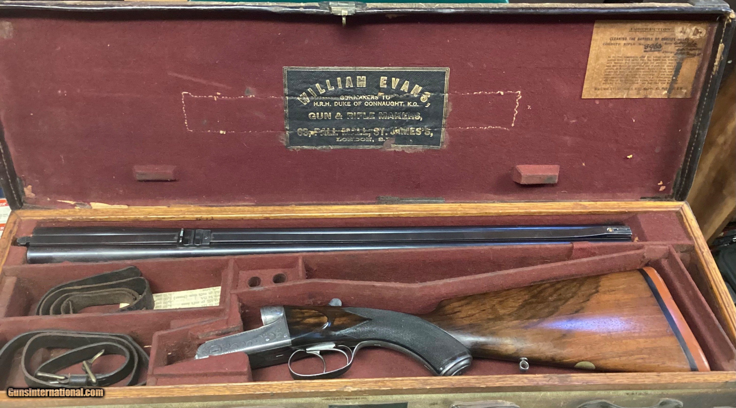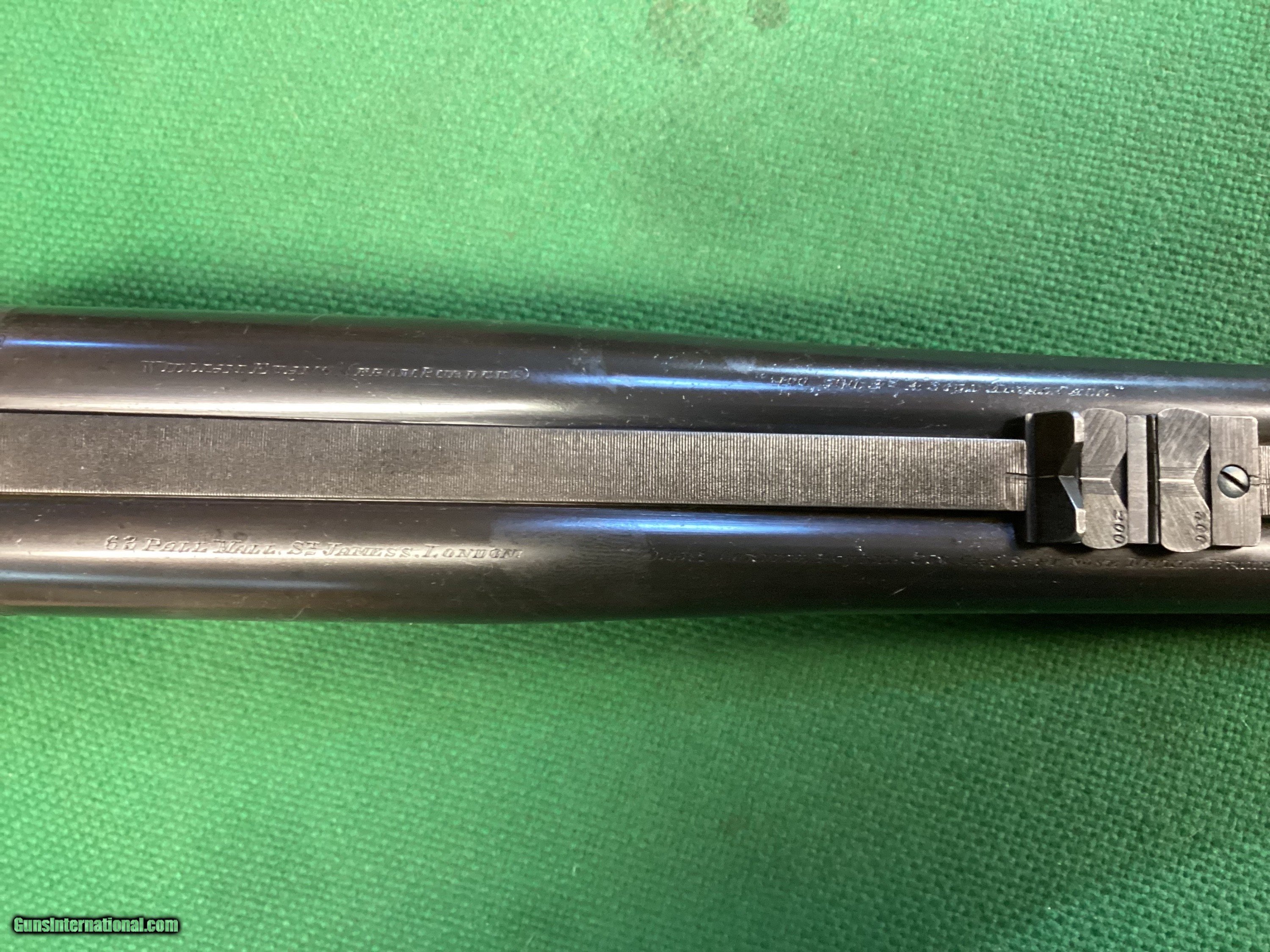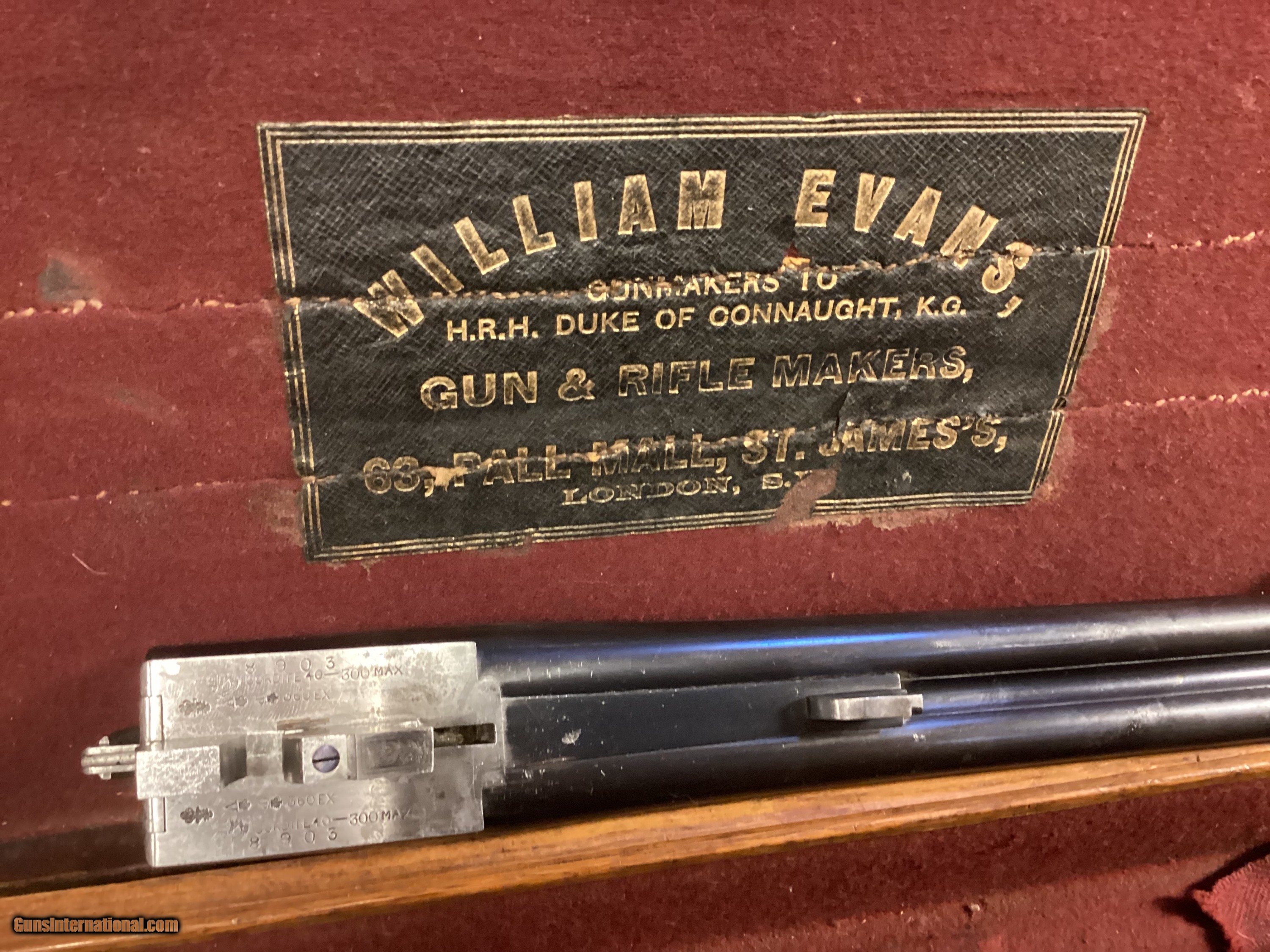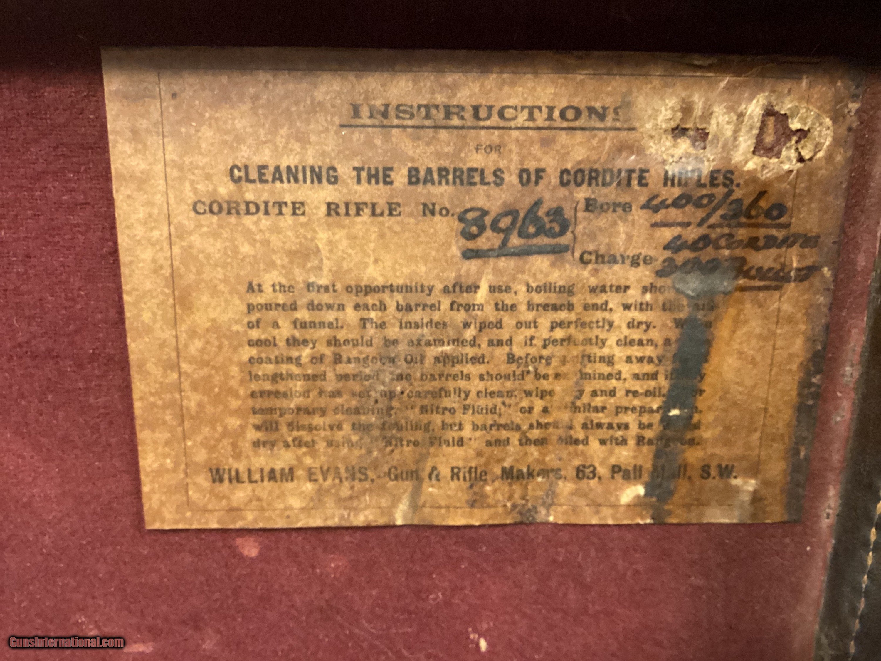 Description: This William Evans 400-360 is one of the most well balanced and accurate double rifles I have ever owned. Made ca 1909, it comes with its original case and 26" chopper lump barrels with excellent rifling. It weighs 9 1/4lbs with a 14 5/8" length of pull. To the best of my knowledge, all finishes are original with faded case colors on the action and some minor blueing wear on the barrels on the barrels where I carried it on a safari in Mozambique in 2017. On this safari it took one Cape buffalo (with one shot) and two impala. The stock is in very good condition and the flat top checkering in very good condition. SOLD Curio/Relic: Yes Rifle Caliber: .400/360 Nitro Express Manufacturer: William Evans Serial Number: 8903 Barrel Length: 26 Ejectors: Extractors Condition: Very good Metal Condition: Very good Wood Condition: Very good Bore Condition: Very good Barrel Type: Chopper lump Triggers: Double LOP: 14 5/8 Weight: 9 1/4 Manufacture Date: 1909 Case: Yes |
