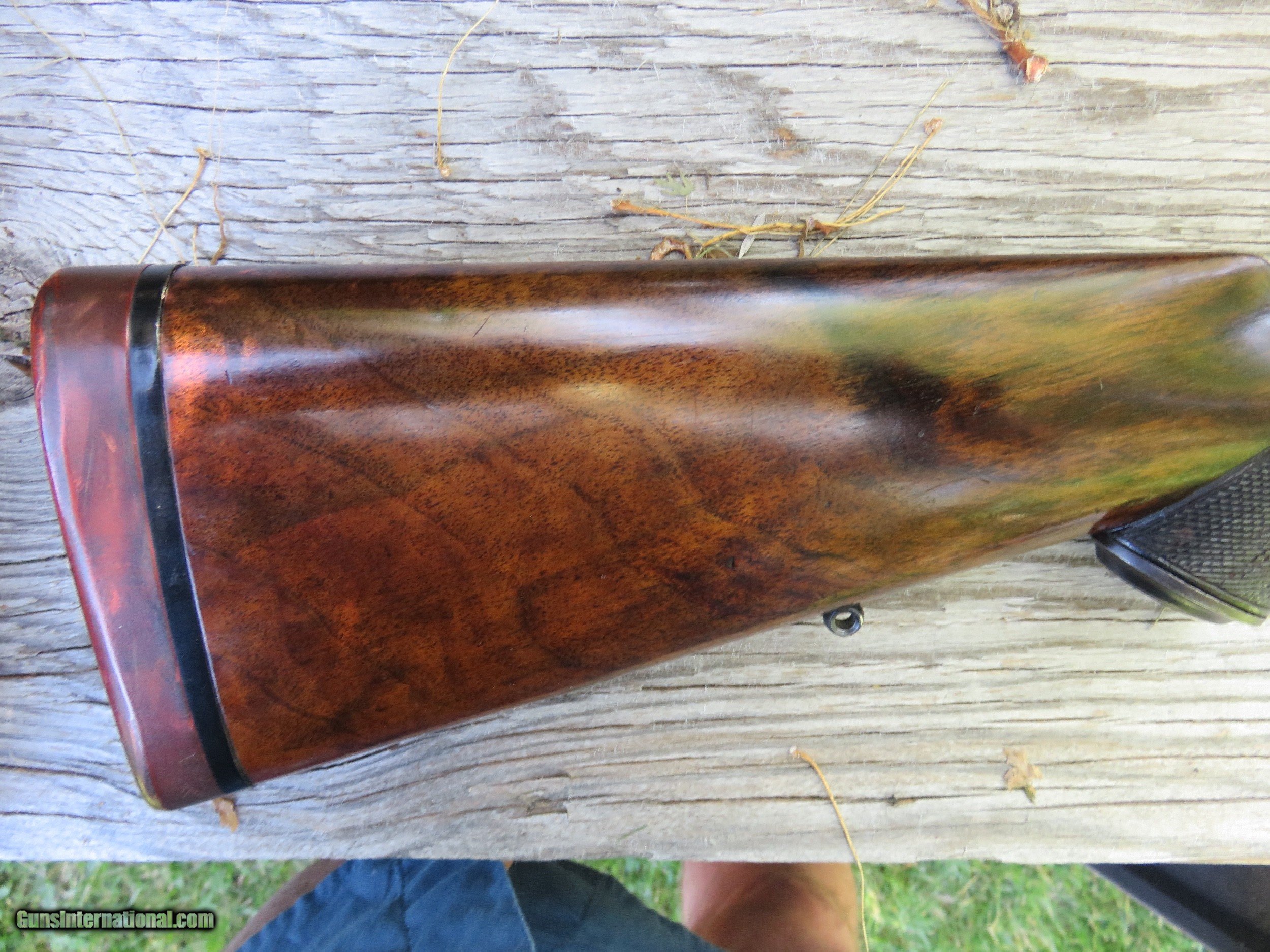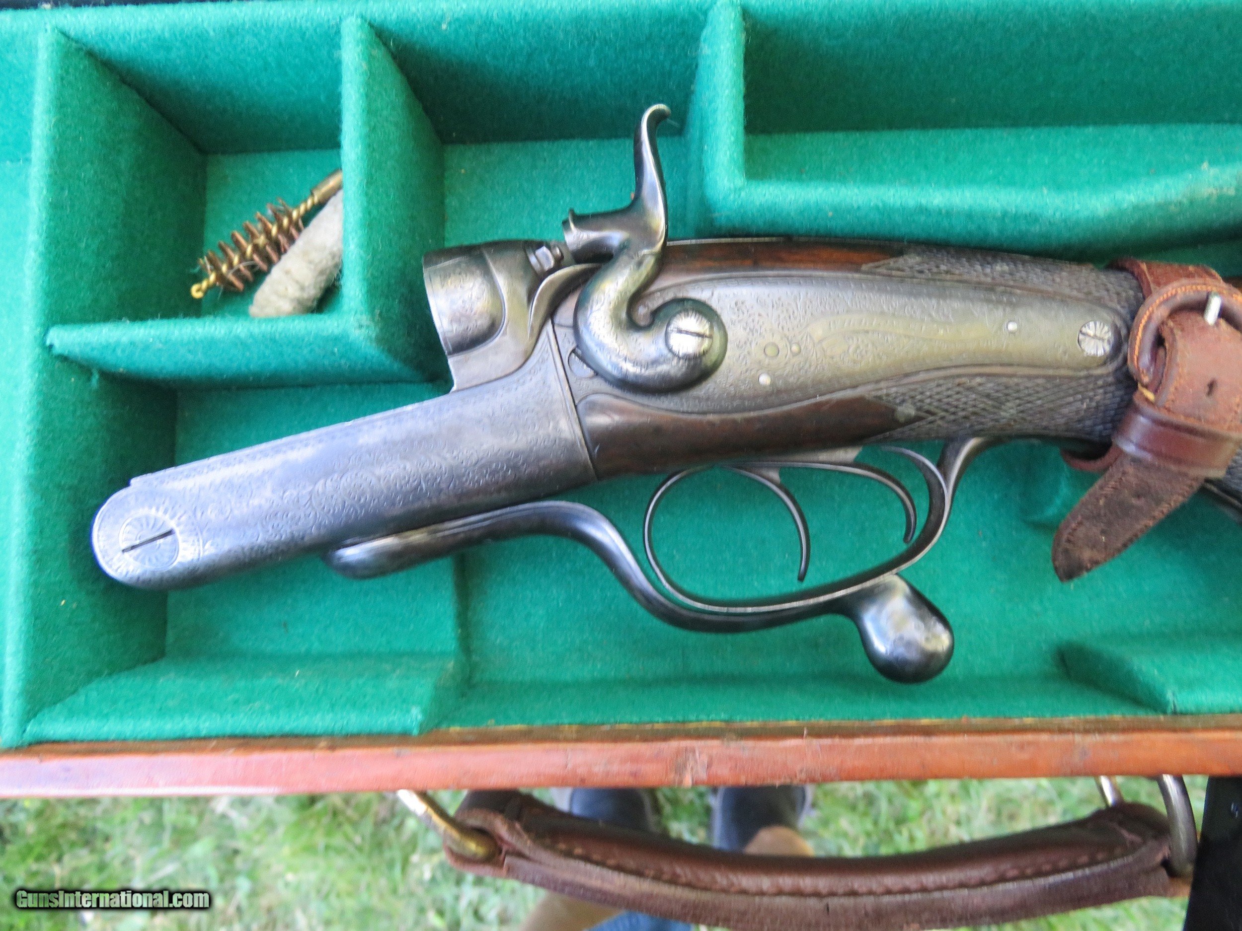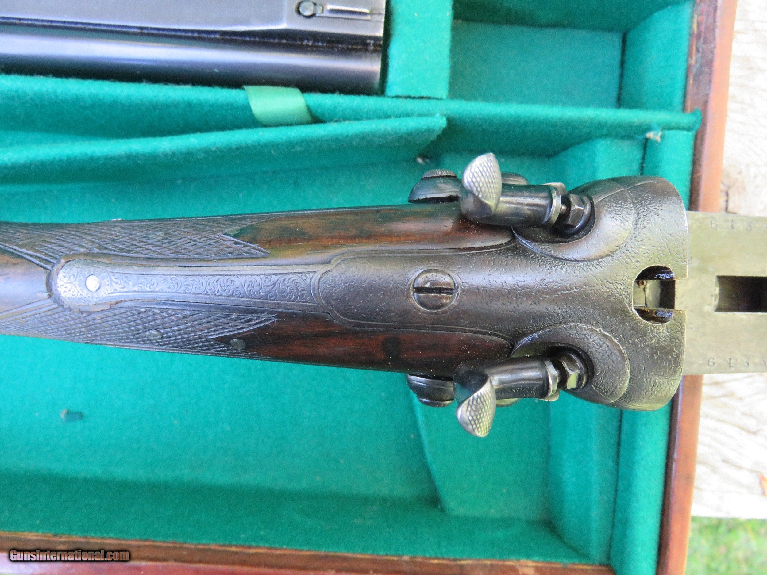Description: Here's is a Great Opportunity to own a quality London Hammer Double Rifle by one of England's most respected Makers. It is a 450-400 NE 3 1/4" Jones Underlever (considered to be the strongest most reliable lock-up). This gun has 26" Barrels with one standing and two folding sight blades....they are free of pitting and retain 85% bluing (which I believe may have been redone decades ago.) Sharp lands and grooves. It is in largly original condition with the case colors gone dark. Engraving is good for a gun over 100 years old.....it was built in 1903. Stock is well figured with original finish,cheekpiece and LOP 14 1/2" to Silvers pad. There is an old repair to the wrist that appaers to be quite strong (Examined by Stock maker)Weight 9lbs 11oz . as a BONUS it comes with Dies Brass Bullets so you can shoot this Old Girl all you want !! BEST of All this gun is remarkably accurate. HOLY COW....It comes in its original Brass and Leather case with Makers Label and it is in very good condition for its age.....interior has been relined and it is a professional job. This was one of John "Pondoro" Taylor's favorite calibers for ALL types of Dangerous Game Including Elephants. Priced at an incredible $7895 plus $50 shipping (Show me another Nitro Proofed London Double Rifle Hammergun at this PRICE !!!!). CONUS ONLY) Email me at christo502003yahoo or call 406 728-9434 SOLD Antique: Yes Rifle Caliber: .450/400 Nitro Express Manufacturer: William Evans Model: Hammer Double Serial Number: 6133 Barrel Length: 26 Chambers: 3 1/4 Ejectors: No Condition: very good Metal Condition: good Wood Condition: very good Bore Condition: very good + Action: Jones Underlever Triggers: Double Stock: Walnut Stock Dimensions: 14 1/2 Stock Cast: Straight Fore End: Splinter Butt Pad: Silvers LOP: 14 1/2 Rib: Flat stippled Weight: 9 lbs 11oz Sights: One standing 2 folding Manufacture Date: 1903 Engraving: Crisp with normal wear Case: Original Leather/Brass Item Location: MONTANA Proof:Nitro: Yes |