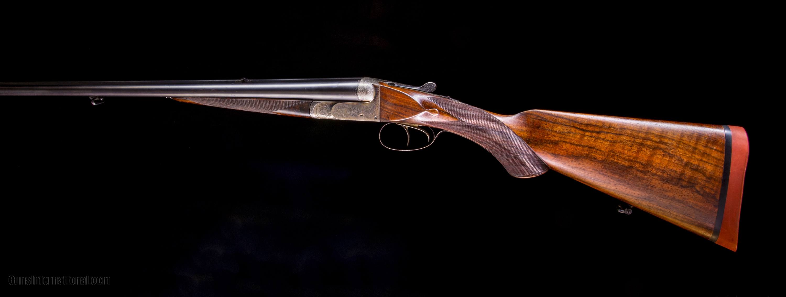 Description: Boxlocks - Excellent bright and sharp rifling, tight on face, and ready to be put to the field. Proof marks indicate it was built before 1922 and was for non-jacketed bullets. A superb prewar quality rifle for a great price in wonderful condition. Our gunsmith says proof marks indicate that this is nitro proofed but for the lower of the three commercial loadings. He recommends a starting place of 350 gr. cast or thin jacketed bullets with + or - 45gr. IMR 4198 plus filler. * This is an extractor rifle but under close inspection I can see someone who did not care for ejectors had them removed making the gun into a non-ejector. *** Note: To see this gun with high resolution photos and a zoom-in feature, go to the vintagedoubles main site and search for the gun ID: 5508 or browse the main site to see our full gun collection. |