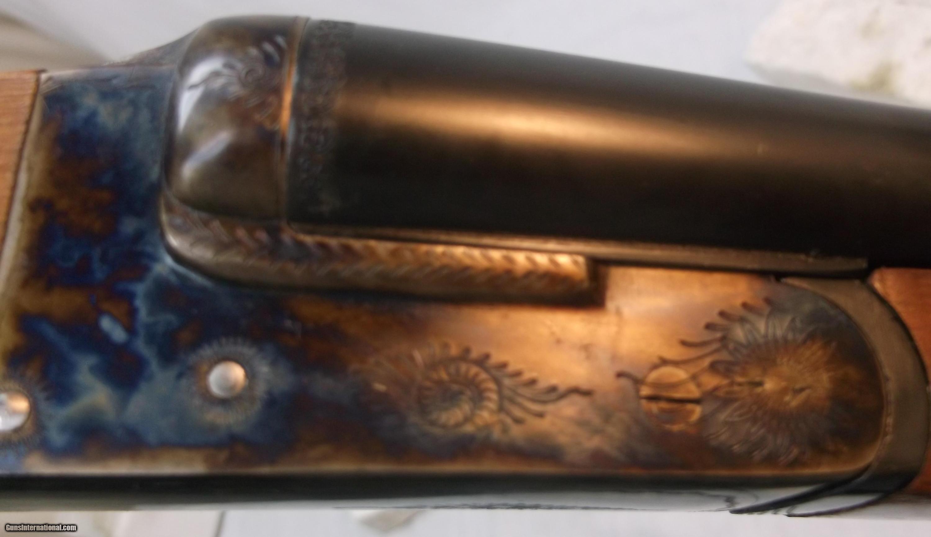 Description: This double hammerless 40-75 gov. rifle has 21-7/8" tapered round blued barrels with matted rib. Stamped on the left barrel is Made in Spain. Original stamping on right barrel has been re-stamped to say 40-75. Mounted on the matted rib is a bead front sight and a folding three leaf rear sight. Stamped on the matted rib is Premier Regent Ed Paul NY. The P grade European Walnut butt stock and forend are in good condition with the wrist and forend checkered and fitted with black plastic butt plate. On the plate is: Premier. The pistol grip is fitted with a black embossed pistol grip cap. The action, trigger guard and tang are tastefully engraved and color case hardened. Length of pull is 14-1/4". Please Note: This rifle has been lined to 40-75 gov. Need a FFL to purchase. Made by Industras Marixa Armera. Condition: Good. Our stock number is: #A138. Buyer pays freight and insurance. The Gun Works is a muzzle loading specialty shop located in Springfield Oregon. SOLD Manufacturer: Industras Marixa Armera Caliber Info: 40-75 Gov Bore Condition: Very Good Barrels: 2 Barrel Type: Steel Action: Break-Open Triggers: 2 Engraving: Yes |