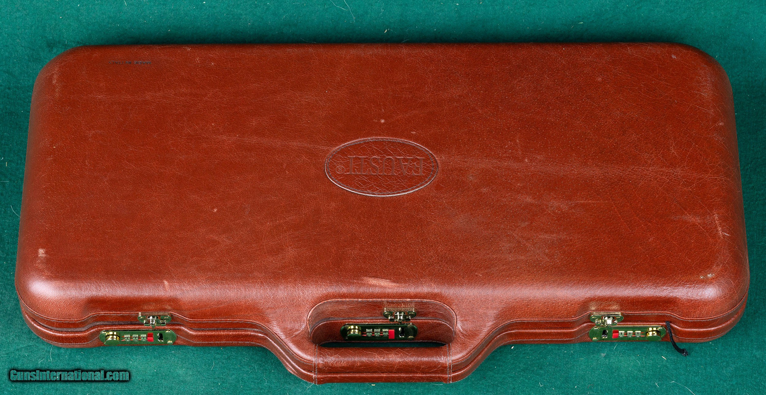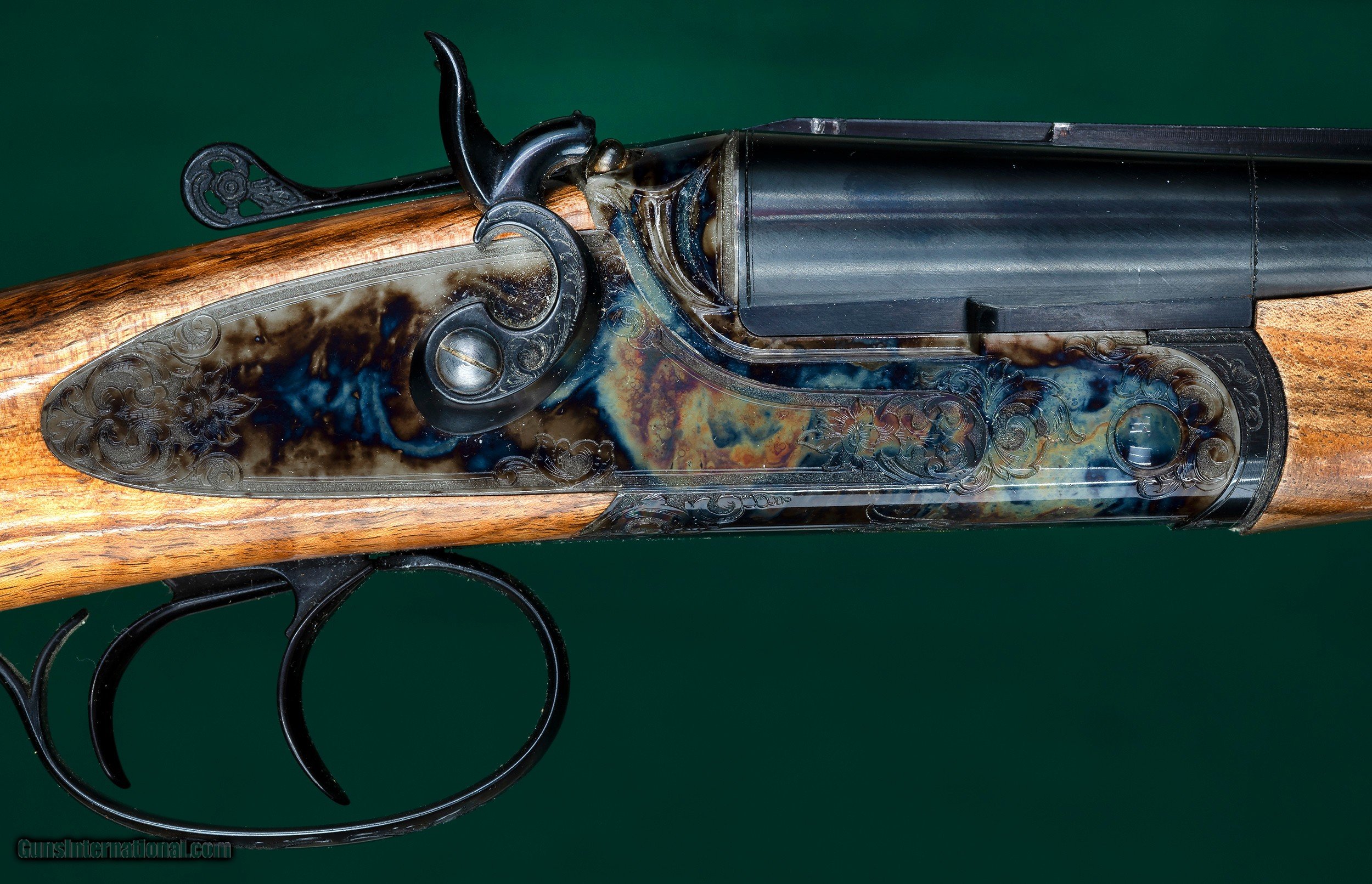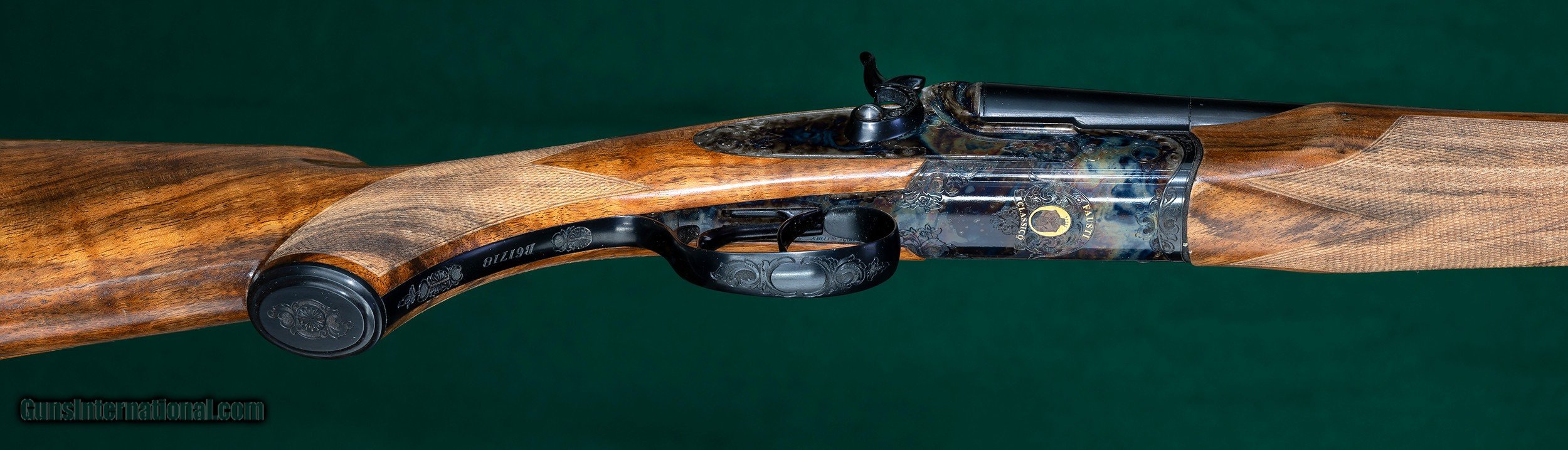 Description: 23 1/2 (60cm) SxS barrels with continuous top rib rising at the muzzle for a bright orange fibreoptic sight, lowering to smooth concave, then rising again to a matted quarter rib and one bright-enamel inlaid steel express sight. 13 7/8"pull from font trigger to thin unbranded black rubber recoil pad. Fully figured European walnut stocks with Anson-release schnabel-tipped beavertail forend, fine classic point-pattern checkering, steel-capped pistol grip, classic comb, and beaded pancake cheekpiece. Pinless, casehardened, bar-action sidelock scroll engraved by Muffolini, with sculptured fences, exposed rebounding hammers, pierced toplever and long-tang triggerguard. Maker's name and logo in gold on underside. Weight: 6lbs, 14 3/4oz with iron sights. Rib incorporates two barely discernable removable blanking plates that can be switched out for an inconspicuous rail-base for the makers' quick-detachable scope mount, with 30mm rings. Built 2019, retaining virtual all its original metal finishes, but with some light handling marks on the wood. In maker's leather-covered hard case with soft component-sleeves, manual and test target. SOLD Rifle Caliber: .243 Winchester Manufacturer: Fausti Model: Hammer Sidelock Double Rifle Serial Number: B61718 Barrel Length: 23 1/2 Condition: Excellent Barrels: Side-by-Side Action: Hammer sidelock Triggers: Double triggers Stock: Fully figured European Walnut Fore End: Anson-release schnabel-tipped beavertail forend Butt Pad: Thin black rubber recoil pad LOP: 13 7/8 Weight: Weight: 6lbs, 14 3/4oz with iron sights Case: In maker's leather-covered hard case Item Location: Livingston, Montana Proof:Nitro: Yes |