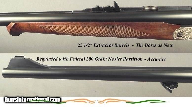 Description: #971299, Krieghoff 375 H&H Model Classic Big Five Factory Upgrade SxS Double Rifle with Deluxe Engraving, Deluxe Wood and Factory Installed Zeiss Scope on QD Pivot Mounts. Made in 1998 for Dr. Rese Gonzales with 23 1/2" Extractor barrels, 1/4 rib with 1 standing & 2 folding rear sights, Factory installed Quick Detachable Recknagel ERA Pivot Mounts, Rail mounted with a 1,25 - 4x24 Zeiss Diavari-ZM scope with a dot reticule, Rail scope mounting is the best system, Double triggers with the front articulated, Top tang cocking safety, 14 1/2" LOP over a 1/2" pad, It will go 15" LOP with a 1" pad, 11 lbs. 6 oz. with the scope, 10 lbs. without the scope, Upgraded wood with very nice color and contrast, Shadowline cheekpiece, Palm swell on the grip, Sling swivels, It has 98% coverage of very nice floral engraving with a Cape Buffalo, It has better engraving and more coverage than an average Classic, The barrel blue remains at 99%, The original stock finish is at 96%, The checkering at 100%, The bores are as new, It is cased in the factory deluxe leather trunk with the paperwork and targets. It was regulated with Federal with 300 grain Nosler Partition bullets and it shoots very well. SOLD Rifle Caliber: .375 H&H Magnum |