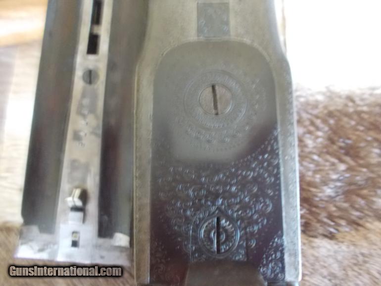 Description: Mahallion .475 No. 2 Ejector Double Rifle. This rifle was retailed by H. Mahillion of Brussels Belgium. It was made and proved in Liege Belgium, likely by Francotte. The 24 3/4" bores are bright and shiny with sharp square rifling. The rib extension has a blind locking cross bolt and the barrels have double under bites. Locks up tight as new. There are 1 standing, 3 folding sights in the quarter rib and a flip up night site. The action has full coverage very fine scroll engraving. The 14 3/4" LOP over a Kick-Ezz pad The stock and forearm are nicely figured with great finish and checkering. The forearm has a scratch forward of the checkering and just rear of the forearm release button. There is a screw with the edge broken on the right side of the action. The barrel bluing is excellent with very light freckling. All lettering and engraving is crisp. This is a dynamite dangerous game rifle in a great rare caliber. Supplied with brass and bullets to get you started. Weight 10 pounds and 3 ounces. . SOLD |