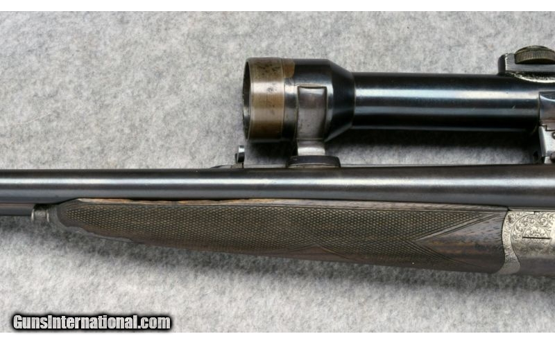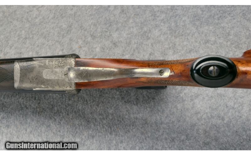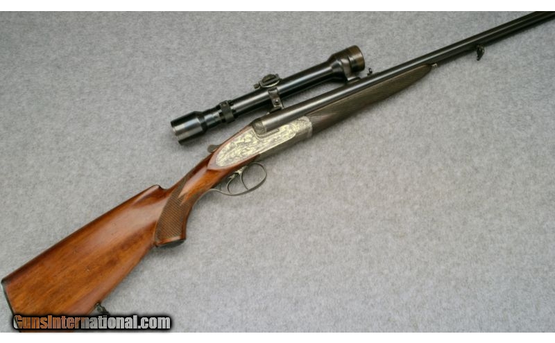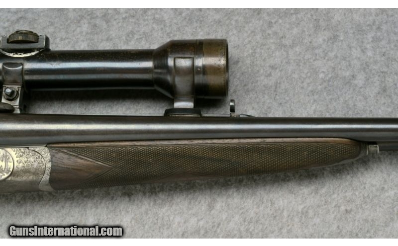 Description: Nice older Belgian double rifle that remains tight on face with excellent bores. Barrels show thinning finish with a bit of brown patina. Hensoldt optic is dark and not usable. Wood is free of cracks and buttstock has been lightly cleaned. Forend has a sliver missing on left side. Sideplates are beautifully engraved with wild boar on the left side and stags on the right. Shows European quality throughout!!! SOLD Manufacturer: S/N 53XX Caliber Info: .35 Win. Metal Condition: Good Wood Condition: Good Bore Condition: Excellent Barrels: 25 3/4 with Extractors Triggers: Double Stock: Checkered Walnut Pistol with Black Cap Stock Dimensions: 13 3/4" LOP Fore End: Checkered Walnut Splinter Butt Pad: Black Serrated Weight: 8 1/2 LB Sights: Bead Front - Notch Rear - Hensoldt Optic in Claw Mounts Item Location: Wheeling, WV |
