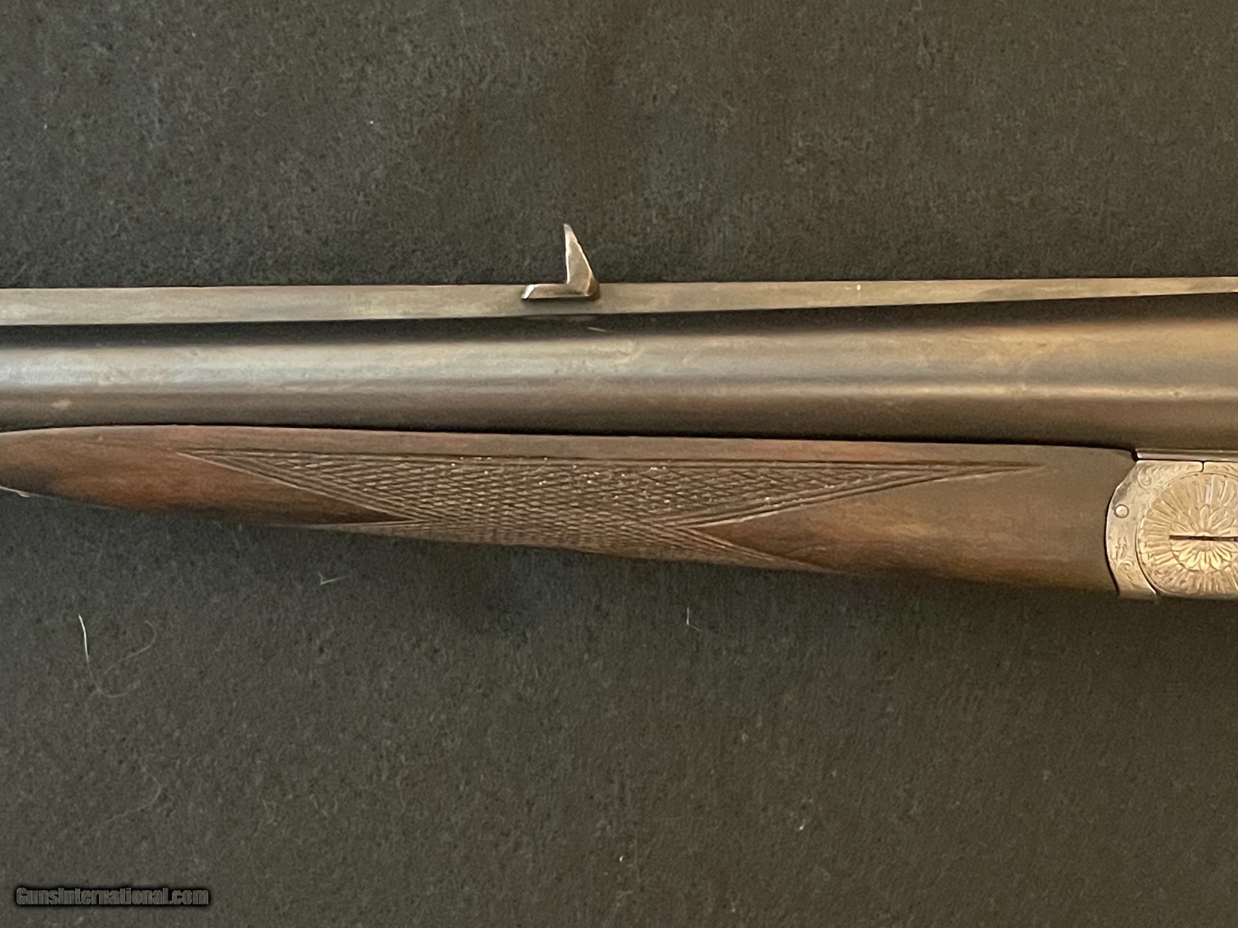 Description: Victor Sarquesta double rifle Special Luxe 475 # 2 3 1/2” N.E. Description: Victor Sarasqueta Model 13 Luxe full side lock double rifle case hardened Holland Style Action .,fine Rose and scroll engraved; double triggers, automatic ejectors, pistol gripped, Monte Carlo cheek piece, brushed firing pins; engine turned interior of action; with raised and filed rib with iron sights; blue and case hardened finish, checkered wood stocks showing straight grain selected for strength; the rifle measures 41 1/2 ” overall; 23-5/8”barrels, of heavy weight; Silvers Style English rubber recoil pad added; end stock measures 15-1/4” to the end of the pad. The condition is fine to near excellent, near excellent overall with fine bores. One of 3 ordered by Juan Carlos King of Spain in 1953 confirmed at Intervencion de Armas, España 10-1/2 pounds overall weight. Included Ammo 9 boxes of 5 Solids and Softs and 4 Boxes of spent Brass cases. Price: $19500 SOLD Rifle Caliber: .475 No 2 Nitro Express Manufacturer: Victor Sarasqueta Model: 13 Luxe Barrel Length: 23 5/8” Bore: Bright Ejectors: Automatic Condition: Excellent Metal Condition: Excellent Wood Condition: Excellent Bore Condition: Excellent Barrel Type: Heavy Action: Holland Triggers: Double Articulated Stock: Pistol Grip Butt Pad: Silvers Style English Pad Rib: Full hand cut rib Finish: Case Hardened Action Weight: 10lbs 8 oz Sights: Open Express One Leaf Manufacture Date: 1953 Extras: 9 Boxes of Kynoch Ammo Solíd and Softs plus empty brass Case: Leather case available $800 additional. Item Location: Florida Proof:Nitro: Yes |