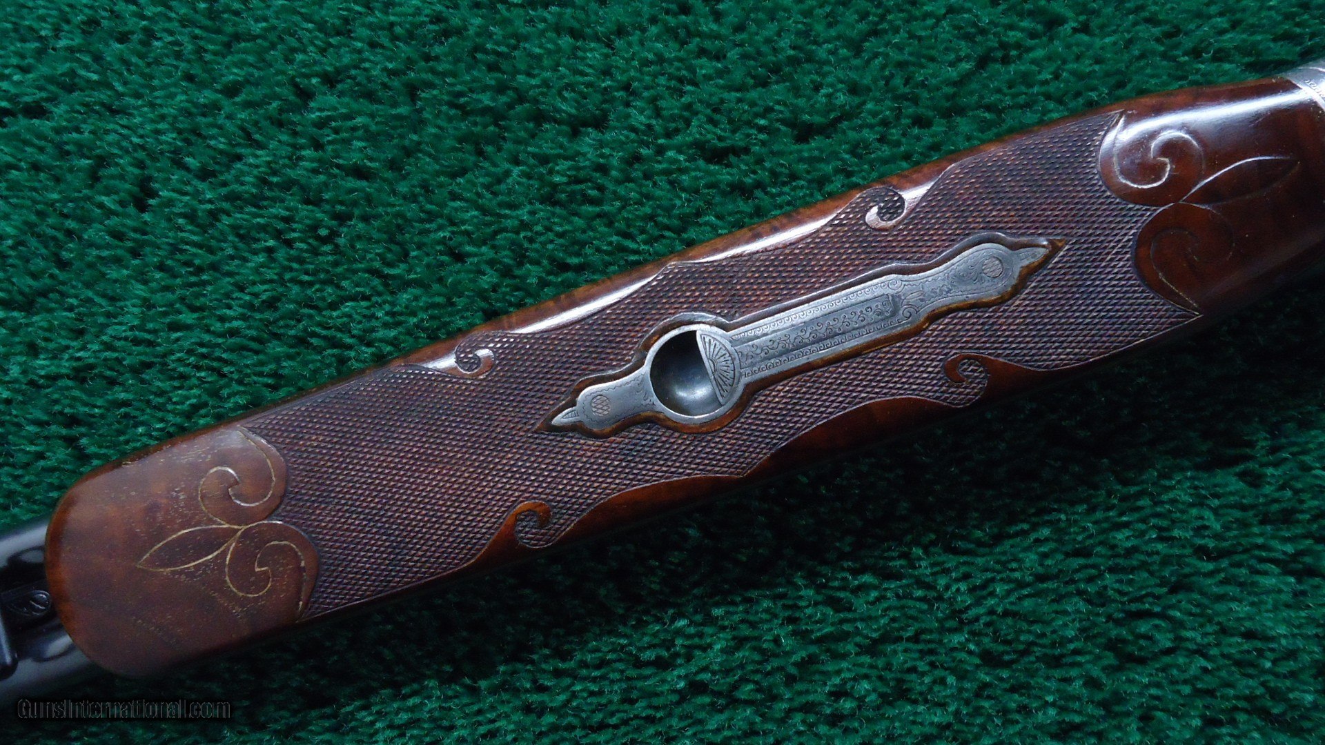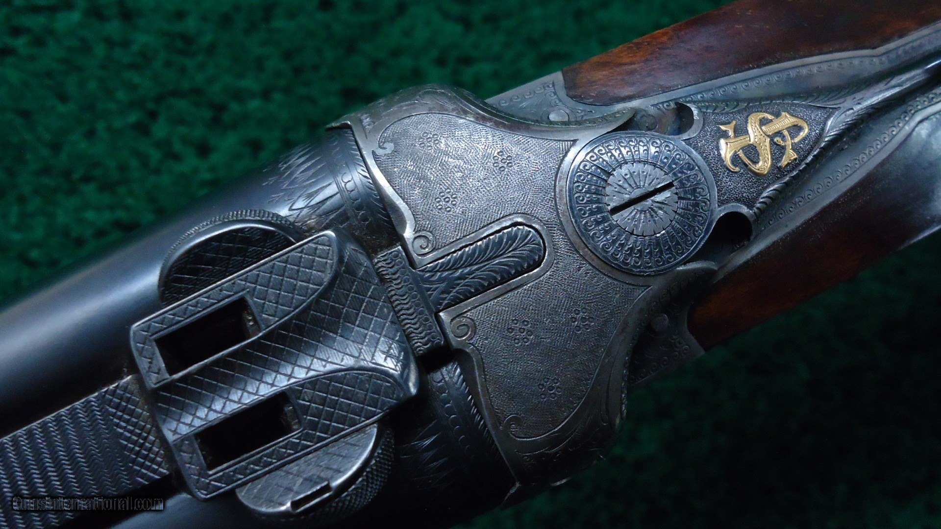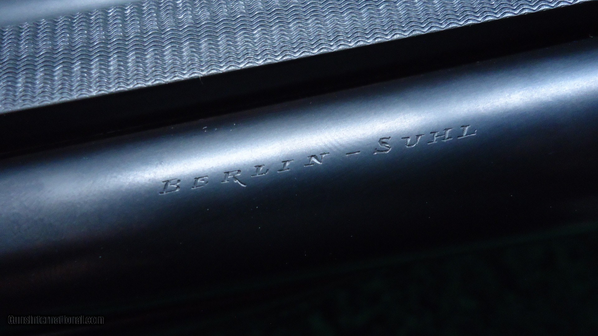 Description: Double rifle made by H. Barella of Berlin & Suhl features 24-1/2 inch round barrels with shiny excellent bores chambered in 9.3X74R caliber . Barrels retain most all of their rust blue finish. Sights include German silver bead front atop a matted rib and single express rear. Quick detach claw bases are mounted on the raised rear of the rib. A Schmidt & Bender Biebertal Wetzlar 1-1/4 -x- 4X variable scope duplex reticle. The color case hardened frame has toned to a silver/gray patina with some good traces of color in the protected areas. There is also some nice scroll and border engraving with about 75% coverage. The top of the opening lever has gold inlaid initials "JS". The walnut checkered round knob pistolgrip buttstock is in very nice condition with only minor handling mars. Nicely figured with cheekpiece. Forend is also in good condition with nice checkering.as well. LOP is 14-1/2 to the end of the red rubber buttpad. Mechanical function is fine. Greener crossbolt. This is a very fine German double rifle that is ready for your next hunt. Leroy Merz Antique Firearms specializes in antique and vintage Winchesters and other fine American firearms. Since 1965 Mr. Merz has taken part in the world of firearms and has been a contributor to many well known reference books. We have hundreds of additional guns in every price range at our home online. Search for Merz Antiques in google. SOLD Curio/Relic: Yes Rifle Caliber: 9.3x74mmR |